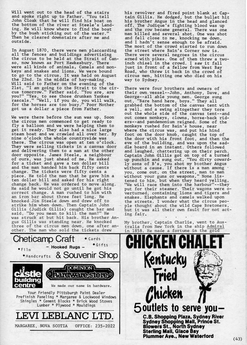 Published by Ronald Caplan on 1983/6/1 (271 reads)Will went out to the head of the stairs and spoke right up to Father. "You tell John Cloak that he will find his boat on the bottom of the river at Steele's Land? ing. He will know where to find the boat by the bush sticking out of the water." Then he cleared downstairs after me and outside. In August 1870, there were men placcarding all the fences and buildings advertising the circus to be held at the Strait of Can- so, now known as Port Hawkesbury. There were all kinds of animals. Camels and mon? keys and snakes and lions. We were bound to go to the circus. It was held on August the 22nd. In the middle of hay-making. Will said to Father on the evening of the 21st, "I am going to the Strait to the cir? cus tomorrow." Father said, "You are, are you?" "Yes, to see those drunken Yankee rascals." "Well, if you do, you will walk, for the horses are too busy." Poor Mother got us a dollar a piece from Father. We were there before the sun was up. Soon the circus men commenced to get ready to fly a balloon and we were helping them to get it ready. They also had a nice large steam boat and we crawled all over her. By nine o'clock the whole countryside was there. The circus was open at ten o'clock. They were selling tickets in a canvas door and delivering them to a man at the other door opposite. James Steele, a neighbour of ours, was just ahead of me. He asked for a ticket and gave a ten dollar bill and the man handed him back fifty cents change. The tickets were fifty cents a piece. He told the man that he gave him a ten dollar bill and asked for his right change back. He was ordered to move along. He said he would not go until he got his correct change. A man rushed to him with an iron bar about three feet long. He knocked Jim Steele down and drew off to strike him when down. Then Captain John Gillis (Judick Gillis) caught the bar and said, "Do you mean to kill the man?" He was struck at but hit back. His brother An? gus Gillis was standing near. He knocked three of the circus men down, one after an? other. The man who sold the tickets drew his revolver and fired point blank at Cap? tain Gillis. He dodged, but the bullet hit his brother Angus in the head and glanced off. The Judique's fighting blood was up and the row became general. There was one man killed and several shot. One was shot and fell close to me, knocking me down, and I hadn't sense enough to be afraid. The most of the crowd started to run down the street where Bain's Corner now is. There were several negroes in the circus armed with pikes. One of them threw a two- inch chisel in the crowd. I saw it fall just in front of a fellow from West Bay Road, who threw it back in the crowd of circus men, hitting one who died on his way to Sydney. There were four brothers and owners of their own vessel--John, Anthony, Dave, and George--all able young men. George sung out, "Bare hand here, boys." They all grabbed the bottom of the canvas tent with a yell, and a swing altogether they tore out the whole side of the canvas tent--and out comes monkeys, clowns, horse-back rid- ers--and pandemonium reigned. Some of the monkeys rushed for Bain's house, near where the circus was, and put his hind foot on the door knob, caught the top of the door with his front foot, and then the eve of the building, and was upon the sad? dle board in an instant. Others followed and laughed, chattering up on their perch. Captain John Gillis got on top of a turned up punchin and sung out, "You dirty coward? ly sons of B's, you shot my brother Angus without a cause. If there is a man among • you, come out, on the street, man to man without your guns or weapons." None lis? tened to him, but when they heard yelling, "VJe will race them into the harbour"--they put for their steamer. Their wagons were o- verturned, containing lions and tigers and snakes. Elephants and camels walked upon the streets. I wonder what the circus peo? ple thought about the wild Cape Bretoners, but it was all their own fault for not act? ing fair. My brother. Captain Charlie, went to Aus? tralia from New York in the ship Admiral in 1858. He made a fortune in the gold • Cards Gifts Cheticamp Craft Hooked Rugs ~ & Souvenir Shop Film • Handcrafts We made our name in hardware. Your Friendly Pittsburgh Paint Dealer Prefinish Paneling * Margaree & Lockwood Windows Shingles * Cement Blocks * Brick Wood Stoves Lumber * Plywood * Mouldings LEVI LEBLANC LTD. MARGAREE, NOVA SCOTIA OFFICE: 235-2022 CHICKEN CHALET fried Soutlets to serve you- C.B. Shopping Plaza, Sydney River Sydney Shopping Mall, Prince St. Blowers St., North Sydney Sterling IMall, Glace Bay Piummer Aye., New Waterford (43)