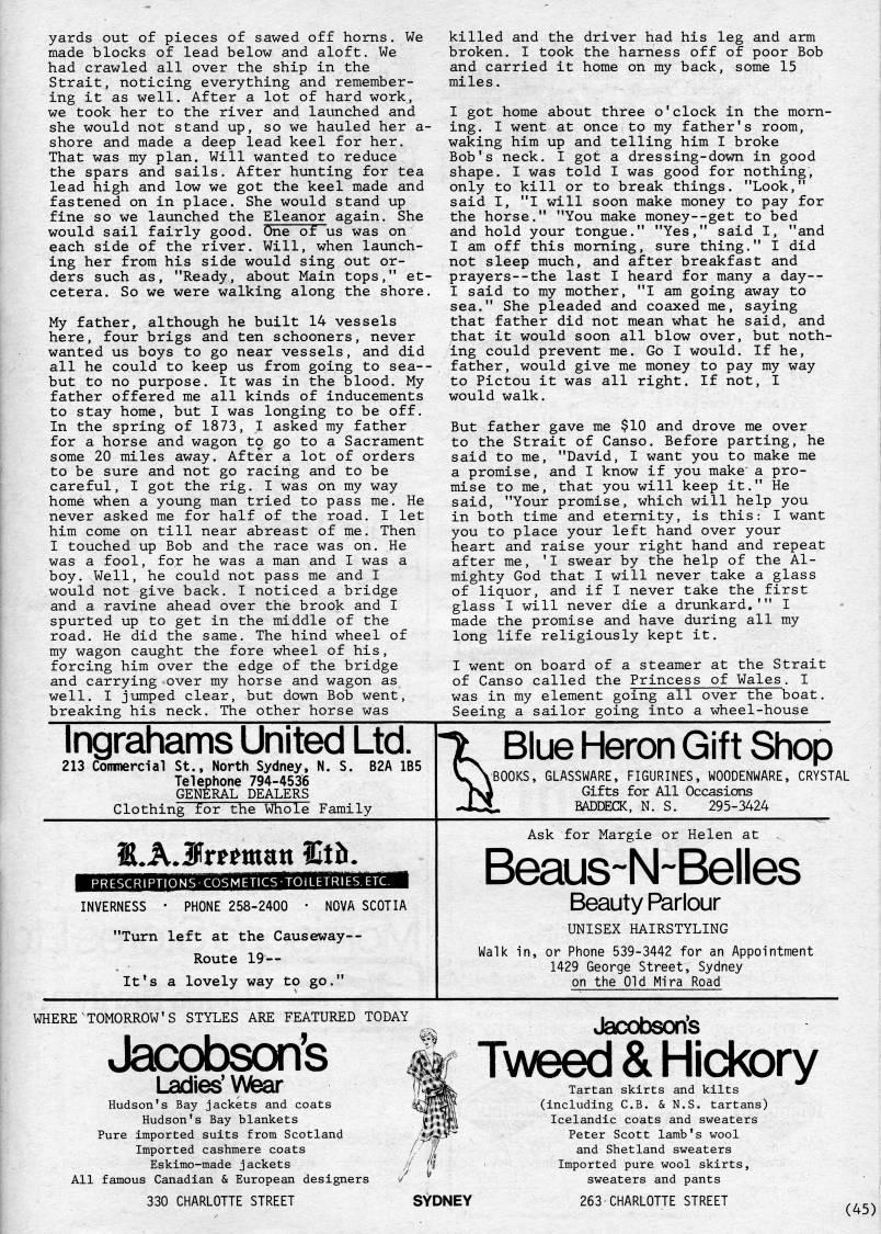 Published by Ronald Caplan on 1983/6/1 (249 reads)yards out of pieces of sawed off horns. We made blocks of lead below and aloft. We had crawled all over the ship in the Strait, noticing everything and remember? ing it as well. After a lot of hard work, we took her to the river and launched and she would not stand up, so we hauled her a- shore and made a deep lead keel for her. That was my plan. Will wanted to reduce the spars and sails. After hunting for tea lead high and low we got the keel made and fastened on in place. She would stand up fine so we launched the Eleanor again. She would sail fairly good. One of us was on each side of the river. Will, when launch? ing her from his side would sing out or? ders such as, "Ready, about Main tops," et? cetera. So we were walking along the shore. My father, although he built 14 vessels here, four brigs and ten schooners, never wanted us boys to go near vessels, and did all he could to keep us from going to sea-- but to no purpose. It was in the blood. My father offered me all kinds of inducements to stay home, but I was longing to be off. In the spring of 1873, I asked my father for a horse and wagon to go to a Sacrament some 20 miles away. After a lot of orders to be sure and not go racing and to be careful, I got the rig. I was on my way home when a young man tried to pass me. He never asked me for half of the road. I let him come on till near abreast of me. Then I touched up Bob and the race was on. He was a fool, for he was a man and I was a boy. Well, he could not pass me and I would not give back. I noticed a bridge and a ravine ahead over the brook and I spurted up to get in the middle of the road. He did the same. The hind wheel of my wagon caught the fore wheel of his, forcing him over the edge of the bridge and carrying over my horse and wagon as well. I jumped clear, but down Bob went, breaking his neck. The other horse was Ingrahams United Ltd. 213 Conmercial St., North Sydney, N. S. B2A 1B5 Telephone 794-4536 GENERAL DEALERS Clothing for the Whole Family killed and the driver had his leg and arm broken. I took the harness off of poor Bob and carried it home on my back, some 15 miles. I got home about three o'clock in the morn? ing. I went at once to my father's room, waking him up and telling him I broke Bob's neck. I got a dressing-down in good shape. I was told I was good for nothing, only to kill or to break things. "Look," said I, "I will soon make money to pay for the horse." "You make money--get to bed and hold your tongue." "Yes," said I, "and I am off this morning, sure thing." I did not sleep much, and after breakfast and prayers--the last I heard for many a day-- I said to my mother, "I am going away to sea." She pleaded and coaxed me, saying that father did not mean what he said, and that it would soon all blow over, but noth? ing could prevent me. Go I would. If he, father, would give me money to pay my way to Pictou it was all right. If not, I would walk. But father gave me $10 and drove me over to the Strait of Canso. Before parting, he said to me, "David, I want you to make me a promise, and I know if you make a pro? mise to me, that you will keep it." He said, "Your promise, which will help you in both time and eternity, is this: I want you to place your left hand over your heart and raise your right hand and repeat after me, 'I swear by the help of the Al? mighty God that I will never take a glass of liquor, and if I never take the first glass I will never die a drunkard.'" I made the promise and have during all my long life religiously kept it. I went on board of a steamer at the Strait of Canso called the Princess of Wales. I was in my element going all over the boat. Seeing a sailor going into a wheel-house 7. Blue Heron Gift Shop VJBOOKS, GLASSWARE, FIGURINES, WOOOENWARE, CRYSTA BOOKS, GLASSWARE, FIGURINES, WOOOENWARE, CRYSTAL Gifts for All Occasions BADDECK, N. S. 295-3424 lBi.K3ttimun Slth- INVERNESS PHONE 258-2400 NOVA SCOTIA "Turn left at the Causeway • Route 19 • It*s a lovely way to go." Ask for Margie or Helen at Beaus~N~Belles Beauty Parlour UNISEX HAIRSTYLING Walk in, or Phone 539-3442 for an Appointment 1429 George Street, Sydney on the Old Mira Road WHERE'TOMORROW'S STYLES ARE FEATURED TODAY Jacobson's ' Ladies' Wear Hudson's Bay jackets and coats Hudson's Bay blankets Pure imported suits from Scotland Imported cashmere coats Eskimo-made jackets All famous Canadian & European designers 330 CHARLOTTE STREET SYDNEY Jacobson's TA/eed & Hickory Tartan skirts and kilts (including C.B. & N.S. tartans) Icelandic coats and sweaters Peter Scott lamb's wool and Shetland sweaters Imported pure wool skirts, sweaters and pants 263 CHARLOTTE STREET (45)