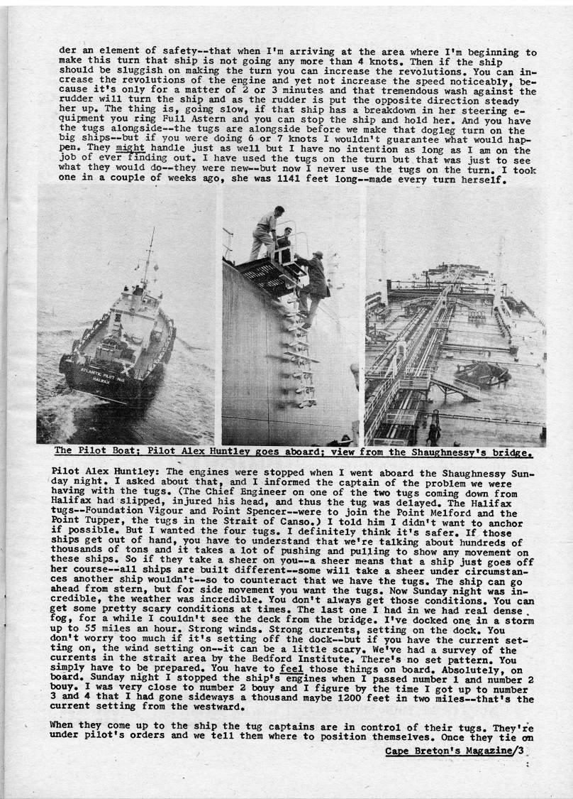 Published by Ronald Caplan on 1973/12/1 (671 reads)der an element of safety • that when I'm arriving at the area where I'm beginning to make this turn that ship is not going any more than 4 knots. Then if the ship should be sluggish on making the turn you can increase the revolutions. You can in? crease the revolutions of the engine and yet not increase the speed noticeably, be? cause it's only for a matter of 2 or 3 minutes and that tremendous wash against the rudder will turn the ship and as the rudder is put the opposite direction steady her up. The thing is, going slow, if that ship has a breakdown in her steering e- quipment you rii' Full Astern and you can stop the ship and hold her. And you have the tugs alongside • the tugs are alongside before vre make that dogleg turn on the big ships • but if you vere doing 6 or 7 knots I wouldn't guarantee what would hap? pen. They might handle just as x rell but I have no intention as long as I am on the job of ever finding out. I have used the tugs on the turn but that was just to see what they would do • they were new • but now I never use the tugs on the turn. I took one in a couple of weeks ago, she was 1141 feet long • made every turn herself. The Pilot Boat; Pilot Alex Huntley goes aboard; view from the Shaughnessy's bridge. Pilot Alex Huntley: The engines were stopped when I went aboard the Shaughnessy Sun? day night. I asked about that, and I informed the captain of the problem we were having with the tugs. (The Chief Engineer on one of the two tugs coming down from Halifax had slipped, injured his head, and thus the tug was delayed. The Halifax tugs • Foundation Vigour and Point Spencer • were to join the Point Melford and the Point Tupper, the tugs in the Strait of Canso.) I told him I didn't want to anchor if possible. But I wanted the four tugs. I definitely think it's safer. If those ships get out of hand, you have to understand that we're talking about hundreds of thousands of tons and it takes a lot of pushing and pulling to show any moveraent on these ships. So if they take a sheer on you • a sheer means that a ship just goes off her course--all ships are built different • some will take a sheer under circumstan? ces another ship wouldn't • so to counteract that we have the tugs. The ship can go ahead from stern, but for side movement you want the tugs. Now Sunday night was in? credible, the weather was incredible. You don't always get those conditions. You can get some pretty scary conditions at times. The last one I had in we had real dense . fog, for a while I couldn't see the deck from the bridge. I've docked one. in a storm up to 55 miles an hour. Strong winds. Strong currents, setting on the dock. You don't worry too much if it's setting off the dock • but if you have the current set? ting on, the wind setting on • it can be a little scary. We've had a survey of the currents in the strait area by the Bedford Institute. There's no set pattern. You simply have to be prepared. You have to feel those things on board. Absolutely, on board. Sunday night I stopped the ship's engines when I passed number 1 and number 2 bouy. I was very close to number 2 bouy and I figure by the time I got up to number 3 and 4 that I had gone sideways a thousand maybe 1200 feet in two miles • that's the current setting from the westward. When they come up to the ship the tug captains are in control of their tugs. They're under pilot's orders and we tell them where to position themselves. Once they tie on Cape Breton's Magazine/3