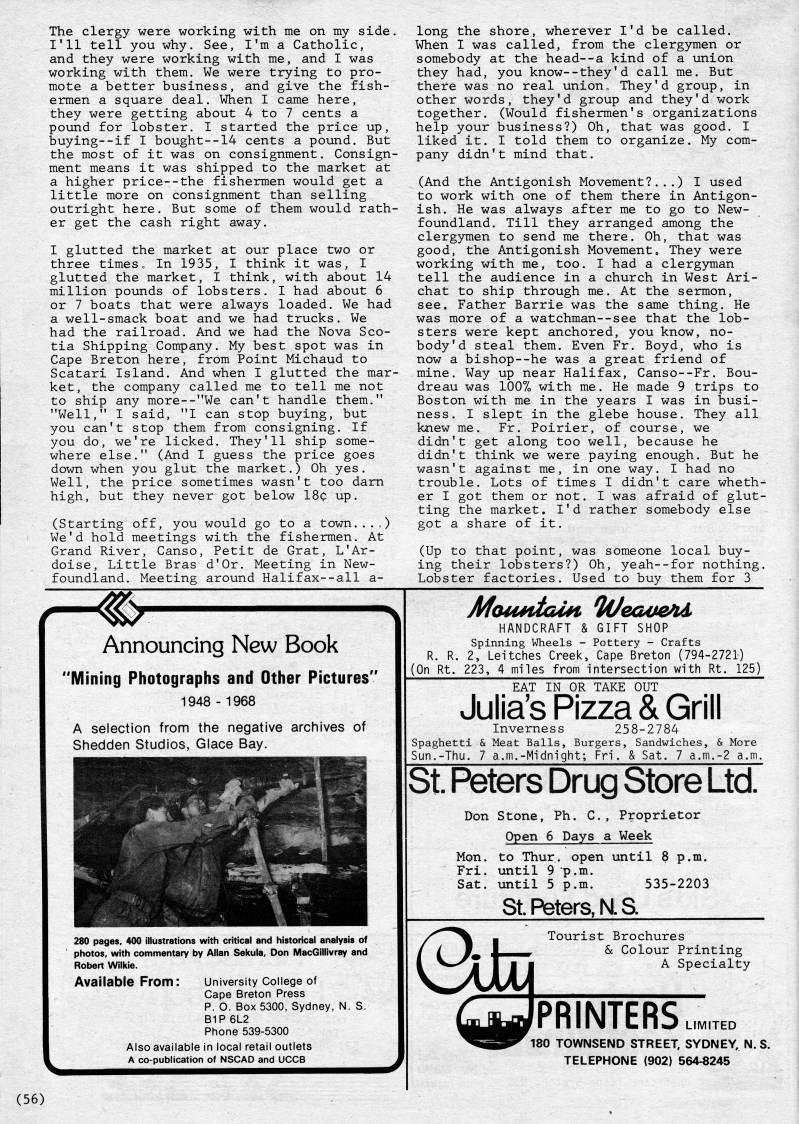 Published by Ronald Caplan on 1983/6/1 (179 reads)The clergy were working with me on my side. I'll tell you why. See, I'm a Catholic, and they were working with me, and I was working with them. We were trying to pro? mote a better business, and give the fish? ermen a square deal. When I came here, they were getting about 4 to 7 cents a pound for lobster. I started the price up, buying--if I bought--14 cents a pound. But the most of it was on consignment. Consign? ment means it was shipped to the market at a higher price--the fishermen would get a little more on consignment than selling outright here. But some of them would rath? er get the cash right away. I glutted the market at our place two or three times. In 1935, I think it was, I glutted the market, I think, with about 14 million pounds of lobsters. I had about 6 or 7 boats that were always loaded. We had a well-smack boat and we had trucks. We had the railroad. And we had the Nova Sco? tia Shipping Company. My best spot was in Cape Breton here, from Point Michaud to Scatari Island. And when I glutted the mar? ket, the company called me to tell me not to ship any more--"We can't handle them." "Well," I said, "I can stop buying, but you can't stop them from consigning. If you do, we're licked. They'll ship some? where else." (And I guess the price goes down when you glut the market.) Oh yes. Well, the price sometimes wasn't too darn high, but they never got below 18c up. (Starting off, you would go to a town....) We'd hold meetings with the fishermen. At Grand River, Canso, Petit de Grat, L'Ar? doise, Little Bras d'Or. Meeting in New? foundland. Meeting around Halifax--all a- long the shore, wherever I'd be called. When I was called, from the clergymen or somebody at the head--a kind of a union they had, you know--they'd call me. But there was no real union. They'd group, in other words, they'd group and they'd work together. (Would fishermen's organizations help your business?) Oh, that was good. I liked it. I told them to organize. My com? pany didn't mind that. (And the Antigonish Movement?...) I used to work with one of them there in Antigon? ish. He was always after me to go to New? foundland. Till they arranged among the clergymen to send me there. Oh, that was good, the Antigonish Movement. They were working with me, too. I had a clerg3niian tell the audience in a church in West Ari? chat to ship through me. At the sermon, see. Father Barrie was the same thing. He was more of a watchman--see that the lob? sters were kept anchored, you know, no? body 'd steal them. Even Fr. Boyd, who is now a bishop--he was a great friend of mine. Way up near Halifax, Canso--Fr. Bou? dreau was 1007o with me. He made 9 trips to Boston with me in the years I was in busi? ness. I slept in the glebe house. They all knew me. Fr. Poirier, of course, we didn't get along too well, because he didn't think we were paying enough. But he wasn't against me, in one way. I had no trouble. Lots of times I didn't care wheth? er I got them or not. I was afraid of glut? ting the market, I'd rather somebody else got a share of it. (Up to that point, was someone local buy? ing their lobsters?) Oh, yeah--for nothing. Lobster factories. Used to buy them for 3 /-'r Announcing New Book "Mining Photographs and Other Pictures" 1948-1968 A selection from the negative archives of Shedden Studios, Glace Bay. 280 pages, 400 illustrations with critical and historical analysis of photos, with commentary by Allan Sekula, Don MacGillivray and Robert Wilkie. Available From: university College of Cape Breton Press P. O. Box 5300, Sydney, N. S. B1P 6L2 Phone 539-5300 Also available in local retail outlets A co-publication of NSCAD and UCCB (56) HANDCRAFT & GIFT SHOP Spinning Wheels - Pottery - Crafts R. R. 2, Leitches Creek, Cape Breton (794-2721) ;0n Rt. 223, 4 miles from intersection with Rt. 125) EAT IN OR TAKE OUT Julia's Pizza & Grill Inverness 258-2784 Spaghetti & Meat Balls, Burgers, Sandwiches, & More Sun.-Thu. 7 a.m.-Midnight; Fri. & Sat. 7 a.m.-2 a.m. St. Peters Drug Store Ltd. Don Stone, Ph. C., Proprietor Open 6 Days a Week Mon. to Thur. open until 8 p.m. Fri. until 9 p.m. Sat. until 5 p.m. 535-2203 St.F'ters,N.S. Tourist Brochures & Colour Printing A Specialty PRINTERS 180 TOWNSEND STREET, SYDNEY. N. S. TELEPHONE (902) 564-8245