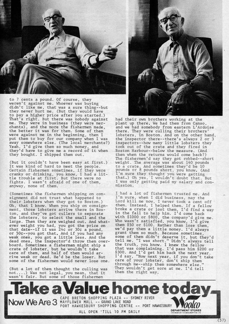 Published by Ronald Caplan on 1983/6/1 (177 reads)to 7 cents a pound. Of course, they weren't against me. Whoever was buying didn't like me, that was a sure thing--but they never hurt me. (But they would have to pay a higher price after you started.) That's right. But there was nobody against me. They were in business (they were mer? chants) , and the more the fishermen made, the better it was for them. Some of them were against me in the beginning, then I put them to buy for our company when I was away somewhere else. (The local merchants?) Yeah. I'd give them so much money, and they'd have to give me a record of it when they bought. I shipped them out. (But it couldn't have been easy at first.) It was kind of hard to meet the people. Certain fishermen sometimes, if they were cranky or drinking, you know, I had a lit? tle trouble at first. But there were no fights. I wasn't afraid of one of them, anyway, none of them. (Sometimes the fishermen shipping on con? signment did not trust what happened to their lobsters when they got to Boston.) Oh, that I know. When you ship on consign? ment, those lobsters arrive there in Bos? ton, and they've got cullers to separate the lobsters, to select the small and the large. Then they are weighed out. And what? ever weight you had, you got the price on that date--if it was 24c or 30c a pound, or 50C--you got that. And if you had any weak ones, you got a little less. And the dead ones, the inspector''d throw them over? board. Sometimes a fisherman might ship a crate of lobster, but he wouldn't take care of them, and half of them would ar? rive weak or dead. He'd be the loser. But some of the fishermen would never lose one. (But a lot of them thought the culling was not....) Was not legal, you mean, that it wasn't fair. But some of those fishermen had their own brothers working at the plant up there. We had them from Canso, and we had somebody from eastern L'Ardoise there. They were culling their brothers' lobsters, in Boston, And on the other hand, the inspector there--there's always 2 or 3 inspectors--how many little lobsters they took out of the crate and they fired in Boston Harbour--below the measure. (And then when the returns would come back?) The fishermen'd say they got robbed--short weight. The average was about 140 pounds to a crate. And sometimes they'd be 10 pounds or 8 pounds short, you know. (And I'm sure they thought you were getting that.) Oh yes,'I wouldn't doubt that. But I was only getting paid my salary and com? mission. I had a lot of fishermen trusted me. And I'm sure, when I did business, may the Lord kill me now, I never took a cent off them. Instead, I helped them. If a fellow broke a crate or lost them, I'd find a way in the fall to help him. I'd come back with $1000 or $800, the company'd give me. Who wasn't satisfied, you know, I'd give them $50 or $100. Rather than lose them, we'd pay them a little money. I'd always grant them so much. Because sometimes, some of them didn't deserve it, but they'd tell me, "I was short." Didn't always tell the truth, you know. I knew the fellow that was complaining. I'd pass him $200 or $300. And I'd get him back the next year. I'd say, "Now next year, if you don't take care of your lobster, don't ship them through me--ship them somewhere else." They wouldn't get sore at me. I'd tell them the right way. I .Take aValue home today- .... ' CAPE BRETON SHOPPING PLAZA -- SYDNEY RIVER -'.A 0'' I Now We Are 3 Mayflower mall -- grand lake road M'nnlrn I iNV'vv vvw#-Aiv'' pQj'.j. HAWKESBURY SHOPPING CENTRE -- PORT HAWKESBURY WJUUllU I ALL OPEN 'TILL 10 PM DAILY '.'.'oT'!5ilTJ.TPc'F,! J (57)