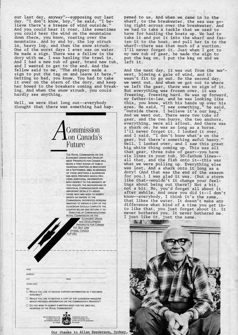 our last day, an37way"--supposing our last day. "I don't know, boy," he said, "I be? lieve there's a breeze of wind outside." And you could hear it roar, like sometimes you could hear the wind on the mountains down there, you know, roaring over the mountains. And by and by, the lop struck in, heavy lop, and then the snow struck. One of the worst days I ever was on water. He made a sign. There was a fellow in the dory with me. I was hauling the trawl in. And I had a new tub of gear, brand new tub, and I wanted to get to the end. And the fellow said to me, "The skipper made a sign to put the tag on and leave it here." Getting so bad, you know. You had to take it over on the stern of the dory, and keep her bowed to the breakers coming and break? ing. And when the snow struck, you could hardly see anything. Well, we were that long out--everybody thought that there was something had hap- A Commission on Canada's Future The Royal Commission on the Economic Union and Develop? ment Prospects for Canada will begin a first round of public hearings starting in Vancouver on 6 September, isss. In advance OF these meetings a guidebook HAS been prepared WHICH PRO? vides additional information with respect to the mandate of this inquiry, the background of individual commissioners and important details to assist those who may wish to submit briefs or papers to the Commission. Interested persons wanting to obtain a copy of the guidebook should complete the coupon below and return it to: Director of Communications Royal Commission on the Economic Union AND Development Prospects for Canada P.O. Box 1268 Ottawa, Canada KlP 5R3 pened to us. And when we came in to the wharf, to the breakwater, the sea was go? ing right across over the breakwater. And we had to take a tackle that we used to have for hauling the boats up. We had to take it and put it into the wharf and fas? ten it to the boat, and pull her in to the wharf--there was that much of a suction. I'll never forget it. Just when I got to my new tub of gear, he made the sign to put the keg on. I put the keg on and we left it. And the next day, it was out from the nor'- west, blowing a gale of wind, and it wasn't fit to go out. So the second day, we went out. And when we got out to where we left the gear, there was no sign of it. But everything was frozen over, it was freezing, freezing hard. He was up forward, my father-in-law, and he was looking like this, you know, with his hands up over his eyes. He said, "I see something," he said, "outside there. I believe it's our keg." And we went out. There were two tubs of gear, and the two buoys, the two anchors, everything, were all afloat. And there was a shark on; he was as long as a horse. I'll never forget it, I looked it over, and I said, "I don't know what's on the gear, but there's something awful heavy," Well, I looked over, and I saw this great big white thing coming up. This was all that gear, three tubs of gear--you have six lines in your tub, 50-fathom lines-- all that, and the fish onto it--this was what we were pulling up. Everything else was lost. And a shark onto it long as a dory! (And that was the end of the season for you.) I was glad it was. (But a storm like that--wouldn't it change your feel? ings about being out there?) Not a bit, not a bit. No, you'd forget all about it after awhile. And once you did it--I don't know--everybody, I think it's the same, that likes the water. It doesn't make any difference what kind of a time you get in? to like that, you just forget about it. It never bothered you. It never bothered me. I just like it, just the same, .4 J Our thanks to Allan Henderson, Sydney,