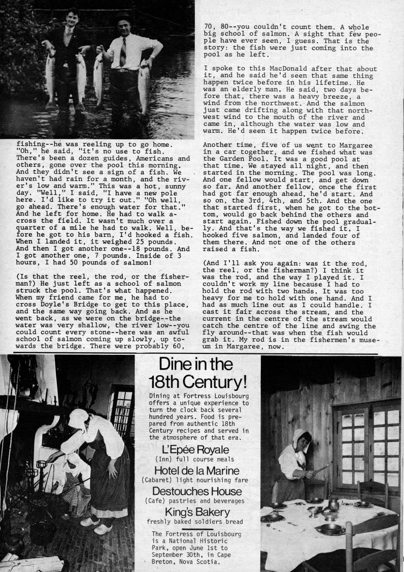 Published by Ronald Caplan on 1983/8/1 (310 reads)fishing--he was reeling up to go home. "Oh," he said, "it's no use to fish. There's been a dozen guides, Americans and others, gone over the pool this morning. And they didn't see a sign of a fish. We haven't had rain for a month, and the riv? er's low and warm." This was a hot, sunny day. "Well," I said, "I have a new pole here. I'd like to try it out." "Oh well, go ahead. There's enough water for that." And he left for home. He had to walk a- cross the field. It wasn't much over a quarter of a mile he had to walk. Well, be? fore he got to his bam, I'd hooked a fish. When I landed it, it weighed 25 pounds. And then I got another one--18 pounds. And I got another one, 7 pounds. Inside of 3 hours, I had 50 pounds of salmon! (Is that the reel, the rod, or the fisher? man?) He just left as a school of salmon struck the pool. That's what happened. When my friend came for me, he had to cross Doyle's Bridge to get to this place, and the same way going back. And as he went back, as we were on the bridge--the water was very shallow, the river low--you could count every stone--here was an awful school of salmon coming up slowly, up to? wards the bridge. There were probably 60, 70, 80--you couldn't count them. A whole big school of salmon. A sight that few peo? ple have ever seen, I guess. That is the story: the fish were just coming into the pool as he left. I spoke to this MacDonald after that about it, and he said he'd seen that same thing happen twice before in his lifetime. He was an elderly man. He said, two days be? fore that, there was a heavy breeze, a wind from the northwest. And the salmon just came drifting along with that north? west wind to the mouth of the river and came in, although the water was low and warm. He'd seen it happen twice before. Another time, five of us went to Margaree in a car together, and we fished what was the Garden Pool. It was a good pool at that time. We stayed all night, and then started in the morning. The pool was long. And one fellow would start, and get down so far. And another fellow, once the first had got far enough ahead, he'd start. And so on, the 3rd, 4th, and 5th. And the one that started first, when he got to the bot? tom, would go back behind the others and start again. Fished down the pool gradual? ly. And that's the way we fished it. I hooked five salmon, and landed four of them there. And not one of the others raised a fish. (And I'll ask you again: was it the rod, the reel, or the fisherman?) I think it was the rod, and the way I played it. I couldn't work my line because I had to hold the rod with two hands. It was too heavy for me to hold with one hand. And I had as much line out as I could handle. I cast it fair across the stream, and the current in the centre of the stream would catch the centre of the line and swing the fly around--that was when the fish would grab it. My rod is in the fishermen's muse? um in Margaree, now. Dine in the 18th Century! Dining at Fortress Louisbourg offers a unique experience to turn the clock back several hundred years. Food is pre? pared from authentic 18th Century recipes and served in the atmosphere of that era. L'Epee Royale (Inn) full course meals Hotel de la Marine (Cabaret) light nourishing fare Destouches House (Cafe) pastries and beverages King's Bakery freshly baked soldiers bread The Fortress of Louisbourg is a National Historic Park, open June 1st to September 30th, in Cape • Breton, Nova Scotia.