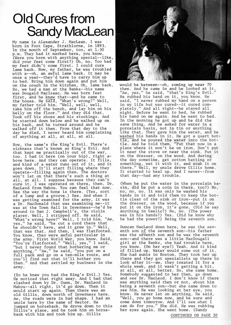 Published by Ronald Caplan on 1983/12/1 (826 reads)Old Cures from Sandy MacLean My name is Alexander J. MacLean. I was born in Foot Cape, Strathlorne, in 1893. In the month of September, too, at 1:30 p.m. They had it marked here, you know. (Were you bom with anything special--like, did your feet come first?) Oh, no. Too bad my feet didn't come first. I could cure lame back. Now, my father, he was troubled with a--oh, an awful lame back. It may be once a year--they'd have to carry him up to bed. Bring him down again and put him on the couch in the kitchen. Oh, lame back. So, we had a m.an at the Banks--his name was Dougald Maclsaac. He was bom feet first, and he knew that--and he came to the house. He said, "What's wrong?" Well, my father told him. "Well, well, well, take him off the bench, and lay him on his belly on the floor." And they did that. Took off his shoes and his stockings. And he started down below and he walked up on his back, and he turned around and he walked off it then. From that day to the day he died, I never heard him complaining of anything at all, at all, at all. Now, the same's the King's Evil. There's sickness that's known as King's Evil. And that kept me practically out of the war, too. I had it here (on your hip), right a- bove here. And they can operate. It fills, and kind of a water runs out of it, and it goes down. It'll start filling where they operate--filling again then. The doctors won't let on that there's such a thing at all, at all. I suppose because they can't cure it. I was operated on there, then. Dr. MacLeod from Mabou. You can feel that now. See the way the bone is there. (Yes, sort of a lump and a groove.) See. And when I was getting examined for the army, it was a Dr. MacDonald that was examining me--it was at the Town Hall in Inverness--he'd be around to Dan J. Campbell's, the violin player. Well, I stripped off. He said, "What's wrong here?" Well, I told him. "Aw, yes," he said, "he cut a cord there that he shouldn't have, and it grew in." Well, that was that. And then, I was flatfooted. You know, they were awful particular in the army. First World War, you know. Said, "You're flatfooted." "Well, yes," I said, "but I never found that bothering me or anything." "Aw," he said, "you put on a full pack and go on a ten-mile route, and you'll find out that it'll bother you then." And that settled my business in the army. (So he knew you had the King's Evil.) Yes. He noticed that right away. And I had that slashed down by Dr. Gunn, Dr. MacLeod in Mabou--all right, it'd go down. Then it would start up again. Then there was an old Gillis, down north of Inverness here. Aw, the roads were in bad shape. I had an uncle here by the name of Hector. He jumped on horseback. He drove down to this Gillis's place, and he took him on horse? back with him and took him up. Gillis would be between--oh, coming up near 70 then. And he came in and he looked at it. "Aw, yes," he said, "that's King's Evil." He rubbed his hand on it, you know. He said, "I never rubbed my hand on a person in my life but was cured--it cured com? pletely." And all right--he stayed all night. Before he went to bed, he rubbed his hand on me again. And he went to bed. In the morning he got up and he did the same thing. And he asked for water in a porcelain basin, not in tin or anything like that. They gave him the water, and he washed his hands in it. He got a quart bot- tle, and he poured the water into the bot? tle. And he told them, "Put that now in a place where it won't be on iron. Don't put it near the stove or near the sink. Put it on the dresser, on the wood. And during the day sometime, get cotton batting or something, wet it with it, and soak it on there." Well, my uncle drove Gillis home. It started to heal up. And I never--from that day--had any trouble. (When he put the water in the porcelain ba? sin, did he put a coin in there, too?) No, no, no, no. It was only he washed his hands in it and told them to keep the bot? tle clear of the sink or iron--put it on the dresser, on the wood, because if you put it on the iron, it's gone. (Did he say anything in Gaelic?) No, no. (The power was in his hands?) Yes. (Did he know why he had the power?) Being the seventh son. Duncan MacLeod down here, he was the sev? enth son of' the seventh son--his father was the seventh son and he was the seventh son--and there was a little MacDougall girl at the Banks, she had trouble here, you know. (On her eye?) Yeah. And it kind of filled up. Water would come out of it. She had aunts in Boston. They took her up there and they got specialists up there to look after it--aw, they treated it for a whole week, and it wasn't getting a bit, at all, at all, better. So, she came home. Somebody suggested to her then, go down and see Dr. MacLeod. I don't know if there was anything said then or not, about him being a seventh son--but she came down to see him. He was looking at her eye, you know. He never let on anything. He said, "Well, you go home now, and be sure and come down tomorrow. And I'll see .what I can do for you." She did. He was rubbing her eyes again. She went home. (Sandy