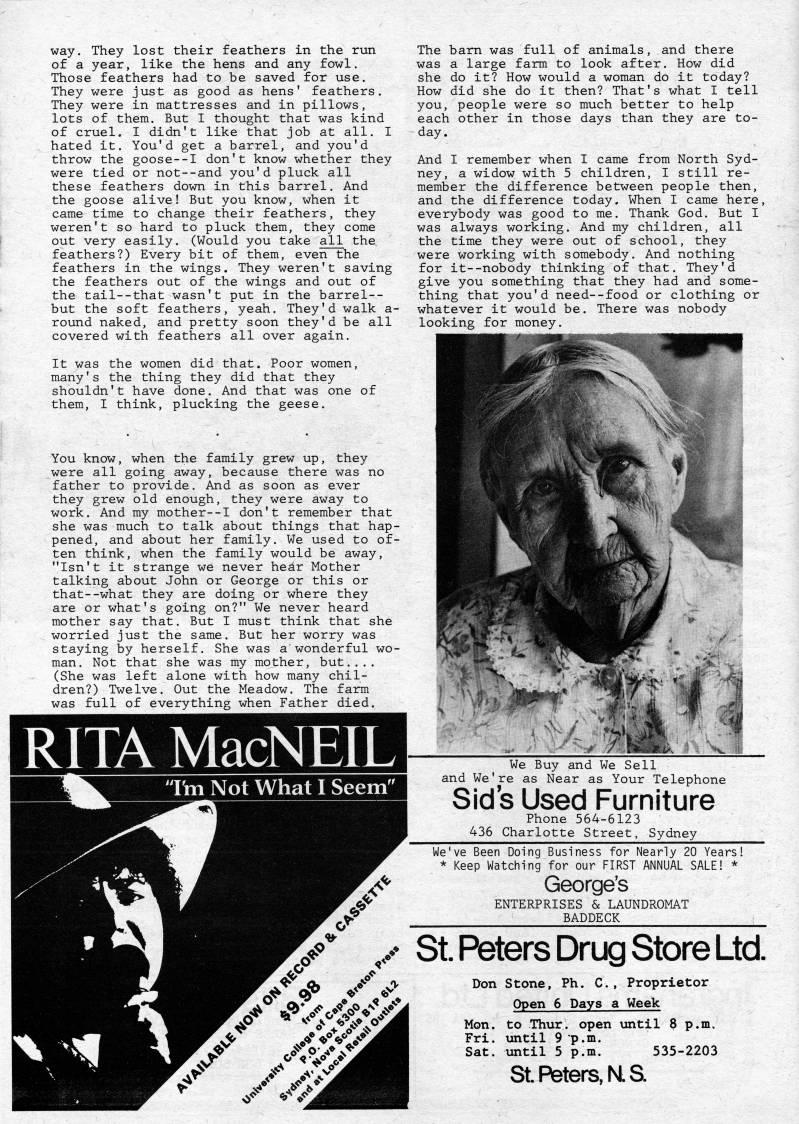 Published by Ronald Caplan on 1983/12/1 (395 reads)way. They lost their feathers in the run of a year, like the hens and any fowl. Those feathers had to be saved for use. They were just as good as hens' feathers. They were in mattresses and in pillows, lots of them. But I thought that was kind of cruel. I didn't like that job at all. I hated it. You'd get a barrel, and you'd throw the goose--I don't know whether they were tied or not--and you'd pluck all these feathers down in this barrel. And the goose alive! But you know, when it came time to change their feathers, they weren't so hard to pluck them, they come out very easily. (Would you take all the feathers?) Every bit of them, even the feathers in the wings. They weren't saving the feathers out of the wings and out of the tail--that wasn't put in the barrel-- but the soft feathers, yeah. They'd walk a- round naked, and pretty soon they'd be all covered with feathers all over again. It was the women did that. Poor women, many's the thing they did that they shouldn't have done. And that was one of them, I think, plucking the geese. You know, when the family grew up, they were all going away, because there was no father to provide. And as soon as ever they grew old enough, they were away to work. And my mother--I don't remember that she was much to talk about things that hap? pened, and about her family. We used to of? ten think, when the family would be away, "Isn't it strange we never hear Mother talking about John or George or this or that--what they are doing or where they are or what's going on?" We never heard mother say that. But I must think that she worried just the same. But her worry was staying by herself. She was a'wonderful wo? man. Not that she was my mother, but.... (She was left alone with how many chil? dren?) Twelve. Out the Meadow. The farm was full of everything when Father died. RITA MacNEIL "Vm Not What I Seem" The bam was full of animals, and there was a large farm to look after. How did she do it? How would a woman do it today? How did she do it then? That's what I tell you, people were so much better to help each other in those days than they are to? day. And I remember when I came from North Syd? ney, a widow with 5 children, I still re? member the difference between people then, and the difference today. When I came here, everybody was good to me. Thank God. But I was always working. And my children, all the time they were out of school, they were working with somebody. And nothing for it--nobody thinking of that. They'd give you something that they had and some? thing that you'd need--food or clothing or whatever it would be. There was nobody looking for money. r (g> y feV'' We Buy and We Sell and We're as Near as Your Telephone Sid s Used Furniture Phone 564-6123 436 Charlotte Street, Sydney We've Been Doing Business for Nearly 20 Years! * Keep Watching for our FIRST ANNUAL SALE! * George's ENTERPRISES & LAUNDROMAT BADDECK St. Peters Drug Store Ltd. Don Stone, Ph. C, Proprietor Open 6 Days a Week Mon. to Thur. open until 8 p.m. 535-2203 Fri. until 9 p.m. Sat. until 5 p.m. St Peters, N. a