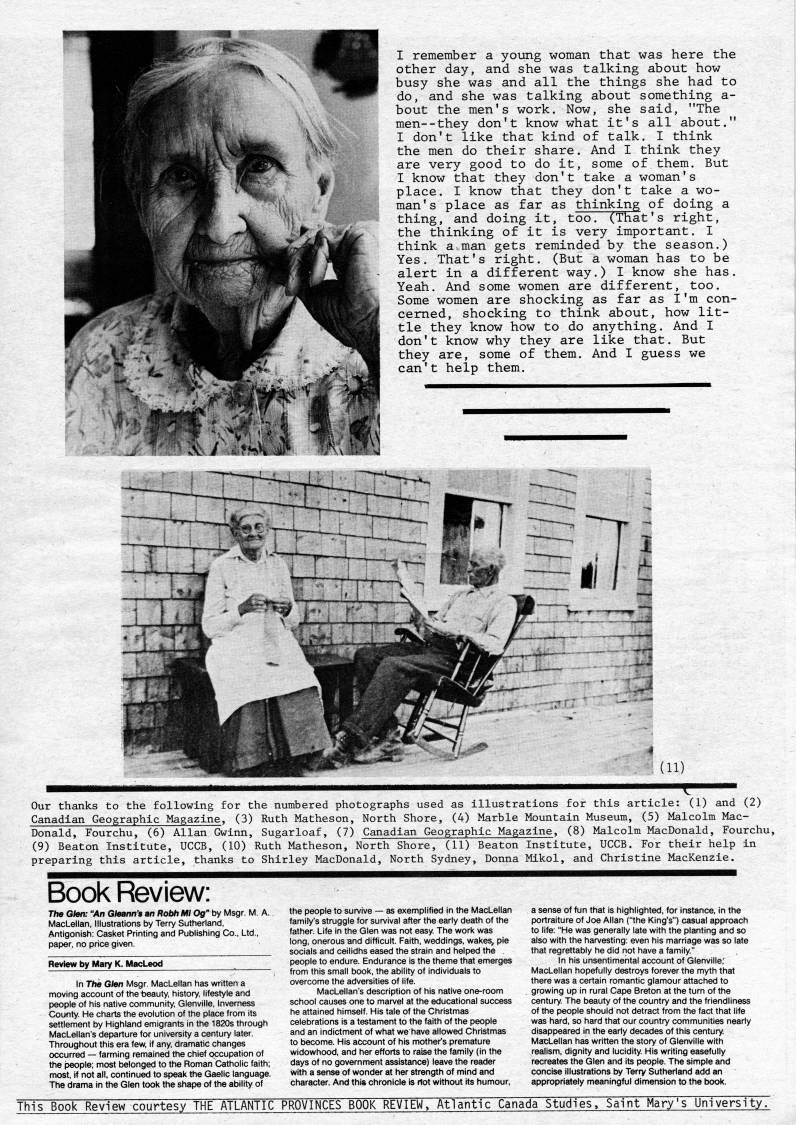 Published by Ronald Caplan on 1983/12/1 (371 reads)I remember a young woman that was here the other day, and she was talking about how busy she was and all the things she had to do, and she was talking about something a- bout the men's work. Now, she said, "The men--they don't know what it's all about." I don't like that kind of talk. I think the men do their share. And I think they are very good to do it, some of them. But I know that they don't take a woman's place. I know that they don't take a wo? man's place as far as thinking of doing a thing, and doing it, too"' (That' s right, the thinking of it is very important. I think a man gets reminded by the season.) Yes. That's right. (But a woman has to be alert in a different way.) I know she has. Yeah. And some women are different, too. Some women are shocking as far as I'm con? cerned, shocking to think about, how lit? tle they know how to do anything. And I don't know why they are like that. But they are, some of them. And I guess we can't help them. (11) Our thanks to the following for the numbered photographs used as illustrations for this article: (1) and (2) Canadian Geographic Magazine, (3) Ruth Matheson, North Shore, (4) Marble Mountain Museum, (5) Malcolm Mac? Donald, Fourchu, (6) Allan Gwinn, Sugarloaf, (7) Canadian Geographic Magazine, (8) Malcolm MacDonald, Fourchu, (9) Beaton Institute, UCCB, (10) Ruth Matheson, North Shore, (11) Beaton Institute, UCCB. For their help in preparing this article, thanks to Shirley MacDonald, North Sydney, Donna Mikol, and Christine MacKenzie. Book Review: The Glen: "An Gleann's an Robh Ml Og" by Msgr. M. A. MacLellan, Illustrations by Terry Sutherland, Antigonish: Casket Printing and Publishing Co., Ltd., paper, no price given. Review by Mary K. MacLeod In The Glen Msgr. MacLellan has written a moving account of thetoeauty, history, lifestyle and people of his native community, Glenville, Inverness County. He charts the evolution of the place from its settlement by Highland emigrants in the 1820s through MacLellan's departure for university a century later. Throughout this era few, if any, dramatic changes occurred • farming remained the chief occupation of the people; most belonged to the Roman Catholic faith; most, if not all. continued to speak the Gaelic language. The drama in the Glen took the shape of the ability of the people to sun/ive • as exemplified in the MacLellan famify's struggle for survival after the early death of the father. Life in the Glen was not easy The work was long, onerous and difficult. Faith, weddings, wakes, pie socials and ceilidhs eased the strain and helped the _ people to endure. Endurance is the theme that emerges from this small book, the ability of individuals to overcome the adversities of life. MacLellan's description of his native one-room school causes one to marvel at the educational success he attained himself. His tale of the Christmas celebrations is a testament to the faith of the people and an indictment of what we have allowed Christmas to become. His account of his mother's premature widowhood, and her efforts to raise the family (in the days of no government assistance) leave the reader with a sense of wonder at her strength of mind and character. And this chronicle is riot without its humour, a sense of fun that is highlighted, for instance, in the portraiture of Joe Allan ("the King's") casual approach to life: "He was generally late with the planting and so also with the harvesting: even his marriage was so late that regrettably he did riot have a family" In his unsentimental account of Glenville,' MacLellan hopefully destroys forever the myth that there was a certain romantic glamour attached to growing up in rural Cape Breton at the turn of the century. The beauty of the country and the friendliness of the people should not detract from the fact that life was hard, so hard that our country communities nearly disappeared in the early decades of this century MacLellan has written the story of Glenville with realism, dignity and lucidity. His writing easefully recreates the Glen and its people. The simple and concise illustrations by Terry Sutherland add an appropriately meaningful dimension to the book. This Book Review courtesy THE ATLANTIC PROVINCES BOOK REVIEW, Atlantic Canada Studies, Saint Mary's University.