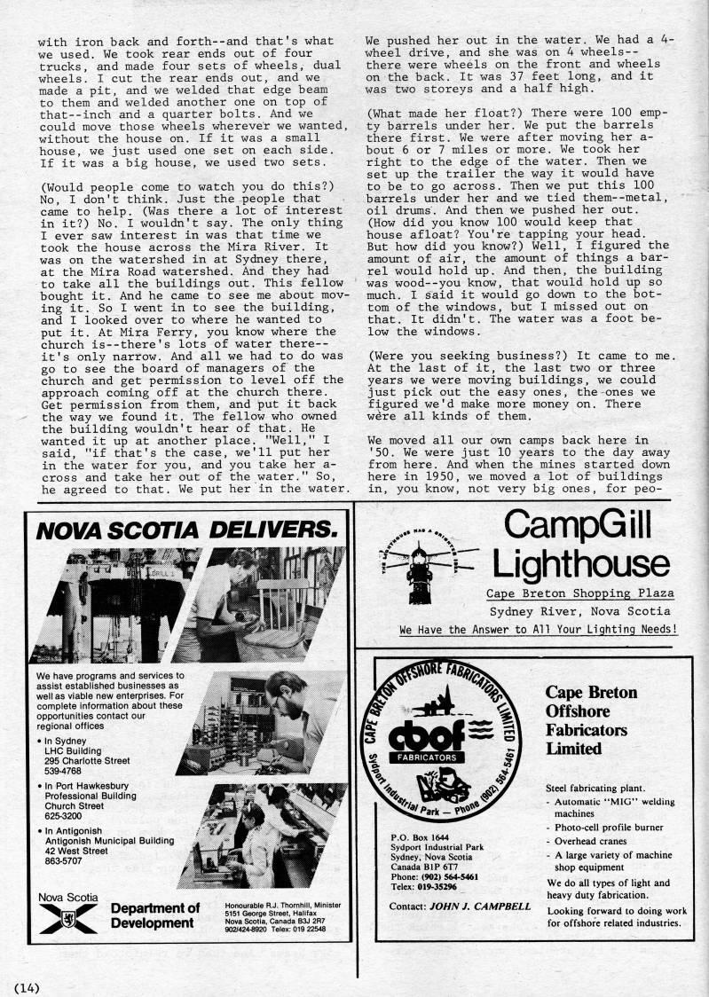 Published by Ronald Caplan on 1983/12/1 (369 reads)with iron back and forth--and that's what we used. We took rear ends out of four trucks, and made four sets of wheels, dual wheels. I cut the rear ends out, and we made a pit, and we welded that edge beam to them and welded another one on top of that--inch and a quarter bolts. And we could move those wheels wherever we wanted, without the house on. If it was a small house, we just used one set on each side. If it was a big house, we used two sets. (Would people come to watch you do this?) No, I don't think. Just the people that came to help. (Was there a lot of interest in it?) No. I wouldn't say. The only thing I ever saw interest in was that time we took the house across the Mira River, It was on the watershed in at Sydney there, at the Mira Road watershed. And they had to take all the buildings out. This fellow bought it. And he came to see me about mov? ing it. So I went in to see the building, and I looked over to where he wanted to put it. At Mira Ferry, you know where the church is--there's lots of water there-- it's only narrow. And all we had to do was go to see the board of managers of the church and get permission to level off the approach coming off at the church there. Get permission from them, and put it back the way we found it. The fellow who owned the building wouldn't hear of that. He wanted it up at another place, "Well," I said, "if that's the case, we'll put her in the water for you, and you take her a- cross and take her out of the water," So, he agreed to that. We put her in the water. We pushed her out in the water. We had a 4- wheel drive, and she was on 4 wheels-- there were wheels on the front and wheels on the back. It was 37 feet long, and it was two storeys and a half high. (What made her float?) There were 100 emp? ty barrels under her. We put the barrels there first. We were after moving her a- bout 6 or 7 miles or more. We took her right to the edge of the water. Then we set up the trailer the way it would have to be to go across. Then we put this 100 barrels under her and we tied them--metal, oil drums. And then we pushed her out. (How did you know 100 would keep that house afloat? You're tapping your head. But how did you know?) Well, I figured the amount of air, the amount of things a bar? rel would hold up. And then, the building was wood--you know, that would hold up so much, I said it would go down to the bot? tom of the windows, but I missed out on that. It didn't. The water was a foot be? low the windows. (Were you seeking business?) It came to me. At the last of it, the last two or three years we were moving buildings, we could just pick out the easy ones, the ones we figured we'd make more money on. There were all kinds of them. We moved all our own camps back here in '50, We were just 10 years to the day away from here. And when the mines started down here in 1950, we moved a lot of buildings in, you know, not very big ones, for peo- NOVA SCOTIA DELIVERS. We have programs and services to assist established businesses as well as viable new enterprises. For complete information about these opportunities contact our regional offices • In Sydney LHC Building 295 Charlotte Street 539-4768 • In Port Hawkesbury Professional Building Church Street 625-3200 • In Antigonish Antigonish IVIunicipal Building 42 West Street 863-5707 Nova Scotia Department of Development Honourable R.J. Thornhill, MInisI 5151 George Street, Halifax Nova Scotia, Canada B3J 2R7 902/424'920 Telex: 019 22548 _ CampGill ' Lighthouse Cape Breton Shopping Plaza Sydney River, Nova Scotia We Have the Answer to AIT Your Lighting Needs! P.O. Box 1644 Sydport Industrial Park Sydney, Nova Scotia Canada BIP 6T7 Phone: (902) 564-5461 Telex: 019-35296 Contact: JOHN J. CAMPBELL Cape Breton Offshore Fabricators Limited Steel fabricating plant. - Automatic "MIG" welding machines - Photo-cell profile burner - Overhead cranes - A large variety of machine shop equipment We do all types of light and heavy duty fabrication. Looking forward to doing work for offshore related industries. (14)