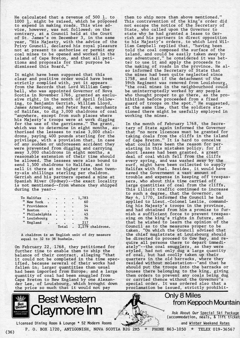 He calculated that a revenue of 500 1. to 1000 1. might be raised, which he proposed to expend in making roads. This wise ad? vice, however, was not followed; on the contrary, at a Council held at the Court of St • James's on December 3, in the same year, "His Majesty, with the advice of the Privy Council, declared his royal pleasure not at present to authorise or permit any coal mines to be opened and worked in the island of Cape Breton, and that all peti? tions and proposals for that purpose be dismissed this Board," It might have been supposed that this clear and positive order would have been strictly complied with, yet it appears from the Records that Lord William Camp? bell, who was appointed Governor of Nova Scotia in November 1766, granted an exclu? sive right, in the month of April follow? ing, to Benjamin Gerrish, William Lloyd, James Armstrong, and Peter Bard, merchants of Halifax, to dig 3,000 chaldrons of coal "anywhere, except from such places where his Majesty's troops were at work digging for the use of the garrisons." The grant, which was to determine in eight months, au? thorised the lessees to raise 3,000 chal? drons, paying 400 pounds sterling for the privilege, with a provision that, in case of any sudden or unforeseen accident they were prevented from digging and carrying away 3,000 chaldrons in eight months, a reasonable extension of their time should be allowed. The lessees were also bound to send 1,500 chaldrons to Halifax, and to sell it there at no higher rate than twen? ty-six shillings sterling per chaldron. Gerrish and his partners opened a mine at Spanish River (Sydney)--the exact locality is not mentioned--from whence they shipped during the year-- To Halifax " New York . . " Providence " Boston " Philadelphia " Louisbourg " England Tot al 1,783 60 54 44 45 76 217 2,279 chaldrons A chaldron is an English unit of dry measure equal to 32 to 36 bushels. On February 22, 1768, they petitioned for further time to enable them to ship the balance of their contract, alleging "that it could not be completed in the time spec? ified, because several of their works had fallen in; larger quantities than usual had been imported from Europe; and a large quantity of coal had been smuggled from Cape Breton to New England by one Alexan? der Lee, of Louisbourg, which brought down the price so much that it would not pay them to ship more than above mentioned." This contravention of the king's order did not escape the notice of the Secretary of State, who called upon the Governor to state why he had granted a lease to Ger? rish and his partners in direct opposition to his Majesty's orders, to which Lord Wil? liam Campbell replied that, "having been told the coal composed the surface of the island, and could be easily taken away by any adventurer," he considered it was bet? ter to use it and apply the proceeds to the making of roads in the province. He al? so informed the Secretary of State that the mines had been quite neglected since 1758, and that if the detachment of the 59th Regiment was removed from Louisbourg, "the coal mines in the neighbourhood could be uninterruptedly worked by any people who thought proper to go there, as the pro? hibition before proceeded from a fixed guard of troops on the spot." He suggested, at the same time, that the soldiers sta? tioned there might be usefully employed in working the mines. In the month of February 1768, the Secre? tary of State again informed the Governor that "no more licences must be granted for taking coals from the cliffs in the island of Cape Breton." It is hard to conceive what could have been the reason for per? sisting in this mistaken policy; for if short leases had been granted, a great deal of coal which fell from the cliffs every spring, and was washed away by the surf, might have been collected to supply Halifax with fuel. Besides, it would have saved the Government a vast amount of trouble and expense in keeping off trespas? sers, who about this time carried off large quantities of coal from the cliffs. This illicit traffic continued to increase to such a degree, that the Governor, on May 4, 1770, informed the Council he had applied to Lieut.-Colonel Leslie, command? ing his Majesty's troops in the province, and had obtained from him a promise to fur? nish a sufficient force to prevent trespas? sing on the king's rights in future, and that he wished to leam the opinion of the Council as to the measures proper to be taken. "On which the Council advised that the chief magistrate at Louisbourg should be directed to proceed to Cow Bay, and re? quire all persons there to depart immedi- ately"--the coal smugglers, as they were styled, had not only dug a large quantity of coal, but had coolly taken up their quarters in the old barracks, where they resided without molestation--"and that he should put the troops into the barracks or houses there belonging to the king, giving them orders to prevent any coals being dug or carried thence without the Governor's special order. It was ordered also that a proclamation be issued, strictly prohibit- Best Western Claymore Inn (36) Licensed Dining Room & Lounge * 52 Modern Rooms P. 0. BOX 1720, ANTIGONISH, NOVA SCOTIA B2G 2M5 Only 8 Miles from Keppoch Mountain Ask About Our Special Ski Package (accommodation, meals, & lift ticket] and Winter Weekend Rates PHONE 863-1050 * TELEX 019-36567 J