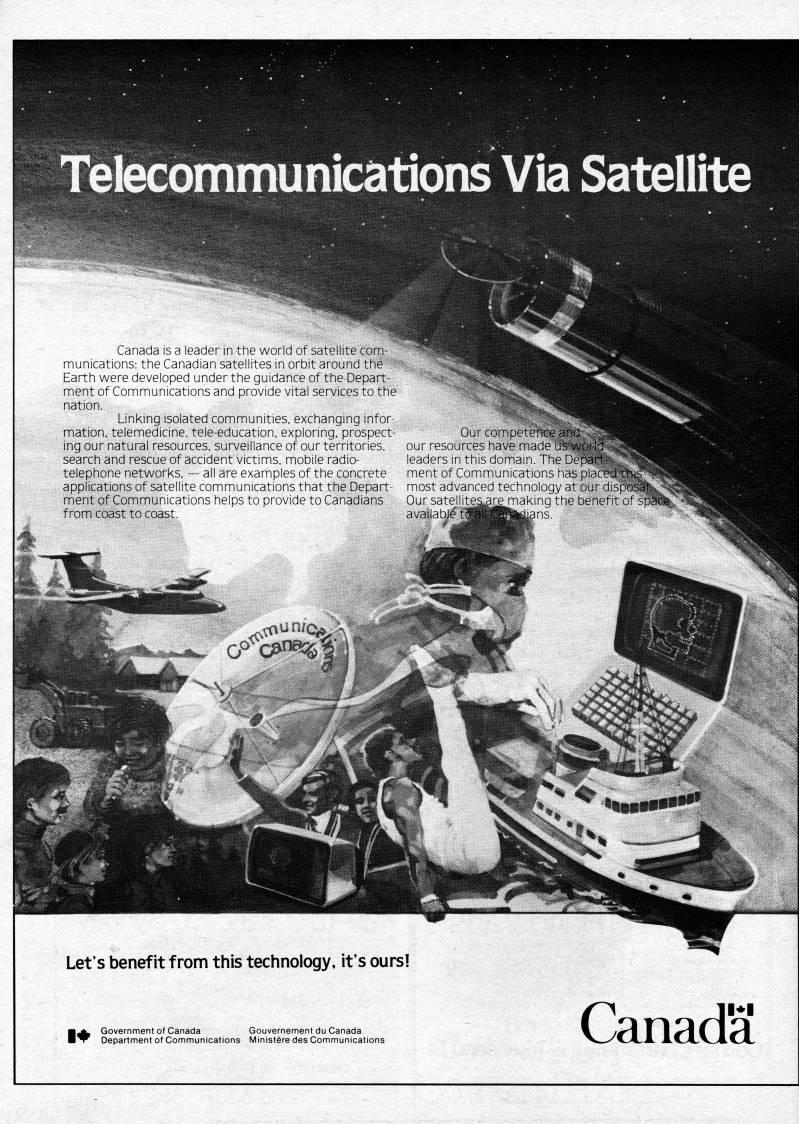 Published by Ronald Caplan on 1983/12/1 (329 reads)Telecommunications Via Satellite Canada is a leader in the world of satellite com munications: the Canadian satellites in orbit around the ' Earth were developed under the guidance of the Depart? ment of Communications and provide vital services to the nation. Linking isolated communities, exchanging infor mation. telemedicine, tele-education, exploring, prospect ing our natural resources, surveillance of our territories, search and rescue of accident victims, mobile radio? telephone networks, • all are examples of the concrete applications of satellite communications that the Depart ment of Communications helps to provide to Canadians from coast to coast. Our compete our resources have madel leaders in this domain. The De' .''' ment of Communications has plaB most advanced technology at our dis'p Our satejIite'g'ejTiaking the benefit of ??3 availab<"" Let's benefit from this technology, it's ours! ! Canada
