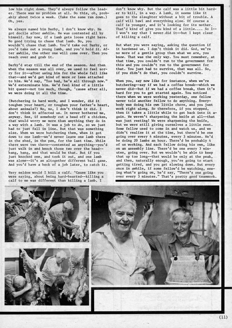 Published by Ronald Caplan on 1984/6/1 (296 reads)low him right down. They'd always follow the lead? er. There was no problem at all. Do this, oh, prob? ably about twice a week. (Take the same ram down.) Oh, yes. We always named him Darby, I don't know why. He got docile after awhile. He was contented all by himself. Say now, if a lamb gets loose right here. No good trying to chase that lamb. No, you wouldn't chase that lamb. You'd take out Darby, or you'd take out a young lamb, and you'd hold it. Af? ter awhile, the other one will come over. Then you reach over and grab it. Darby'd stay till the end of the season. And then when the season was all over, we used to feel sor? ry for it • after using .him for the whole fall like that • and we'd get kind of more or less attached to him. We'd say, "Too bad, he's all through now." We'd exterminate him. We'd feel kind of a little bit queer • not too much, though, 'cause after all, we were doing it all the time. (Butchering is hard work, and I wonder, did it toughen your heart, or toughen your father's heart, about animals?) No, no, 1 don't think it did. I don't think it affected us. It never bothered me, anyway. See, if somebody cut a head off a chicken, that would worry me more than anything they do in a way with a lamb. It was a job to do, so we just had to just fall in line. But that was something else. When we were butchering them, when it got down to one lamb • we'd never leave one lamb there in the shed, in the pen, for the last time. While there were two there • contented as anything • you'd just walk in and knock those two over the head • bang, bang, and that would be that. But if you just knocked one, and took it out, and one lamb was alone • it's an altogether different ball game. And you'd have a heck of a job later, to catch it. Very seldom would I kill a calf. 'Cause like you were saying, about being hard-hearted • killing a calf to me was different than killing a lamb. I don't know why. But the calf was a little bit hard? er to kill, in a way. A lamb, it seems like it goes to the slaughter without a bit of trouble. A calf will bawl and everything else. Of course a calf is younger, and it's looking for its mother. That'd kind of give you kind of a little So I • I won't say that I never did it • but I kept clear of killing a calf. But what you were saying, asking the question if it hardened us. I don't think it did. God, we're no more of a gentle group than what we are, you know. That was the only way. You must remember, at that time, you couldn't run to the government for this and you couldn't run to the government for that. You just had to suirvive, that was all. So, if you didn't do that, you couldn't survive. When you, say now like for instance, when we're butchering • say if we had a coffee break • which we never did • but if we had a coffee break, then it's hard for you to get started again. You noticed there when we were working yesterday, one fellow never told another fellow to do anything. Every? body was doing his own little chore, and you just work right along. So therefore, if you stopped, then it takes a little while to get back into it a- gain. We weren't sharpening the knife at all • that was just resting! We were sharpening the knife, but we were still giving ourselves a little rest. Some fellow used to come in and watch us, and we didn't realize it at the time, but there'd be one going over every 4 minutes, every 3 minutes. We'd be doing 20 lambs an hour. There'd be probably 4 of us working. And each fellow doing his own, like on an assembly line. There'd be one every 3 min? utes, going over. But we wouldn't be able to keep that up too long • that would be only at the peak, and then, naturally enough, you're going to start getting tired, and you get slowing down. But every once in awhile, if some fellow'd be watching, see? ing what's going on, he'd say, "There's one going over every 3 minutes." That's pretty good teamwork. (11)