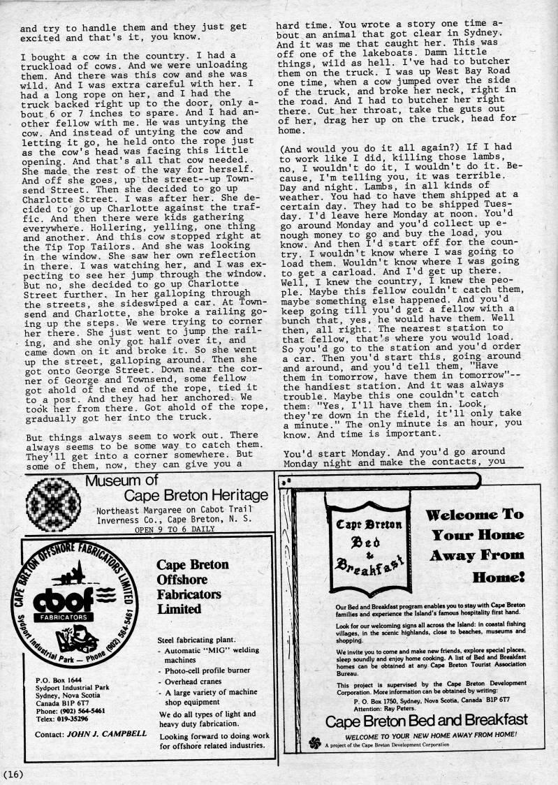 Published by Ronald Caplan on 1984/6/1 (272 reads)and try to handle them and they just get excited and that's it, you know. I bought a cow in the country. I had a truckload of cows. And we were unloading them. And there was this cow and she was wild. And I was extra careful with her. I had a long rope on her, and I had the truck backed right up to the door, only a- bout 6 or 7 inches to spare. And I had an? other fellow with me. He was untying the cow. And instead of untying the cow and letting it go, he held onto the rope just as the cow's head was facing this little opening. And that's all that cow needed. She made the rest of the way for herself. And off she goes, up the street--up Town- send Street, Then she decided to go up Charlotte Street, I was after her. She de? cided to go up Charlotte against the traf? fic. And then there were kids gathering everywhere. Hollering, yelling, one thing and another. And this cow stopped right at the Tip Top Tailors. And she was looking in the window. She saw her own reflection in there, I was watching her, and I was ex? pecting to see her jump through the window. But no, she decided to go up Charlotte Street further. In her galloping through the streets, she sideswiped a car. At Town- send and Charlotte, she broke a railing go? ing up the steps. We were trying to corner her there. She just went to jump the rail? ing, and she only got half over it, and came down on it and broke it, So she went up the street, galloping around. Then she got onto George Street. Down near the cor? ner of George and Townsend, some fellow got ahold of the end of the rope, tied it to a post. And they had her anchored. We took her from there. Got ahold of the rope, gradually got her into the truck. But things always seem to work out. There always seems to be some way to catch them. They'11 get into a corner somewhere. But some of them, now, they can give you a hard time. You wrote a story one time a- bout an animal that got clear in Sydney. And it was me that caught her. This was off one of the lakeboats. Damn little things, wild as hell. I've had to butcher them on the truck. I was up West Bay Road one time, when a cow jiimped over the side of the truck, and broke her neck, right in the road. And I had to butcher her right there. Cut her throat, take the guts out of her, drag her up on the truck, head for home. (And would you do it all again?) If I had to work like I did, killing those lambs, no, I wouldn't do it, I wouldn't do it. Be? cause, I'm telling you, it was terrible. Day and night. Lambs, in all kinds of weather. You had to have them shipped at a certain day. They had to be shipped Tues? day. I'd leave here Monday at noon. You'd go around Monday and you'd collect up e- nough money to go and buy the load, you know. And then I'd start off for the coun? try. I wouldn't know where I was going to load them. Wouldn't know where I was going to get a carload. And I'd get up there. Well, I knew the country, I knew the peo? ple. Maybe this fellow couldn't catch them, maybe something else happened. And you'd keep going till you'd get a fellow with a bunch that, yes, he would have them. Well then, all right. The nearest station to that fellow, that's where you would load. So you'd go to the station and you'd order a car. Then you'd start this, going around and around, and you'd tell them, "Have them in tomorrow, have them in tomorrow"-- the handiest station. And it was always trouble. Maybe this one couldn't catch them: "Yes, I'll have them in. Look, they're down in the field, it'll only take a minute." The only minute is an hour, you know. And time is important. You'd start Monday. And you'd go around Monday night and make the contacts, you Museum of Cape Breton Heritage Northeast Margaree on Cabot Trail Inverness Co., Cape Breton, N. S. OPEN 9 TO 6 DAILY P.O. Box 1644 Sydport Industrial Park Sydney, Nova Scotia Canada BIP 6T7 Phone: (902) 564-5461 Telex: 019-35296 Contact: JOHN J. CAMPBELL Cape Breton Offshore Fabricators limited Steel fabricating plant. - Automatic "MIG" welding machines - Photo-cell profile burner - Overhead cranes - A large variety of machine shop equipment We do all types of light and heavy duty fabrication. Looking forward to doing work for offshore related industries. (16) 'X Capt Btmn 5Be6 Weleome To Tour Home A'wray From HomieS Our Bed and Breakfast program enables you to stay with Cape Breton families and experience the Island's famous hospitality first hand. Look for our welcoming signs all across the Island: in coastal fishing villages, in the scenic highlands, close to beaches, museums and shopping. We invite you to come and make new friends, explore special places, sleep soundly and enjoy home coddng. A list of Bed and Breakfast homes can be obtained at any Cape Breton Tourist Association Bureau. This project is supervised by the Cape Breton Development Corporation. More information can be obtained by writing: P. O. Box 1750, Sydney, Nova Scotia, Canada BIP 6T7 Attention: Ray Peters. Cape Breton Bed and Breakfast WELCOME TO YOUR NEW HOME AWAY FROM HOME! ' A project of the Cape Breton Development Corporation