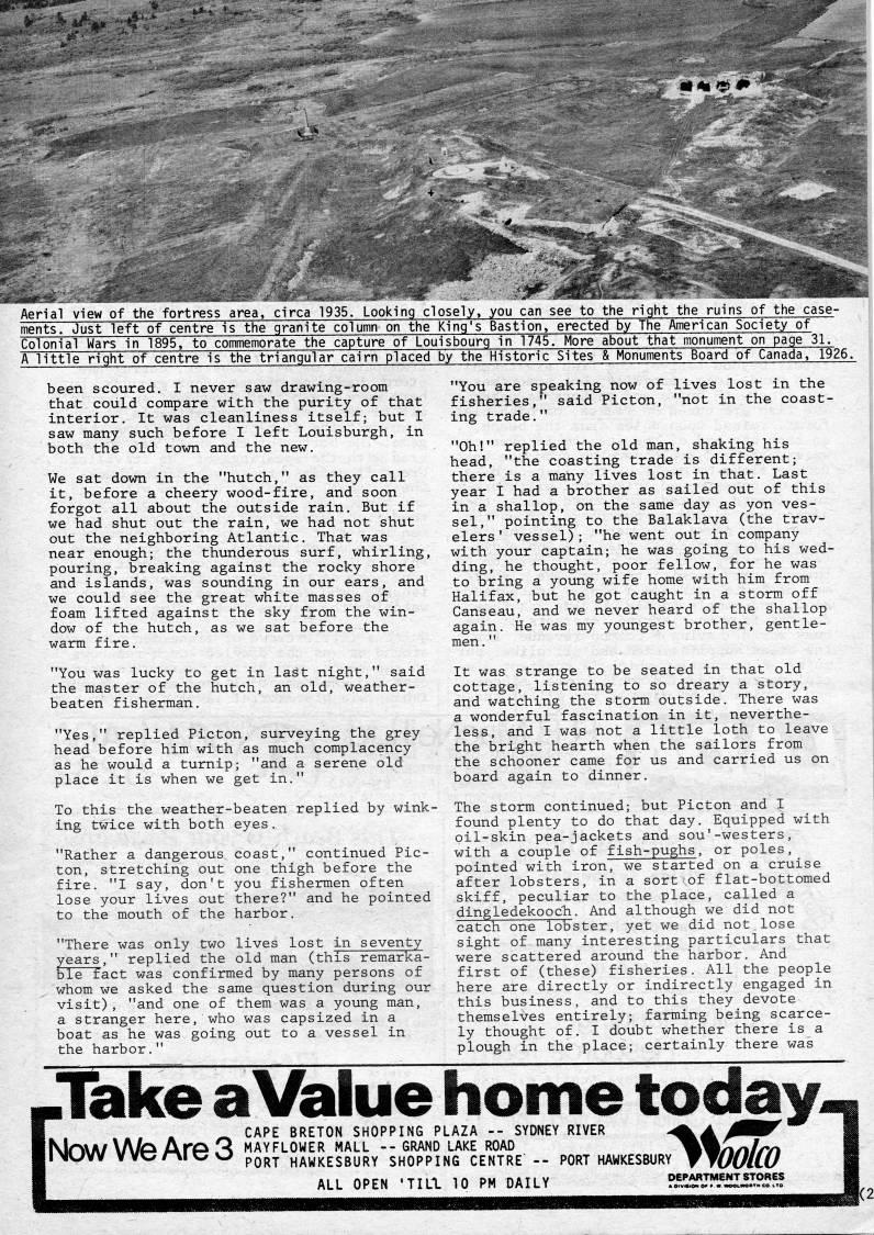 Published by Ronald Caplan on 1984/6/1 (279 reads)??''??'0??>,:. .;|C %*# • ??' *>ir:"''-'E;"'' Aerial view of the fortress area, circa 1935. Looking closely, you can see to the right the ruins of the case? ments. Just left of centre is the granite column- on the King's Bastion, erected by The American Society of Colonial Wars in 1895, to commemorate the capture of Louisbourg in 1745. More about that monument on page 31. A little right of centre is the triangular cairn placed by the Historic Sites & Monuments Board of Canada, 1926. been scoured. I never saw drawing-room that could compare with the purity of that interior. It was cleanliness itself; but I saw many such before I left Louisburgh, in both the old town and the new. We sat down in the "hutch," as they call it, before a cheery wood-fire, and soon forgot all about the outside rain. But if we had shut out the rain, we had not shut out the neighboring Atlantic. That was near enough; the thunderous surf, whirling, pouring, breaking against the rocky shore and islands, was sounding in our ears, and we could see the great white masses of foam lifted against the sky from the win? dow of the hutch, as we sat before the warm fire. "You was lucky to get in last night," said the master of the hutch, an old, weather- beaten fisherman. "Yes," replied Picton, surveying the grey head before him with as much complacency as he would a turnip; "and a serene old place it is when we get in," To this the weather-beaten replied by wink? ing twice with both eyes. "Rather a dangerous coast," continued Pic? ton, stretching out one thigh before the fire. "I say, don't you fishermen often lose your lives out there?" and he pointed to the mouth of the harbor. "There was only two lives lost in seventy gears," replied the old man (this remarka- le fact was confirmed by many persons of whom we asked the same question during our visit), "and one of them was a young man, a stranger here, who was capsized in a boat as he was going out to a vessel in the harbor." "You are speaking now of lives lost in the fisheries," said Picton, "not in the coast? ing trade." "Oh!" replied the old man, shaking his head, "the coasting trade is different; there is a many lives lost in that. Last year I had a brother as sailed out of this in a shallop, on the same day as yon ves? sel," pointing to the Balaklava (the trav? elers' vessel); "he went out in company with your captain; he was going to his wed? ding, he thought, poor fellow, for he was to bring a young wife home with him from Halifax, but he got caught in a storm off Canseau, and we never heard of the shallop again. He was my youngest brother, gentle? men. " It was strange to be seated in that old cottage, listening to so dreary a story, and watching the storm outside. There was a wonderful fascination in it, neverthe? less, and I was not a little loth to leave the bright hearth when the sailors from the schooner came for us and carried us on board again to dinner. The storm continued; but Picton and I found plenty to do that day. Equipped with oil-skin pea-jackets and sou'-westers, with a couple of fish-pughs, or poles, pointed with iron, we started on a cruise after lobsters, in a sort of flat-bottomed skiff, peculiar to the place, called a dingledekoochi. And although we did not catch one lobster, yet we did not lose sight of many interesting particulars that were scattered around the harbor. And first of (these) fisheries. All the people here are directly or indirectly engaged in this business, and to this they devote themselves entirely; farming being scarce? ly thought of. I doubt whether there is a plough in the place; certainly there was I Take a Value home today- ,., - _ CAPE BRETON SHOPPING PLAZA -- SYDNEY RIVER ''A. 0'' I Now We Are 3 mayflower mall - grand lake road '%n'i'yi I xysj'M V??'/'iv'w pQj'.p HAWKESBURY SHOPPING CENTRE -- PORT HAWKESBURY WyUOlLu I ALL OPEN 'TIL! 10 PM DAILY ''.''JMPiLTilPc??.! I - 11 il I iwii iimii • ? T'