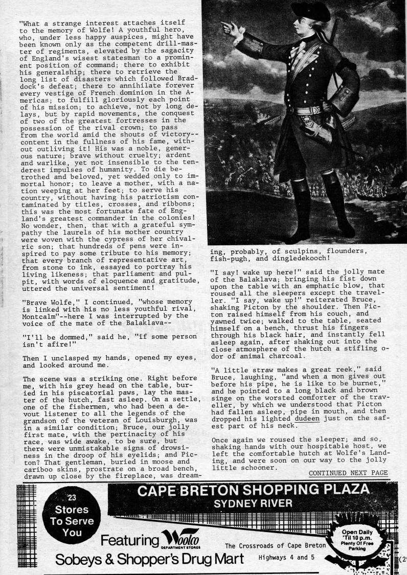 Published by Ronald Caplan on 1984/6/1 (270 reads)What a strange interest attaches itself to the memory of Wolfe! A youthful hero, who, under less happy auspices, might have been known only as the competent drill-mas? ter of regiments, elevated by the sagacity of England's wisest statesman to a promin? ent position of command; there to exhibit his generalship; there to retrieve the long list of disasters which followed Brad- dock's defeat; there to annihilate forever every vestige of French dominion in the A- mericas; to fulfill gloriously each point of his mission; to achieve, not by long de? lays, but by rapid movements, the conquest of two of the greatest fortresses in the possession of the rival crown; to pass from the world amid the shouts of victory-- content in the fullness of his fame, with? out outliving it! His was a noble, gener? ous nature; brave without cruelty; ardent and warlike, yet not insensible to the ten- derest impulses of humanity. To die be? trothed and beloved, yet wedded only to im? mortal honor; to leave a mother, with a na? tion weeping at her feet; to serve his country, without having his patriotism con? taminated by titles, crosses, and ribbons; this was the most fortunate fate of Eng? land's greatest commander in the colonies! No wonder, then, that with a grateful sjmi- pathy the laurels of his mother country were woven with the cypress of her chival- ric son; that hundreds of pens were in? spired to pay some tribute to his memory; that every branch of representative art, from stone to ink, essayed to portray his living likeness; that parliament and pul? pit, with words of eloquence and gratitude, uttered the universal sentiment! Brave Wolfe," I continued, "whose memory is linked with his no less youthful rival, Montcalm"--here I was interrupted by the voice of the mate of the Balaklava-- "I'11 be dommed,' isn't afire!" said he, "if some person Then I unclasped my hands, opened my eyes, and looked around me. The scene was a striking one. Right before me, with his grey head on the table, bur? ied in his piscatorial paws, lay the mas? ter of the hutch, fast asleep. On a settle, one of the fishermen, who had been a de? vout listener to all the legends of the grandson of the veteran of Louisburgh, was in a similar condition; Bruce, our jolly first mate, with the pertinacity of his race, was wide awake, to be sure, but there were unmistakable signs of drowsi? ness in the droop of his eyelids; and Pic? ton? That gentleman, buried in moose and cariboo skins, prostrate on a broad bench, drawn up close by the fireplace, was dream? ing, probably, of sculpins, flounders, fish-pugh, and dingledekooch! "I say! wake up here!" said the jolly mate of the Balaklava; bringing his fist down upon the table with an emphatic blow, that roused all the sleepers except the travel? ler. "I say, wake up!" reiterated Bruce, shaking Picton by the shoulder. Then Pic? ton raised himself from his couch, and yawned twice; walked to the table, seated himself on a bench, thrust his fingers through his black hair, and instantly fell asleep again, after shaking out into the close atmosphere of the hutch a stifling o- dor of animal charcoal. "A little straw makes a great reek," said Bruce, laughing, "and when a mon gives out before his pipe, he is like to be burnet," and he pointed to a long black and brown singe on the worsted comforter of the trav? eller, by which we understood that Picton had fallen asleep, pipe in mouth, and then dropped his lighted dudeen just on the saf? est part of his neck. Once again we roused the sleeper; and so, shaking hands with our hospitable host, we left the comfortable hutch at Wolfe's Land? ing, and were soon on our way to the jolly little schooner. CONTINUED NEXT PAGE Stores To Serve You CAPE BRETON SHOPPING PLAZA SYDNEYRIVER mH' Featuring 'Wo *' OCrAnTMENT STORES Opei Till OCrARTMENT STORES The Crossroads of Cape Breton' Sobeys & Shopper's Drug Mart "'9'"''' * '"' ' 10 p.m. r 1(2'