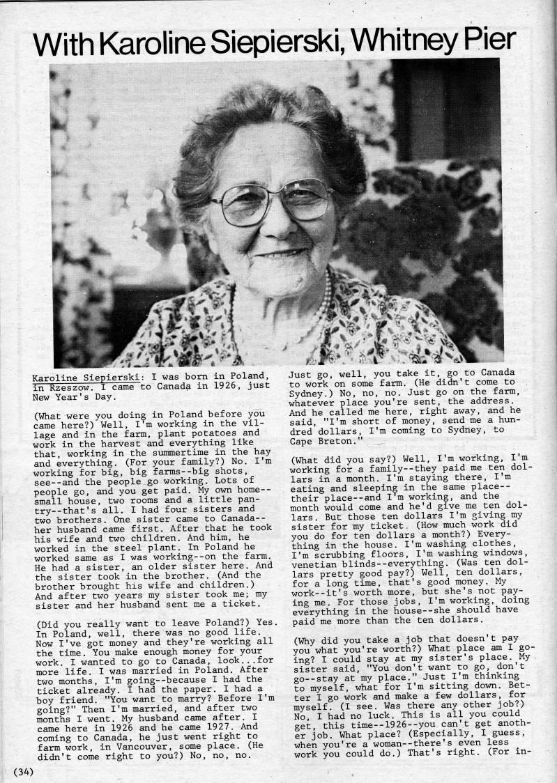 Published by Ronald Caplan on 1984/6/1 (619 reads)With Karoline Siepierski, Whitney Pier Karoline Siepierski: I was bom in Poland, in Rzeszow. I came to Canada in 1926, just New Year's Day. (What were you doing in Poland before you came here?) Well, I'm working in the vil? lage and in the farm, plant potatoes and work in the harvest and everything like that, working in the summertime in the hay and everything. (For your family?) No. I'm working for big, big farms--big shots, see--and the people go working. Lots of people go, and you get paid. My own home-- small house, two rooms and a little pan- try--that's all. I had four sisters and two brothers. One sister came to Canada-- her husband came first. After that he took his wife and two children. And him, he worked in the steel plant. In Poland he worked same as I was working--on the farm. He had a sister, an older sister here. And the sister took in the brother. (And the brother brought his wife and children.) And after two years my sister took me; my sister and her husband sent me a ticket. (Did you really want to leave Poland?) Yes. In Poland, well, there was no good life. Now I've got money and they're working all the time. You make enough money for your work. I wanted to go to Canada, look...for more life. I was married in Poland. After two months, I'm going--because I had the ticket already. I had the paper. I had a boy friend. "You want to marry? Before I'm going?" Then I'm married, and after two months I went. My husband came after. I came here in 1926 and he came 1927. And coming to Canada, he just went right to farm work, in Vancouver, some place. (He didn't come right to you?) No, no, no. Just go, well, you take it, go to Canada to work on some farm. (He didn't come to Sydney.) No, no, no. Just go on the farm, whatever place you're sent, the address. And he called me here, right away, and he said, "I'm short of money, send me a hun? dred dollars, I'm coming to Sydney, to Cape Breton." (What did you say?) Well, I'm working, I'm working for a family--they paid me ten dol? lars in a month. I'm staying there, I'm eating and sleeping in the same place-- their place--and I'm working, and the month would come and he'd give me ten dol? lars. But those ten dollars I'm giving my sister for my ticket? (How much work did you do for ten dollars a month?) Every? thing in the house. I'm washing clothes, I'm scrubbing floors, I'm washing windows, Venetian blinds--everything. (Was ten dol? lars pretty good pay?) Well, ten dollars, for a long time, that's good money. My work--it's worth more, but she's not pay? ing me. For those jobs, I'm working, doing everything in the house--she should have paid me more than the ten dollars. (Why did you take a job that doesn't pay you what you're worth?) What place am I go? ing? I could stay at my sister's place. My sister said, "You don't want to go, don't go--stay at my place." Just I'm thinking to myself, what for I'm sitting down. Bet? ter I go work and make a few dollars, for myself. (I see. Was there any other job?) No, I had no luck. This is all you could get, this time--1926--you can't get anoth? er job. What place? (Especially, I guess, when you're a woman--there's even less work you could do.) That's right. (For in- (34)
