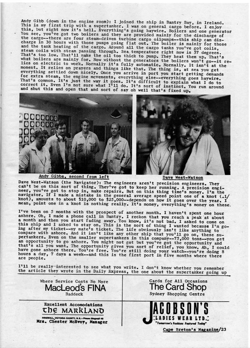 Published by Ronald Caplan on 1973/12/1 (486 reads)Andy Gibb (down in the engine room): I joined the ship in Bantry Bay, in Ireland, This is my first trip with a supertanker, I was on general cargo before, I enjoy this, but right now it's hell. Everything's going haywire. Boilers and one generator You see, you've got two boilers and they are provided mainly for the discharge of the cargo • there are four steam-driven turbine cargo oilpumps • this ship can dis? charge in 30 hours with those pumps going flat out. The boiler is mainly for those and the tank heating of the cargo. Around all the cargo tanks you've got coils, steam coils with steam passing through. Sea, temperature right now is 57 degrees. That's too low. That'll make the oil too thick to pump. They heat them up. That's what boilers are mainly for. Now without the generators the boilers won't go it re? lies on electric to work. Normally it's fully automatic. Normally. It isn't at the moment. It relies on prayers and things like that. The thing is, at sea you get everything settled down nicely. Once you arrive in port you start getting demands for extra steam, the engine movements, everything else • everything goes haywire. That's common. It's just the way it goes. It's difficult to explain what I do to correct it. Even I'm not sure what I'll do. It's sort of instinct. You run around and shut this and open that and sort of say oh well that's fixed up. Andy Gibbs, second from left Dave West-Watson Dave West-Watson (the Navigator): The engineers aren't precision engineers. They can't be on this sort of thing. They've got to keep her running. A precision engi? neer, you've got to stop in, make repairs. But on this thing time's money. I'm the navigator. If I made a mistake in the general average speed point one of a knot (.1/ knot), amounts to about $10,000 to $25,000 • depends on how it goes over the year. I mean, point one in a knot is nothing really. It's money, everything's money on these. I've been on 5 months with the prospect of another month. I haven't s'nt one hour ashore. Oh, I made a phone call in Bantry. I reckon that you reach a peak at about a month and then you start fading away. You know, it's not bad. I asked to come on this ship and I asked to stay on. This is the sort of thing I wanted because I'm go? ing after my ticket • ray mate's ticket. The life obviously isn't like anything to compare with ashore. And it isn't like any other ship that you'll go on, these su? pertankers. Even on the smaller supertankers in this company • 75,000 tons • you get an opportunity to go ashore. You might not got but you've got the opportunity and that's all you want. The opportunity gives you sort of relief, you know. Ah, I could have gone ashore there. You're free. You're still doing your ivatch • you're doing 8 hours a day, 7 days a week • and this is the first port in five months where there are people, I'll be really interested to see what you write. I don't know whether you remember the article they wrote in the Daily Express, the one about the supertanker going up Where Service Costs No More MacLeod's FINA Baddeck Excellent Accomodations rbe MARklAND MNaWALL'VICTORM COUNTY. N.S. > PhaiMiOllwmMi 4* Mrs. Chester McBvoyt Manager Cards for All Occasions The Card Shop Sydney Shopping Centre lAGOBSON'S 'ILADIES WEAR LTD.! '1' "Tenwrrew's FosWons Featured Tecfay" Cape Breton's Magazine/23