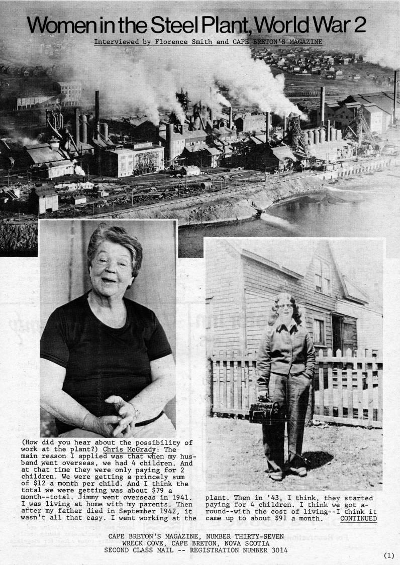 Published by Ronald Caplan on 1984/8/1 (843 reads)Women in the Steel Plant Vforld War 2 • 'X (How did you hear about the possibility of work at the plant?) Chris McGrady; The main reason I applied was that when my hus? band went overseas, we had 4 children. And at that time they were only paying for 2 childreno We were getting a princely sim of $12 a month per child. And I think the total we were getting was about $79 a month--total. Jimmy went overseas in 1941. I was living at home with tny parents. Then after my father died in September 1942, it wasn't all that easy. I went working at the plant. Then in '43, I think, they started paying for 4 children. I think we got a- round--with the cost of living--I think it came up to about $91 a month. CONTINUED CAPE BRETON'S MAGAZINE, NUMBER THIRTY-SEVEN WRECK COVE, CAPE BRETON, NOVA SCOTIA SECOND CLASS MAIL -- REGISTRATION NUMBER 3014 (1)