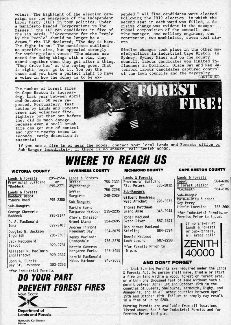 Published by Ronald Caplan on 1984/8/1 (304 reads)voters. The highlight of the election cam? paign was the emergence of the Independent Labor Party (ILP) in town politics. Under a manifesto headed "Corporations vs The Masses," the ILP ran candidates in five of the six wards. "'Government for the People by the People' should no longer be a dream," the ILP declared; "The day is here. The fight is on." The manifesto outlined no specific aims, but appealed strongly for working-class votes: "The miners are noted for doing things with a vim, they stand together when they get after a thing. 'They drive her' as the saying goes. That is right, boys, go to it. You pay the taxes and you have a perfect right to have a voice in how the money is to be ex? pended." All five candidates were elected. Following the 1919 election, in which the second seat in each ward was filled, a de? cisive change was evident in the occupa? tional composition of the council: one mine manager, one colliery engineer, one contractor, two machinists, seven coal min? ers . Similar changes took place in the other mu? nicipalities in industrial Cape Breton. In Sydney, Sydney Mines and on the county council, labour candidates won limited in? fluence; in Dominion, Glace Bay and New Wa? terford labour candidates captured control of the town councils and the mayoralty. CONTINUED mmm vmvA The number of forest fires in Cape Breton is increas? ing. Last year between April and October, 50 were re? ported. Fortunately, fast action by Lands and Forests crews and volunteer fire? fighters put them out before they did do much damage. Because even a small brush fire can get out of control and ignite nearby trees in seconds, early detection is essential. If you see a fii'e in or near the woods, contact your local Lands and Forests office or Sub-Ranger immediately. If there is no answer, call Zenith 40000. WHERE TO REACH US VICTORIA COUNTY INVERNESS COUNTY RICHMOND COUNTY CAPE BRETON COUNTY Lands & Forests Provincial Building *Baddeck Lands & Forests Baddeck Depot Shore Road Sub-Rangers George Cheverie Baddeck D. A. MacDonald lona Douglas W. Jackson Ingonish Jack MacDonald Tarbot Allister N. Maclnnis Englishtown John A. Curtis Bay St. Lawrence 295-2554 or 295-2771 295-2300 295-2177 622-2403 285-2502 929-2781 929-2347 383-2293 Lands & Forests Office Whycocomagh Office Margaree Sub-Rangers Martin Burns Margaree Harbour Cldvis Chiasson Grand Etang Andrew Timmons Pleasant Bay Kenny Maclnnis Orangedale Martin Cameron Margaree Forks Harold MacDonald Mabou Harbour 756-2339 or 756-2298 248-2029 235-2235 224-2695 224-2075 756-2370 248-2455 945-2683 Lands & Forests Provincial Building *St. Peters 535-2032 Sub-Rangers Gilbert Boudreau West Arichat 226-3273 Thomas Matthews Grand Anse 345-2944 Roger MacLeod Grand River 587-2871 Dan Norman MacLeod Stirling 884-2794 Donald MacLeod Loch Lomond 587-2288 *for Permits Prior to 5 p.m. AND DON'T F Lands & Forests Depot 564-6389 & Forest Station or *Coxheath 564-8387 Sub-Ranger Main-a-Dieu & area: Roy Perry Little Lorraine 733-2664 *for Industrial Permits- or Permits Prior to 5 p.m. OR IT no answer at Lands & Forests or Sub-Rangers, all areas call: ZENITH 40000 GET *for Industrial Permits DO YOUR PART PREVENT FOREST FIRES Nova Scotia 'fj?l' Department of Lands and Forests ... that Burning Permits are required under the Lands & Forests Act. No person shall make, kindle or start a fire on land within a wood, forest or forest area, or within one thousand feet of same without such a permit between April 1st and October 15th in the counties of Queens, Shelburne, Yarmouth, Digby, and Annapolis, and in all other counties between April 15th and October 15th. Failure to comply may result in a fine of up to $200. Burning Permits are available from all locations listed above. See * for Industrial Permits and for Permits Prior to 5 p.m.