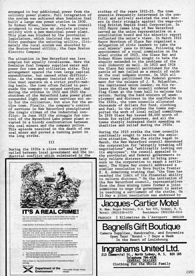Published by Ronald Caplan on 1984/8/1 (383 reads)arranged to buy additional power from the colliery power plants. Full integration of the system was achieved when Dominion Coal built a large new power station in 1930. In Sydney Mines, however, the town council attempted to replace an obsolete private utility with a new municipal power plant. This plan was blocked by the provincial legislature, which insisted the town must first purchase the existing utility. Ulti? mately the local system was absorbed by the Boston-based utility, the Cape Breton Electric Company. The situation in New Waterford was less complex but equally troublesome. Here the Dominion Coal Company supplied water and power for town and collieries alike. This arrangement spared the town large capital expenditures, but caused other difficul? ties . As the company insisted the utili? ties must operate on a strict profit-mak? ing basis, the town often failed to per? suade the company to extend services. And during the strikes in 1922 and 1925 the shutdown of the Waterford Lake power plant suspended light and water services not on? ly for the collieries, but also for the en? tire town. Finally, the company's control of services in New Waterford precipitated the tragic climax of the industrial con? flict: in June 1925 the struggle for con? trol of the Waterford Lake power plant e- rupted in a bloody confrontation between the coal miners and the company police. This episode resulted in the death of one coal miner and proved a turning point in the long strike. Ill During the 1920s a close connection pre? vailed between local government and the in? dustrial conflict which culminated in the IT'S AREALCRIME! moJemenfofw Under Section Unless approve well, lake, river may cause poll Jfer'n' 6 (Pol dbyth cfiarge pond. So, if your plans for CO property include any in 2, We may be able to minimal damage tc Help us keep o damage. Nova Scotia rnatu h'em ution nywate of tfie A CO Ctit rseorlakea makes very or deposit any material of any ringement on application to the' alen akthel ironme i "' tfrc nd ttie natural learthat: kmd'imoorlnl Nova Scotia Department of We ask you to do tfiis for two w to go abou m irreparab your project w e ecological :x: Department of the honourable George Moody Environment tvumster strikes of the years 1922-25. The town councils frequently intervened in the con? flict and actively assisted the coal min? ers in their struggle against the wage-cut? ting British Empire Steel Corporation. In 1922 Mayor James Ling of New Waterford served as the union representative on a conciliation board and his minority report reflected the union's views. In March 1922 Mayor Morrison of Glace Bay organized a delegation of civic leaders to take the coal miners' case to Ottawa. Following the appointment of a royal commission on the steel strike of 1923, the Glace Bay and Sydney Mines councils sought to have the enquiry extended to the problems of the coal industry as well. In 1922 and 1926 the Glace Bay council petitioned for the parole of men jailed as a result of raids on the coal company stores. In 1924 all three towns petitioned the federal govern? ment for the release of J. B. McLachlan, the imprisoned union leader; on his re? lease the Glace Bay council ordered the flag flown at the town hall to welcome his return. During the hard winters of unem? ployment and distress in the coalfields in the 1920s, the town councils allocated thousands of dollars for food, clothing and fuel; in the strikes the towns sup? ported the work of local relief committees. In 1926 Glace Bay issued $8,000 worth of bonds for relief purposes, and all the towns sharply increased their spending on charities and relief during the 1920s. During the 1925 strike the town councils continually sought to resolve the explo? sive situation. When the strike began in March, the New Waterford council denounced' the corporation for "abruptly breaking off negotiations" and "arbitrarily locking out its employees"; the council appealed to the provincial and federal governments to help relieve distress and to bring pres? sure on the corporation to reach a settle? ment. The Glace Bay council addressed a similar resolution to Nova Scotia Prem.ier E. H. Armstrong stating that "the Town has reached the limit of its financial ability to relieve distress." On the invitation of the New Waterford council, representatives ' from the four mining towns formed a joint committee to urge the government to assist in reaching a settlement of the strike. On 15 May a joint resolution was endorsed by Jacques-Cartier Motel M. Mme. Roger Poirier, P.O. Box 555, Motel: (902)539-4375 Residence: Sydney, N. S. (902)562-2414 FRANCAIS 2 Kilometres de I'Aeroport ENGLISH Bagnell's Gift Boutique Camera Supplies, Handcrafts, and Souvenirs Open Year 'Round - 7 Days a Week In the Heart/of Louisbourg ms United Ltd. 213 Coiiinercial St., North Sydney. N. S. B2A 1B5 Telephone 794-4536 GENERAL DEM.ERS Clothing for the Whole Family