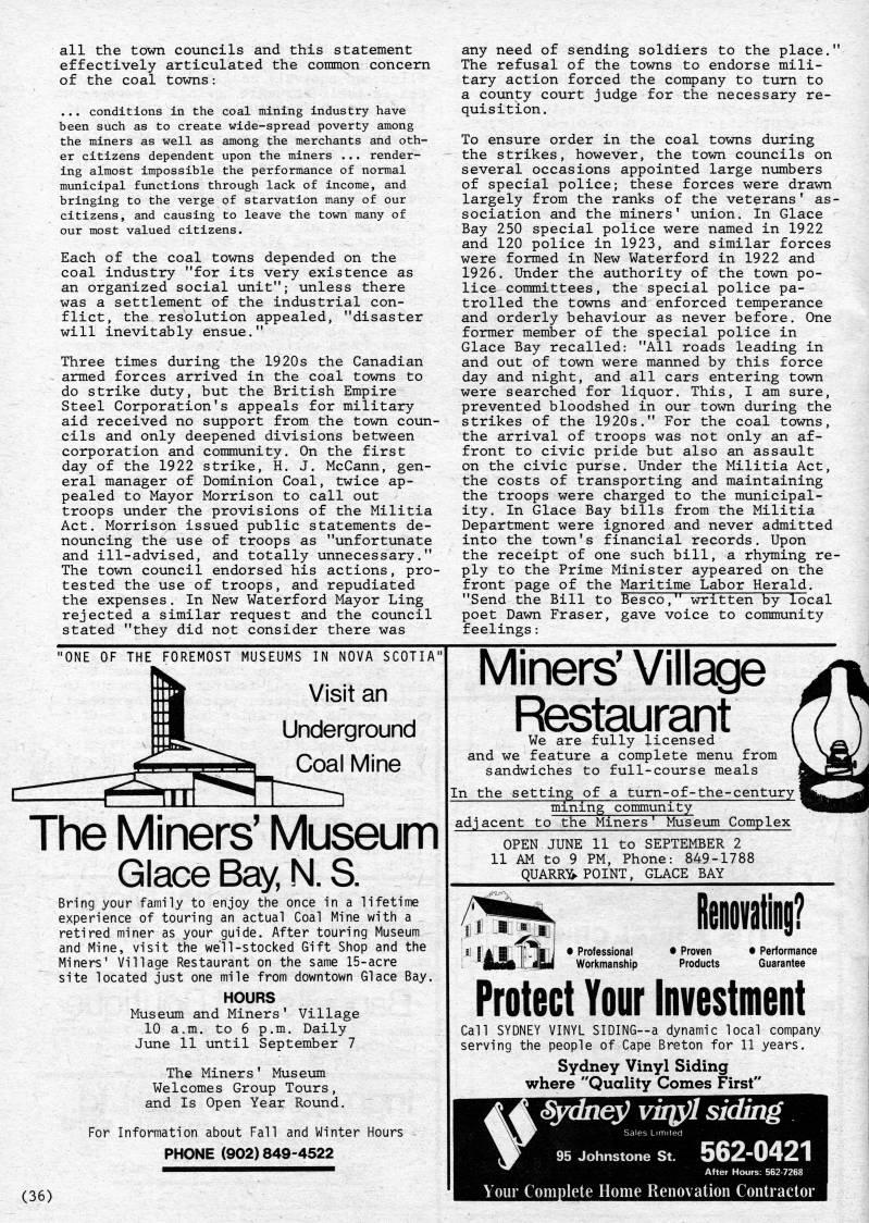Published by Ronald Caplan on 1984/8/1 (329 reads)all the town councils and this statement effectively articulated the common concern of the coal towns: ... conditions in the coal mining industry have been such as to create wide-spread poverty among the miners as well as among the merchants and oth? er citizens dependent upon the miners ... render? ing almost impossible the performance of normal municipal functions through lack of income, and bringing to the verge of starvation many of our citizens, and causing to leave the town many of our most valued citizens. Each of the coal towns depended on the coal industry "for its very existence as an organized social unit"; unless there was a settlement of the industrial con? flict, the resolution appealed, "disaster will inevitably ensue." Three times during the 1920s the Canadian armed forces arrived in the coal towns to do strike duty, but the British Empire Steel Corporation's appeals for military aid received no support from the town coun? cils and only deepened divisions between corporation and community. On the first day of the 1922 strike, H. J. McCann, gen? eral manager of Dominion Coal, twice ap? pealed to Mayor Morrison to call out troops under the provisions of the Militia Act. Morrison issued public statements de? nouncing the use of troops as "unfortunate and ill-advised, and totally unnecessary." The town council endorsed his actions, pro? tested the use of troops, and repudiated the expenses. In New Waterford Mayor Ling rejected a similar request and the council stated "they did not consider there was any need of sending soldiers to the place." The refusal of the towns to endorse mili? tary action forced the company to turn to a county court judge for the necessary re? quisition. To ensure order in the coal towns during the strikes, however, the town councils on several occasions appointed large numbers of special police; these forces were drawn largely from the ranks of the veterans' as? sociation and the miners' union. In Glace Bay 250 special police were named in 1922 and 120 police in 1923, and similar forces were formed in New Waterford in 1922 and 1926. Under the authority of the town po? lice committees, the special police pa? trolled the towns and enforced temperance and orderly behaviour as never before. One former member of the special police in Glace Bay recalled: "All roads leading in and out of town were manned by this force day and night, and all cars entering town were searched for liquor. This, I am sure, prevented bloodshed in our town during the strikes of the 1920s." For the coal towns, the arrival of troops was not only an af? front to civic pride but also an assault on the civic purse. Under the Militia Act, the costs of transporting and maintaining the troops were charged to the municipal? ity. In Glace Bay bills from the Militia Department were ignored and never admitted into the town's financial records. Upon the receipt of one such bill, a rhyming re? ply to the Prime Minister aypeared on the front page of the Maritime Labor Herald. "Send the Bill to Besco," written by local poet Dawn Fraser, gave voice to community feelings: "ONE OF THE FOREMOST MUSEUMS IN NOVA SCOTIA' k. 'S.tJ' Visit an Underground Coal Mine The Miners' Museum Glace Bay, N. S. Bring your family to enjoy the once in a lifetime experience of touring an actual Coal Mine with a retired miner as your guide. After touring Museum and Mine, visit the well-stocked Gift Shop and the Miners' Village Restaurant on the same 15-acre site located just one mile from downtown Glace Bay. HOURS Museum and Miners' Village 10 a.m. to 6 p.m. Daily June 11 until September 7 The Miners' Museum Welcomes Group Tours, and Is Open Year Round. For Information about Fall and Winter Hours PHONE (902) 849-4522 (36) Miners' Village Restaurant We are fully licensed and we feature a complete menu from sandwiches to full-course meals In the setting of a turn-of-the-century mining community adjacent to the Miners' Museum Complex OPEN JUNE 11 to SEPTEMBER 2 11 AM to 9 PM, Phone: 849-1788 QUARRY POINT, GLACE BAY • Professional Workmanship • Proven Products • Performance Guarantee Protect Your Investment Call SYDNEY VINYL SIDING • a dynamic local company serving the people of Cape Breton for 11 years. Sydney Vinyl Siding where "Quality Comes First" Sydnej} vbj'l siding ' Sales Limited 95 Johnstone St. 562-0421 Your ConiDlete Home Renovation Contractor