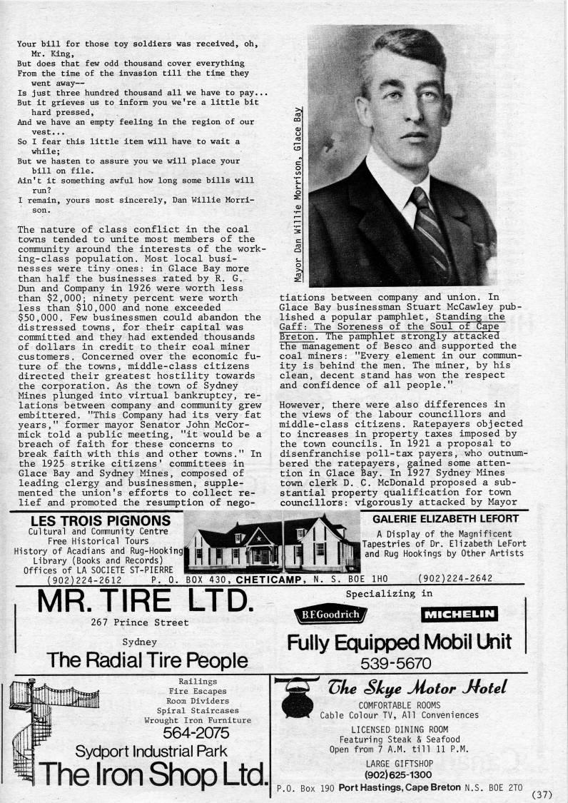 Published by Ronald Caplan on 1984/8/1 (310 reads)Your bill for those toy soldiers was received, oh, Mr. King, But does that few odd thousand cover everything From the time of the invasion till the time they went away • Is just three hundred thousand all we have to pay... But it grieves us to inform you we're a little bit hard pressed. And we have an empty feeling in the region of our vest... So I fear this little item will have to wait a while; But we hasten to assure you we will place your bill on file. Ain't it something awful how long some bills will run? I remain, yours most sincerely, Dan Willie Morri? son. The nature of class conflict in the coal towns tended to unite most members of the community around the interests of the work? ing-class population. Most local busi? nesses were tiny ones: in Glace Bay more than half the businesses rated by R. G. Dun and Company in 1926 were worth less than $2,000; ninety percent were worth less than $10,000 and none exceeded $50,000, Few businessmen could abandon the distressed towns, for their capital was committed and they had extended thousands of dollars in credit to their coal miner customers. Concerned over the economic fu? ture of the towns, middle-class citizens directed their greatest hostility towards the corporation. As the town of Sydney Mines plunged into virtual bankruptcy, re? lations between company and community grew embittered. "This Company had its very fat years," former mayor Senator John McCor? mick told a public meeting, "it would be a breach of faith for these concerns to break faith with this and other towns." In the 1925 strike citizens' committees in Glace Bay and Sydney Mines, composed of leading clergy and businessmen, supple? mented the union's efforts to collect re? lief and promoted the resumption of nego? tiations between company and union. In Glace Bay businessman Stuart McCawley pub? lished a popular pamphlet, Standing the Gaff: The Soreness of the Soul of Cape Breton. The pamphlet strongly attacked the management of Besco and supported the coal miners: "Every element in our commun? ity is behind the men. The miner, by his clean, decent stand has won the respect and confidence of all people." However, there were also differences in the views of the labour councillors and middle-class citizens. Ratepayers objected to increases in property taxes imposed by the town councils. In 1921 a proposal to disenfranchise poll-tax payers, who outnum? bered the ratepayers, gained some atten? tion in Glace Bay. In 1927 Sydney Mines town clerk D. C. McDonald proposed a sub? stantial property qualification for town councillors: vigorously attacked by Mayor LES TROIS PIGNONS Cultural and Community Centre Free Historical Tours History of Acadians and Rug-Hookingi Library (Books and Records) Offices of LA SOCIETE ST-PIERRE (902)224-2612 P. 0. BOX 430, CHETICAMP, GALERIE ELIZABETH LEFORT A Display of the Magnificent Tapestries of Dr. Elizabeth LeFort and Rug Hookings by Other Artists BOE IHO (902)224-2642 MR. TIRE LTD. Specializing in 267 Prince Street C iJilJll'l Sydney The Radial Tire People Fully Equipped Mobil Unit 539-5670 Railings Fire Escapes Room Dividers Spiral Staircases Wrought Iron Furniture 564-2075 Sydport Industrial F'rk The Iron Shop Ltd. l'PT c ZJke Sky.e 'otor J4otel COMFORTABLE ROOMS Cable Colour TV, All Conveniences LICENSED DINING ROOM Featuring Steak & Seafood Open from 7 A.M. till 11 P.M. LARGE GIFTSHOP (902)625-1300 P.O. Box 190 Port Hastings, Cape Breton N.S. BOE 2T0 (37)