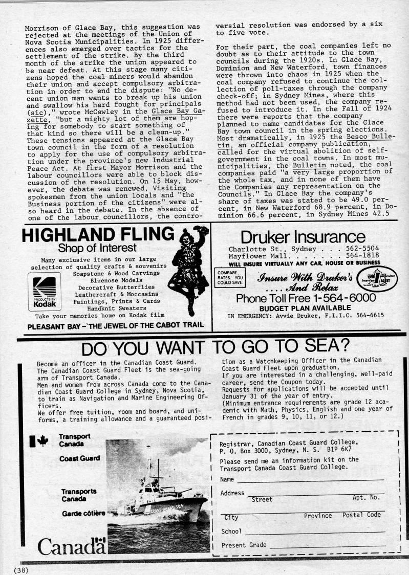 Published by Ronald Caplan on 1984/8/1 (257 reads)Morrison of Glace Bay, this suggestion was rejected at the meetings of the Union of Nova Scotia Municipalities. In 1925 differ? ences also emerged over tactics for the settlement of the strike. By the third month of the strike the union appeared to be near defeat. At this stage many citi? zens hoped the coal miners would abandon their union and accept compulsory arbitra? tion in order to end the dispute: "No de? cent union man wants to break up his union and swallow his hard fought for principals (sic)," wrote McCawley in the Glace Bay Ga? zette, "but a mighty lot of them are hop? ing for somebody to start something of that kind so there will be a clean-up." These tensions appeared at the Glace Bay town council in the form of a resolution to apply for the use of compulsory arbitra? tion under the province's new Industrial Peace Act. At first Mayor Morrison and the labour councillors were able to block dis? cussion of the resolution. On 15 May, how? ever, the debate was renewed. Visiting spokesmen from the union locals and "the Business portion of the citizens" were al? so heard in the debate. In the absence of one of the labour, councillors, the contro? versial resolution was endorsed by a six to five vote. For their part, the coal companies left no doubt as to their attitude to the town councils during the 1920s. In Glace Bay, Dominion and New Waterford, town finances were thrown into chaos in 1925 when the coal company refused to continue the col? lection of poll-taxes through the company check-off; in Sydney Mines, where this method had not been used, the company re? fused to introduce it. In the Fall of 1924 there were reports that the company planned to name candidates for the Glace Bay town council in the spring elections. Most dramatically, in 1925 the Besco Bulle? tin, an official company publication, called for the virtual abolition of self- government in the coal towns. In most mu? nicipalities, the Bulletin noted, the coal companies paid "a very large proportion of the whole tax, and in none of them have the Companies any representation on the Councils." In Glace Bay the company's share of taxes was stated to be 49.0 per? cent, in New Waterford 68.9 percent, in Do? minion 66.6 percent, in Sydney Mines 42.5 HIGHLAND FLING Shop of Interest Many exclusive items in our large selection of quality crafts & souvenirs " 1 Soapstone & Wood Carvings I''H Bluenose Models Decorative Butterflies Leathercraft & Moccasins Paintings, Prints & Cards Handknit Sweaters Take your memories home on Kodak film PLEASANT BAY -THE JEWEL OF THE CABOT TRAIL Druker Insurance Charlotte St., Sydney . . . 562-5504 Mayflower Mall. ...... 564-1818 Will INSURE VIRTUALIY ANY CAR. HOUSE OR BUSINESS COMPARE RATES. YOU COULD SAVE. Phone Toll Free 1-564-6000 BUDGET PLAN AVAILABLE IN EMERGENCY: Awie Druker, F.I.I.C. 564-6615 DO YOU WANT TO GO TO SEA? Become an officer in the Canadian Coast Guard. The Canadian Coast Guard Fleet is the sea-going arm of Transport Canada. Men and women from across Canada come to the Cana? dian Coast Guard College in Sydney, Nova Scotia, to train as Navigation and Marine Engineering Of? ficers. We offer free tuition, room and board, and uni? forms, a training allowance and a guaranteed posi? tion as a Watchkeeping Officer in the Canadian Coast Guard Fleet upon graduation. If you are interested in a challenging, well-paid career, send the Coupon today. Requests for applications will be accepted until January 31 of the year of entry. (Minimum entrance requirements are grade 12 aca? demic with Math, Physics, English and one year of French in grades 9, 10, 11, or 12.) I Transport Canada Coast Guard Transports Canada Garde c6ti're -% r" Canada gistrar, Canadian Coast Guard College, P. 0. Box 3000, Sydney, N. S. BIP 6K7 Please send me an information kit on the Transport Canada Coast Guard College. Name Address City School Street Province Apt. No. Postal Code Present Grade I (38)