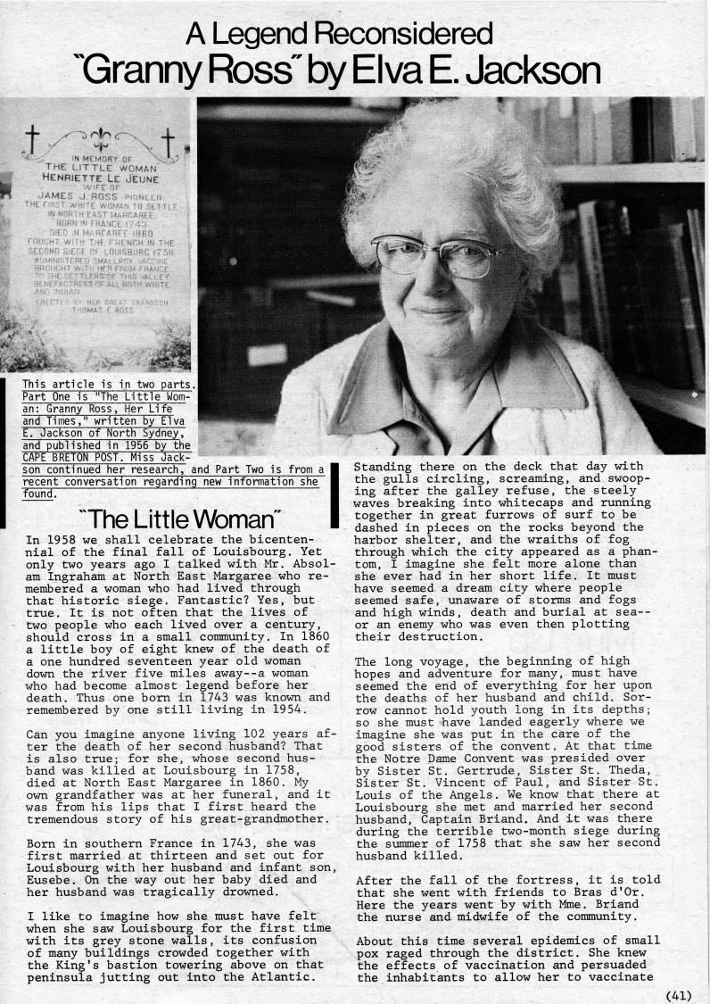 A Legend Reconsidered 'Granny Ross' by Elva E. Jackson t ''n<. THE L , f ft-E /'CMAf, HENRIETTE U JEUNE i'ii This article is 1n two parts. Part One is "The Little Wom? an: Granny Ross, Her Life and Times," written by Elva E. Jackson of North Sydney, and published in 1956 by the CAPE BRETON POST. Miss Jack? son continued her research, and Part Two is from a recent conversation regarding new information she found. The Little Woman" In 1958 we shall celebrate the bicenten? nial of the final fall of Louisbourg. Yet only two years ago I talked with Mr. Absol- am Ingraham at North East Margaree who re? membered a woman who had lived through that historic siege. Fantastic? Yes, but true. It is not often that the lives of two people who each lived over a century, should cross in a small community. In 1860 a little boy of eight knew of the death of a one hundred seventeen year old woman down the river five miles away--a woman who had become almost legend before her death. Thus one bom in 1743 was known and remembered by one still living in 1954. Can you imagine anyone living 102 years af? ter the death of her second husband? That is also true; for she, whose second hus? band was killed at Louisbourg in 1758, died at North East Margaree in 1860. My own grandfather was at her funeral, and it was from his lips that I first heard the tremendous story of his great-grandmother. Born in southern France in 1743, she was first married at thirteen and set out for Louisbourg with her husband and infant son, Eusebe. On the way out her baby died and her husband was tragically drowned. I like to imagine how she must have felt when she saw Louisbourg for the first time with its grey stone walls, its confusion of many buildings crowded together with the King's bastion towering above on that peninsula jutting out into the Atlantic. Standing there on the deck that day with the gulls circling, screaming, and swoop? ing after the galley refuse, the steely waves breaking into whitecaps and running together in great furrows of surf to be dashed in pieces on the rocks beyond the harbor shelter, and the wraiths of fog through which the city appeared as a phan? tom, I imagine she felt more alone than she ever had in her short life. It must have seemed a dream city where people seemed safe, unaware of storms and fogs and high winds, death and burial at sea-- or an enemy who was even then plotting their destruction. The long voyage, the beginning of high hopes and adventure for many, must have seemed the end of everything for her upon the deaths of her husband and child. Sor? row cannot hold youth long in its depths; so she must have landed eagerly where we imagine she was put in the care of the good sisters of the convent. At that time the Notre Dame Convent was presided over by Sister St. Gertrude, Sister St. Theda, Sister St. Vincent of Paul, and Sister St. Louis of the Angels. We know that there at Louisbourg she met and married her second husband. Captain Briand. And it was there during the terrible two-month siege during the summer of 1758 that she saw her second husband killed. After the fall of the fortress, it is told that she went with friends to Bras d'Or. Here the years went by with Itoe. Briand the nurse and midwife of the community. About this time several epidemics of small pox raged through the district. She knew the effects of vaccination and persuaded the inhabitants to allow her to vaccinate (41)