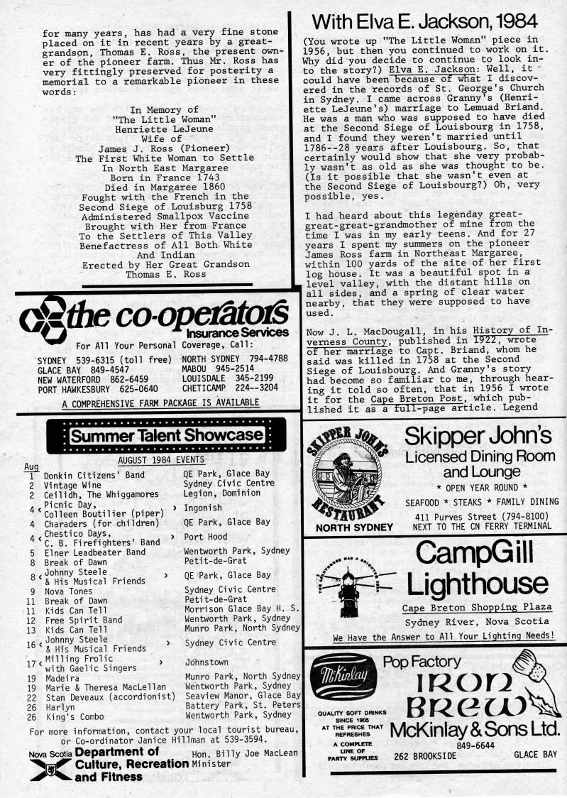 for many years, has had a very fine stone placed on it in recent years by a great- grandson, Thomas E. Ross, the present own? er of the pioneer farm. Thus Mr. Ross has very fittingly preserved for posterity a memorial to a remarkable pioneer in these words: In Memory of "The Little Woman" Henriette LeJeune Wife of James J. Ross (Pioneer) The First White Woman to Settle In North East Margaree Born in France 1743 Died in Margaree 1860 Fought with the French in the Second Siege of Louisburg 1758 Administered Smallpox Vaccine Brought with Her from France To the Settlers of This Valley Benefactress of All Both White And Indian Erected by Her Great Grandson Thomas E. Ross oSrfie coopetMoiS fA Insurance Services '' For All Your Personal Coverage, Call: For All Your Personal Coverage 539-6315 (toll free) SYDNEY GLACE BAY 849-4547 NEW WATERFORD 862-6459 PORT HAWKESBURY 625-0640 NORTH SYDNEY 794-4788 MABOU 945-2514 LOUISDALE 345-2199 CHETICAMP 224-3204 A COMPREHENSIVE FARM PACKAGE IS AVAILABLE I Summer Talent Showcase I AUGUST 1984 EVENTS Aug 1 Donkin Citizens' Band 2 Vintage Wine 2 Ceilidh, The Whiggamores . Picnic Day, Colleen Boutilier (piper) 4 Charaders (for children) . Chestico Days, C. B. Firefighters' Band 5 Elner Leadbeater Band 8 Break of Dawn o . Johnny Steele . & His Musical Friends 9 11 ??11 12 13 Nova Tones Break of Dawn Kids Can Tell Free Spirit Band Kids Can Tell ,g ' Johnny Steele & His Musical Friends 17 < 19 19 22 26 26 Milling Frolic ' with Gaelic Singers Madeira Marie & Theresa MacLellan Stan Deveaux (accordionist) Harlyn King's Combo QE Park, Glace Bay Sydney Civic Centre Legion, Dominion Ingonish QE Park, Glace Bay Port Hood Wentworth Park, Sydney Petit-de-Grat QE Park, Glace Bay Sydney Civic Centre Petit-de-Grat Morrison Glace Bay H. S Wentworth Park, Sydney Munro Park, North Sydney Sydney Civic Centre Johnstown Munro Park, North Sydney] Wentworth Park, Sydney Seaview Manor, Glace B y| Battery Park, St. Pete s Wentworth Park, Sydney For more information, contact your local tourist bureau, or Co-ordinator Janice Hillman at 539-3594. Nova Scotia Department of Hon. Billy Joe MacLean '">(i5ir Culture, Recreation Minister .-'''' and Fitness With Elva E. Jackson, 1984 (You wrote up "The Little Woman" piece in 1956, but then you continued to work on it. Why did you decide to continue to look in? to the story?) Elva E. Jackson: Well, it ' could have been because of what I discov? ered in the records of St. George's Church in Sydney. I came across Granny's (Henri? ette LeJeune's) marriage to Lemuad Briand. He was a man who was supposed to have died at the Second Siege of Louisbourg in 1758, and I found they weren't married until 1786--28 years after Louisbourg. So, that certainly would show that she very probab? ly wasn't as old as she was thought to be. (Is it possible that she wasn't even at the Second Siege of Louisbourg?) Oh, very possible, yes. I had heard about this legenday great- great-great-grandmother of mine from the time I was in my early teens. And for 27 years I spent my summers on the pioneer James Ross farm in Northeast Margaree, within 100 yards of the site of her first log house. It was a beautiful spot in a level valley, with the distant hills on all sides, and a spring of clear water nearby, that they were supposed to have used. Now J. L, MacDougall, in his History of In? verness County, published in 1922, wrote of her marriage to Capt. Briand, whom he said was killed in 1758 at the Second Siege of Louisbourg. And Granny's story had become so familiar to me, through hear? ing it told so often, that in 1956 I wrote it for the Cape Breton Post, which pub? lished it as a full-page article. Legend 4'%. Skipper John's *9'' 't' Licensed Dining Room and Lounge * OPEN YEAR ROUND * j'''''' SEAFOOD * STEAKS * FAMILY DINING ?Ij|l!"S' 411 Purves Street (794-8100) NORTH SYDNEY NEXT TO THE CN FERRY TERMINAL _ CampGill !- Lighthouse Cape Breton Shopping Plaza Sydney River, Nova Scotia We Have the Answer to All Your Lighting Needs! QUALITY SOFT DRINKS SINCE 1905 AT THE PRICE THAT REFRESHES Pop Factory I Ron BReCiJ)' McKinlay&SonsLtd.; A COMPLETE PARTY SUPPUES 262BR00KSIDE 849-6644 GLACE BAY