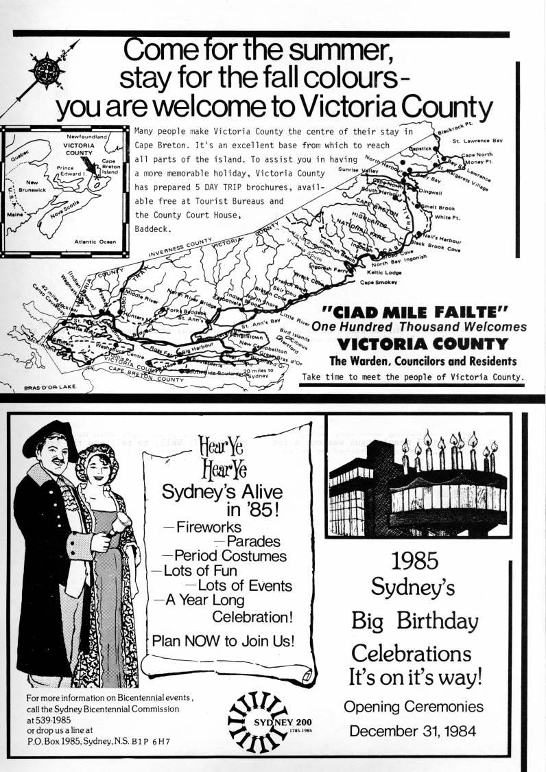 Published by Ronald Caplan on 1984/8/1 (190 reads)Come for the summer, stay for the fall colours- you are welcome to Victoria County St. Lawrance Bay ''CIAD MILE FAILTE'' One Hundred Thousand Wefcomes VICTORIA COUNTY The Warden, Councilors and Residents Take time to meet the people of Victoria County. BRAS 00?? LAKE For more information on Bicentennial events, call the Sydney Bicentennial Commission at 539-1985 or drop us a line at P.O.Box 1985,Sydney,N.S. BIP 6H7 Sydney's Alive in'85! • Fireworks • Parades • Period Costumes • Lots of Fun • Lots of Events • A Year Long Celebration! Plan NOW to Join Us! P' SYqNEY200 1985 Sydney's Big Birthday Celebrations It's on it's way! Opening Ceremonies December 31,1984