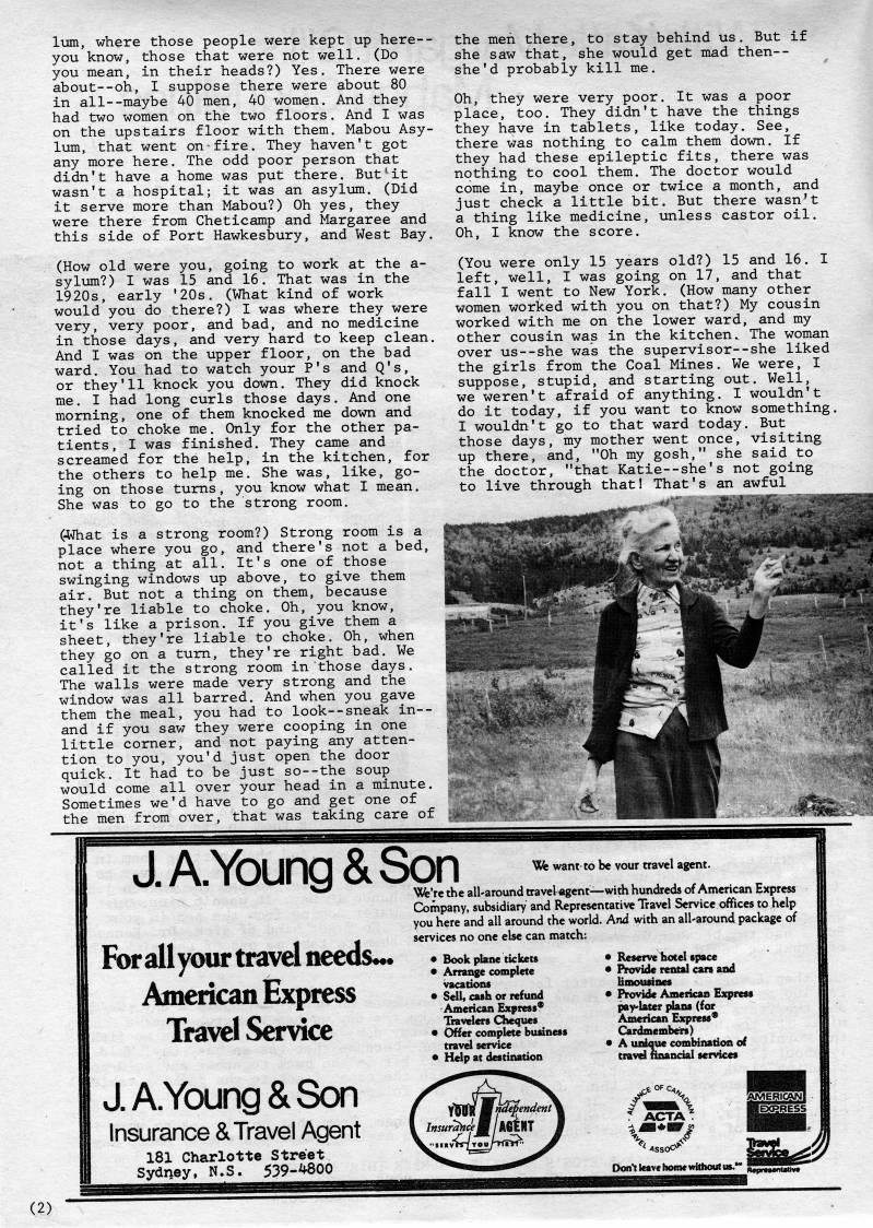 lum, where those people were kept up here-- you know, those that were not well. (Do you mean, in their heads?) Yes. There were about--oh, I suppose there were about 80 in all--maybe 40 men, 40 women. And they had two women on the two floors. And I was on the upstairs floor with them. Mabou Asy? lum, that went on fire. They haven't got any more here. The odd poor person that didn't have a home was put there. But"'it wasn't a hospital; it was an asylum. (Did it serve more than Mabou?) Oh yes, they were there from Cheticamp and Margaree and this side of Port Hawkesbury, and West Bay. (How old were you, going to work at the a- sylum?) I was 15 and 16. That was in the 1920s, early '20s. (What kind of work would you do there?) I was where they were very, very poor, and bad, and no medicine in those days, and very hard to keep clean. And I was on the upper floor, on the bad ward. You had to watch your P's and Q's, or they'll knock you down. They did knock me. I had long curls those days. And one morning, one of them knocked me down and tried to choke me. Only for the other pa? tients, I was finished. They came and screamed for the help, in the kitchen, for the others to help me. She was, like, go? ing on those turns, you know what I mean. She was to go to the strong room. (-What is a strong room?) Strong room is a place where you go, and there's not a bed, not a thing at all. It's one of those swinging windows up above, to give them air. But not a thing on them, because they're liable to choke. Oh, you know, it's like a prison. If you give them a sheet, they're liable to choke. Oh, when they go on a turn, they're right bad. We called it the strong room in those days. The walls were made very strong and the window was all barred. And when you gave them the meal, you had to look--sneak in-- and if you saw they were cooping in one little corner, and not paying any atten? tion to you, you'd just open the door quick. It had to be just so--the soup would come all over your head in a minute. Sometimes we'd have to go and get one of the men from over, that was taking care of the men there, to stay behind us. But if she saw that, she would get mad then-- she'd probably kill me. Oh, they were very poor. It was a poor place, too. They didn't have the things they have in tablets, like today. See, there was nothing to calm them down. If they had these epileptic fits, there was nothing to cool them. The doctor would come in, maybe once or twice a month, and just check a little bit. But there wasn't a thing like medicine, unless castor oil. Oh, I know the score. (You were only 15 years old?) 15 and 16. I left, well, I was going on 17, and that fall I went to New York. (How many other women worked with you on that?) My cousin worked with me on the lower ward, and my other cousin was in the kitchen. The woman over us--she was the supervisor--she liked the girls from the Coal Mines. We were, I suppose, stupid, and starting out. Well, we weren't afraid of anything. I wouldn't do it today, if you want to know something. I wouldn't go to that ward today. But those days, my mother went once, visiting up there, and, "Oh my gosh," she said to the doctor, "that Katie--she's not going to live through that! That's an awful J.A.Young&Son; Vtfe want to be vour travel agent. For all your travel needs*.. American Express Travel Service J. A. Young & Son Insurance &Travel; Agent 181 Charlotte Street Sydney, N.S. 539-'800 We're the all-around travel agent • with hundreds of American Express Company, subsidiary and Representative Travel Service offices to help you here and all around the world. And with an all-around package of services no one else can match: • Book plane tickets • Arrange complete vacations • Sell* cash or refund American Express? Travelers Cheques • Offer complete business travel service • Help at destination • Reserve hotel space • Provide remal cars and limousines • Provide American Express pay'later |dans (for American Express* Girdmembeirs) • A unique combiitation of travd financial services /l ACTA* Don't leave home wittKWt us." (2)