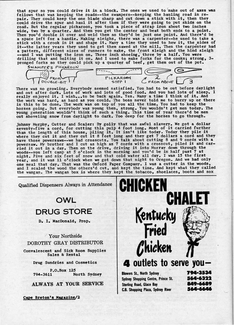 Published by Ronald Caplan on 1974/3/1 (859 reads)that spur so you could drive it in a block. The ones we used to make out of axes was fellows that was keeping the roads • the swampers • keeping the hauling road in re? pair. They could keep the one blade sharp and cut down a stick with it, then they could drive the spur and haul it after them if they were going to put skids on the road. But the regular pickaroon, you took a piece of strap iron about two inches wide, two by a quarter. And then you get the center and beat both ends to a point. Then you'd double it over and weld them so they'd be just one point. And there'd be a space left for a handle. Making sleighs, there was a carpenter • he used to take a stick with a crook in it and shape it. Many a time they used to hew it, the sides of it • the latter years they used to get them sawed at the mill. Then the carpenter had a pattern, different sizes of runners to make, the front sleigh and the hind sleigh • and I was putting the iron on. Three inch shoeing,* three by a half. You were drilling that and bolting it on. And I used to make forks for the cooks; strong, 3- pronged forks so they could pick up a quarter of beef, get them out of the pot, S' AM Peril's Pi'KAgooN' " I '"' L. J s.Te-p I There was no growling. Everybody seemed satisfied. You had to be out before daylight and out after dark. Lots of work and lots of good food. And you had lots of sleep, I really enjoyed it, I wish,,,to be back again. Yes. Many a time I think of it. And the work was hard, as hard as you could. The boss never told me to hurry up or there is this to be done. The work was oh top of you all the time. You had to keep the horses going. But everybody was young then, strong. You wouldn't get men today. The young generation wouldn't think of such a thing. This time of year there'd be men out shoveling snow from daylight to dark. Too deep for the horses to go through, Johnny Murphy, Cutter and Scaler: By golly that was awful slavery. We got a dollar seventy-five a cord, for cutting this pulp 4 foot long. Most of it carried further than the length of this house, piling it. It isn't like today. Today they pile it where they cut it and they cut it 8 feet long and they get 7 dollars a cord and they have those powersaws • we had crosscuts. You talk about cutting 8 and 9 cords with a powersaw. My brother and I cut as high as 7 cords with a crosscut, piled it and car? ried it out in a day. Then on the drive, driving it into Murray down through the woods • you left camp at 5 o'clock in the morning and you'd be in half past 7 at night. Five and six feet of snow and that cold water all day. I was 15 the first year, and it was 11 o'clock when we got down that night to Oregon, And we had only one meal that day. That was the Oxford Paper Company, I was a cutter in the woods, and I scaled the wood the others'd cut, and kept the time. And kept what they called the wangan. The wangan box is where they kept the tobacco, shoelaces, boots and sox Qualified Dispensers Always in Attendance OWL DRUG STORE D* I? MacDonald, Prop. Your Northside DOROTHY GRAY DISTRIBUTOR Convalescent and Sick Room Supplies Sales & Rental Drug Sundries and Cosmetics P.O.Box 125 794-3611 North Sydney ALWAYS AT YOUR SERVICE Cape Breton's Magazine/2 CHICKEN CHALET frid 4 outlets to serve you- Blowers St, North Sydney . Sydney Shopping Centre, Prince St Sterling Road, Glace Bay C.B. Shopping Plaza, Sydney River ??94-3534 564-6322 849-6689