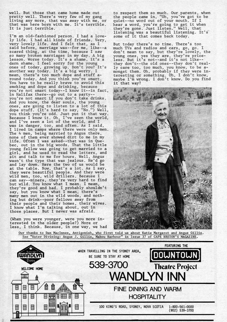 Published by Ronald Caplan on 1985/1/1 (332 reads)to respect them so much. Our parents, when the people came in, "Oh, you've got to be quiet--no word out of your mouth. If I hear a word, you're going to get it when they're gone. Just listen." Well, that listening was a beautiful listening. It's~ some of it that comes back today. But today there's no time. There's too much TVs and radios and cars, go, go. I don't mean to say, but they're lovely, the young ones, yes they are, they're price? less. But it's not--and it's not like-- they don't--the old ones--they don't real? ly care too, too much, you know, to be a- mongst them. Oh, probably if they were in? teresting or something. Oh, I don't know, maybe I'm wrong. I don't know. Do you find it that way? well. But those that came home made out pretty well. There's very few of my gang living any more, that was away with me, or that was here bom with me. It's terrible. It is just terrible. I'm an old-fashioned person. I had a love? ly life. I had all kinds of friends. Very, very lovely life. And I felt that, as I said before, marriage was--for me, like--a scared thing, at the time, because I saw so many broken marriages in my day. A big lesson. Worse today. It's a shame, it's a darn shame. I feel sorry for the young ones of today, growing up. Don't you? It's another way today. It's a big worry. I mean, there's too much dope and stuff a- round today. And you think you're smart. You have to be really brave to avoid this smoking and dope and drinking, because you're not smart today--I know it--in fact, in Halifax there--go out to a party-- you're not smart if you don't take drinks. And you know, the dear souls, the young ones, are going to listen to a lot of this dope stuff. (It's hard to say, "No.") Well, you think you're odd. Just put it that way. Because I know it. Oh, I've seen the world, and I've seen a lot of the world, and I was in danger, too, and often.. As I said, I lived in camps where there were only men. The 4 men, being married to Angus there, none of them ever showed dirt to me in my life. Often I was asked--that was in Que? bec, out in the big woods. That the little young fellow was going to get married to a girl, and he used to read the letters, and sit and talk to me for hours. Well, Angus wasn't the type that was jealous. He'd go and lay down. Here the two of us would be at the table. Now, that's a lot. As I say, they were beautiful people. And they were wild men, too, wild drillers. Because I can say--miners, they're very hard to find but wild. You know what I mean. I mean, they're good and bad. I probably shouldn't say, but you know what I mean, there's many men out in the wild woods, and noth? ing but drink--poor fellows away from their people and their homes, their wives. I know what I'm talking about, out in those places. But I never was afraid. (When you were younger, were you more in? terested in the older people?) More or less, I think. Because, in one way, we had Our thanks to Dan Maclnnes, Antigonish, who first told us about Katie Margaret and Angus Gillis. See "Water Divining; Angus J. Gillis, Mabou Harbour" in Issue 37 of CAPE BRETON'S MAGAZINE. FEATURING THE lujflnDLvnl WHEN TRAVELLING IN THE SYDNEY AREA, BE SURE TO STAY AT HOME DOUINTOUN WELCOME HOME 539-3700 Theatre Project WANDLYN INN FINE DINING AND WARM HOSPITALITY 100 KING'S ROAD, SYDNEY, NOVA SCOTIA 1-80D-661-0000 (902) 539-3700