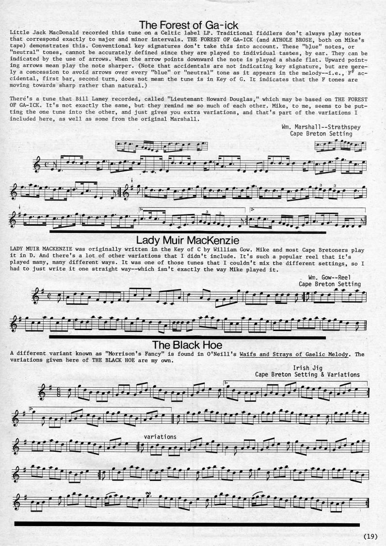 The Forest of Ga-ick Little Jack MacDonald recorded this tune on a Celtic label LP. Traditional fiddlers don't always play notes that correspond exactly to major and minor intervals. THE FOREST OF GA-ICK (and ATHOLE BROSE, both on Mike's tape) demonstrates this. Conventional key signatures don't take this into account. These "blue" notes, or "neutral" tones, cannot be accurately defined since they are played to individual tastes, by ear. They can be indicated by the use of arrows. When the arrow points downward the note is played a shade flat. Upward point? ing arrows mean play the note sharper. (Note that accidentals are not indicating key signature, but are mere? ly a concession to avoid arrows over every "blue" or "neutral" tone as it appears in the melody • i.e., F''' ac? cidental, first bar, second turn, does not mean the tune is in Key of G. It indicates that the F tones are moving towards sharp rather than natural.) There's a tune that Bill Lamey recorded, called "Lieutenant Howard Douglas," which may be based on THE FOREST OF GA-ICK. It's not exactly the same, but they remind me so much of each other. Mike, to me, seems to be put? ting the one tune into the other, and just gives you extra variations, and that's part of the variations I included here, as well as some from the original Marshall. Wm. Marshall--Strathspey Cape Breton Setting Lady Muir MacKenzie LADY MUIR MACKENZIE was originally written in the Key of C by William Gow. Mike and most Cape Bretoners play it in D. And there's a lot of other variations that I didn't include. It's such a popular reel that it's played many, many different ways. It was one of those tunes that I couldn't mix the different settings, so I had to just write it one straight way • which isn't exactly the way Mike played it. Wm. Gow--Reel Cape Breton Setting The Black Hoe A different variant known as "Morrison's Fancy" is found in O'Neill's Waifs and Strays of Gaelic Melody. The variations given here of THE BLACK HOE are my own. Irish Jig Cape Breton Setting & Variations r r ',,'.i.r:'rxj-m-rr'.|j'r iiMiLrtrriiTfrrnrrrtrriiTrr sifrrtrn (19)