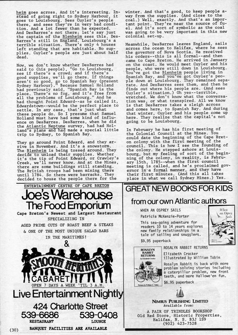 Published by Ronald Caplan on 1985/1/1 (388 reads)heim goes across. And it's interesting. In? stead of going right to Sydney Harbour, it goes to Louisbourg. Sees Cuyler's people there, and sees they're in very bad condi? tion. And a lot fewer than he expected. And DesBarres's not there; let's say just the captain of the Blenheim sees this. Des? Barres's still in England. Louisbourg's a terrible situation. There's only 4 houses left standing that are habitable. No sup? plies. Cuyler's people are just about half dead. Now, we don't know whether DesBarres had said to (his people), "Go to Louisbourg, see if there's a crowd; and if there's good supplies, we'll go there. If things aren't so good, go to Spanish Bay (present Sydney Harbour)." Because Samuel Holland had previously said, "Spanish Bay is the place. There's no fog, and it's free from all the problems of Louisbourg." And he had thought Point Edward--as he called it, Edwardstown--would be the perfect place to settle. In any case, that's just what these people do. So I presume that Samuel Holland must have had some kind of influ? ence on DesBarres. DesBarres, when he did the Atlantic Neptune survey, had had Hol- land's plans and had made a special little trip to Sydney, to Spanish Bay. They go around Point Edward, and they ar? rive in November. And it's a snowstorm. The Blenheim is being tossed around. They decide to unload their supplies. Whether it's the tip of Point Edward, or Crawley's Creek, we'll never know. And at the Mines, there are some buildings still standing. The British troops had been mining there until 1784. So there were barracks. They decided to house the people there for the winter. And that's good, to keep people a- way from the supplies. (And close to the coal.) Well, exactly. And that's an impor? tant point. They're near the source of fu? el. And it's sort of symbolic as the coal was going to be very important in this new colonial set-up. Meanwhile, DesBarres leaves England, sails across the ocean to Halifax, where he sees the governor of Nova Scotia. He received his orders--this is all formal--and then came to Cape Breton. He arrived in January on the coast. He would meet Cuyler and his people, who were still down in Louisbourg. You've got the Blenheim people living in Spanish Bay, and you've got Cuyler's peo? ple down at Louisbourg. They remained sepa? rate. And DesBarres sees them, and then he finds out where his people are. (And sees Cuyler's situation.) Oh yes--terrible, wretched. We don't know what the conversa? tion was, or what transpired. All we know is that DesBarres takes a sleigh across and comes here, to Spanish Bay. And during that winter, Cuyler and his people come up here. They realize that the capital's not going to be Louisbourg. In February he has his first meeting of the Colonial Council at the Mines. You could date the beginning of the Cape Bret? on colony with the first meeting of the council. This is how I see the founding of the colony. He stepped ashore at Louis? bourg, but my feeling of sort of the begin? ning of the colony, in reality, is Febru? ary 15th, 1785--when the first council meeting is called, and he's proclaimed gov? ernor in'a formal manner, and they have their first minutes. (And this all takes place in what we call Sydney Mines.) Yes. ENTERTAINMENT CENTRE OF CAPE BRETON Joe's Vferehouse The Food Emporium Cape Breton's Newest and Largest Restaurant SPECIALIZING IN AGED PRIME CUTS OF ROAST BEEF & STEAKS 6c ONE OF THE MOST UNIQUE SALAD BARS IN THE MARITIMES! i CABARET] OPEN 7 DAYS A WEEK 'TIL 3 A.M. Live Entertainment Nightly| 424 Charlotte Street 539-6686 539-0408 I RESTAURANT LOUNGE (30) BANQUET FACILITIES ARE AVAILABLE GREAT NEW BOOKS FOR KIDS f ronn our own Atlantic authors WHEN AN OSPREY SAILS Patricia McKenzie-Porter This sea-going adventure for readers 10 to 14 years explores new family relationships in a tale of sailing and smugglers. $9.95 paperback W'htri ROSALYN RABBIT RETURNS Elizabeth Crocker illustrated by William Tobin Rosalyn Rabbit is back with more problem solving stories including a caterpillar problem, new front teeth, and more Hallowe'en fun. $6.95 paperback Nimbus Publishing Limited Available from: A PAIR OF TRINDLES BOOKSHOP Old Red Store, Historic Properties, Halifax, N. S. B3J 1S9 (902) 423-7528