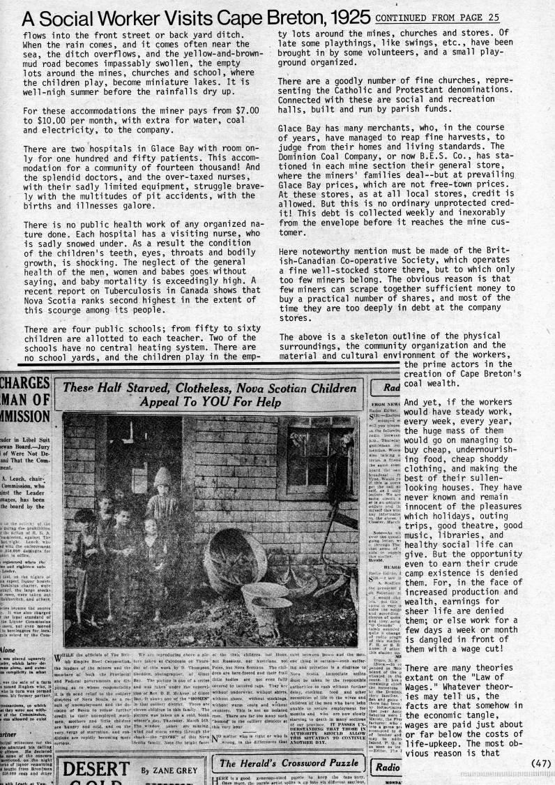 Published by Ronald Caplan on 1985/1/1 (280 reads)A Social Worker Visits Cape Breton, 1925 CONTINUED FROM PAGE 25 flows into the front street or back yard ditch. When the rain conies, and it comes often near the sea, the ditch overflows, and the yellow-and-brown- mud road becomes impassably swollen, the empty lots around the mines, churches and school, where the children play, become miniature lakes. It is well-nigh summer before the rainfalls dry up. For these accommodations the miner pays from $7.00 to $10.00 per month, with extra for water, coal and electricity, to the company. There are two hospitals in Glace Bay with room on? ly for one hundred and fifty patients. This accom? modation for a community of fourteen thousand! And the splendid doctors, and the over-taxed nurses, with their sadly limited equipment, struggle brave? ly with the multitudes of pit accidents, with the births and illnesses galore. There is no public health work of any organized na? ture done. Each hospital has a visiting nurse, who is sadly snowed under. As a result the condition of the children's teeth, eyes, throats and bodily growth, is shocking. The neglect of the general health of the men, women and babes goes without saying, and baby mortality is exceedingly high. A recent report on Tuberculosis in Canada shows that Nova Scotia ranks second highest in the extent of this scourge among its people. There are four public schools; from fifty to sixty children are allotted to each teacher. Two of the schools have no central heating system. There are no school yards, and the children play in the emp- CHARGES, MAN OF AMISSION ~- Thesf> Half Starved, Clotheless, Nova Scotian Children Appeal To YOU For Help ty lots around the mines, churches and stores. Of late some playthings, like swings, etc., have been brought in by some volunteers, and a small play? ground organized. There are a goodly number of fine churches, repre? senting the Catholic and Protestant denominations. Connected with these are social and recreation halls, built and run by parish funds. Glace Bay has many merchants, who, in the course of years, have managed to reap fine harvests, to judge from their homes and living standards. The Dominion Coal Company, or now B.E.S. Co., has sta? tioned in each mine section their general store, where the miners' families deal--but at prevailing Glace Bay prices, which are not free-town prices. At these stores, as at all local stores, credit is allowed. But this is no ordinary unprotected cred? it! This debt is collected weekly and inexorably from the envelope before it reaches the mine cus? tomer. Here noteworthy mention must be made of the Brit? ish-Canadian Co-operative Society, which operates a fine well-stocked store there, but to which only too few miners belong. The obvious reason is that few miners can scrape together sufficient money to buy a practical number of shares, and most of the time they are too deeply in debt at the company stores. The above is a skeleton outline of the physical surroundings, the community organization and the material and cultural environment of the workers, the prime actors in the ' creation of Cape Breton's coal wealth. Rad' And yet, if the workers would have steady work, every week, every year, the huge mass of them would go on managing to buy cheap, undernourish? ing food, cheap shoddy clothing, and making the best of their sullen- looking houses. They have never known and remain innocent of the pleasures which holidays, outing trips, good theatre, good music, libraries, and healthy social life can give. But the opportunity even to earn their crude camp existence is denied them. For, in the face of increased production and wealth, earnings for sheer life are denied them; or else work for a few days a week or month is dangled in front of them with a wage cut! There are many theories extant on the "Law of Wages." Whatever theor? ies may tell us, the facts are that somehow in the economic tangle, wages are paid just about or far below the costs of life-upkeep, the most ob? vious reason is that r> ,rw T%