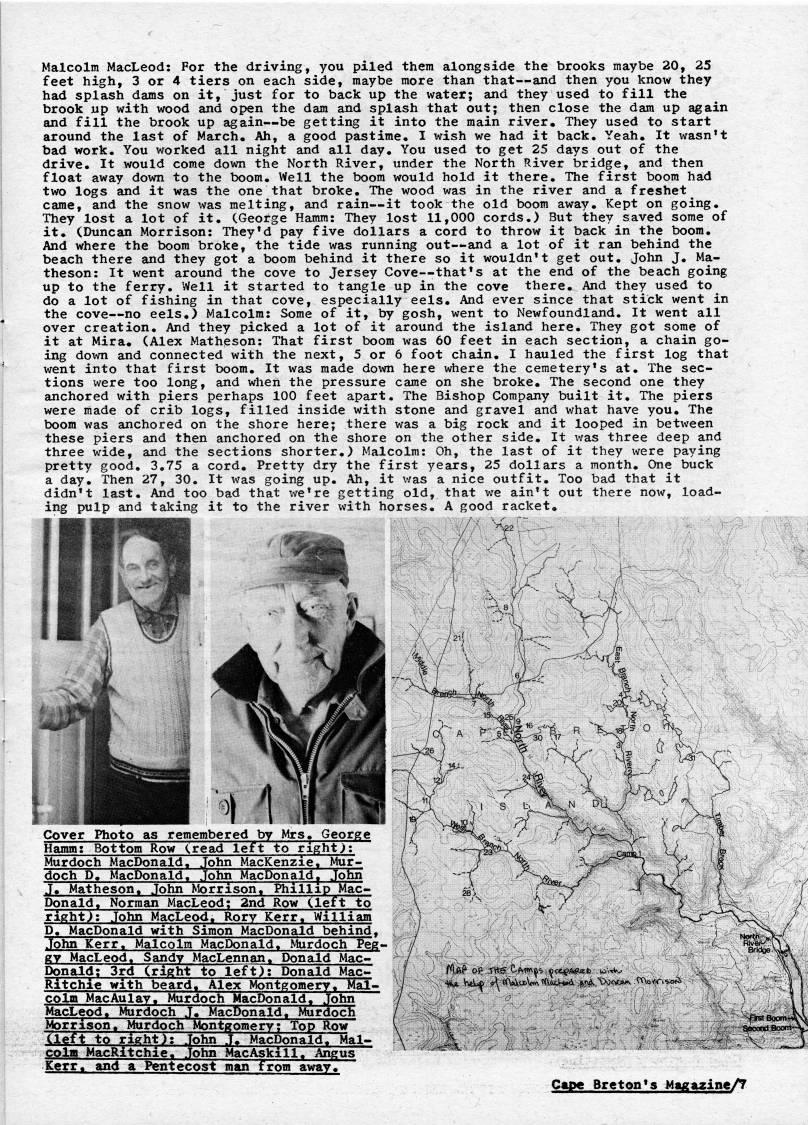 Published by Ronald Caplan on 1974/3/1 (954 reads)Malcolm MacLeod: For the driving, you piled them alongside the brooks maybe 20, 25 feet high, 3 or 4 tiers on each side, maybe more than that • and then you know they had splash dams on it, just for to back up the water; and they used to fill the brook up with wood and open the dam and splash that out; then close the dam up again and fill the brook up again • be getting it into the main river. They used to start around the last of March, Ah, a good pastime, I wish we had it back. Yeah, It wasn*t bad work. You worked all night and all day. You used to get 25 days out of the drive. It would come down the North River, under the North River bridge, and then float away down to the boom. Well the boom would hold it there. The first boom had two logs and it was the one that broke. The wood was in the river and a freshet' came, and the snow was melting, and rain • it took the old boom away. Kept on going. They lost a lot of it. (George Hamm: They lost 11,000 cords.) But they saved some of it. (Duncan Morrison: They'd pay five dollars a cord to throw it back in the boom. And where the boom broke, the tide was running out • and a lot of it ran behind the beach there and they got a boom behind it there so it wouldn't get out. John J. Ma? theson: It went around the cove to Jersey Cove • that's at the end of the beach going up to the ferry. Well it started to tangle up in the cove there. And they used to do a lot of fishing in that cove, especially eels. And ever since that stick went in the cove • no eels.) Malcolm: Some of it, by gosh, went to Newfoundland. It went all over creation. And they picked a lot of it around the island here. They got some of it at Mira, (Alex Matheson: That first boom was 60 feet in each section, a chain go? ing do vn and connected with the next, 5 or 6 foot chain, I hauled the first log that went into that first boom. It was made down here where the cemetery's at. The sec? tions ;vere too long, and when the pressure came on she broke. The second one they anchored with piers perhaps 100 feet apart. The Bishop Company built it. The piers were made of crib logs, filled inside with stone and gravel and what have you. The boom was anchored on the shore here; there was a big rock and it looped in between these piers and then anchored on the shore on the other side. It was three deep and three wide, and the sections shorter.) Malcolm: Oh, the last of it they were paying pretty good. 3.75 a cord. Pretty dry the first years, 25 dollars a month. One buck a day. Then 27, 30. It was going up. Ah, it was a nice outfit. Too bad that it didn't last. And too bad that we're getting old, that we ain't out there now, load? ing pulp and taking it to the river with horses. A good racket. Cover Photo as remembered by Mrs. George Hamm: Bottom Row (read left to right): Murdoch MacDonald. John MacKenzie. Mur? doch D, MacDonald. John MacDonald| John J, Matheson. John Morrison, Phillip Mac? Donald. Norman MacLeod; 2nd Row (left to right); John MacLeod. Rory Kerr. William D, MacDonald with Simon MacDonald behind. John Kerr. Malcolm MacDonald. Murdoch Peg? gy MacLeod. Sandy MacLennan. Donald Mac? Donald; 3rd (right to left); Donald Mac- Ritchie with beard, Alex Montgomery. Mal? colm MacAulay, Murdoch MacDonald, John MacLeod, Murdoch J, MacDonald, MurdocE Morrison. Murdoch Montgomery; Top Row (left to right): John J. MacDonald. Mal- colin MacRitchie, John MacAskill, Angus Kerr, and a Pentecost man from away. Cape Breton's Magazine/?