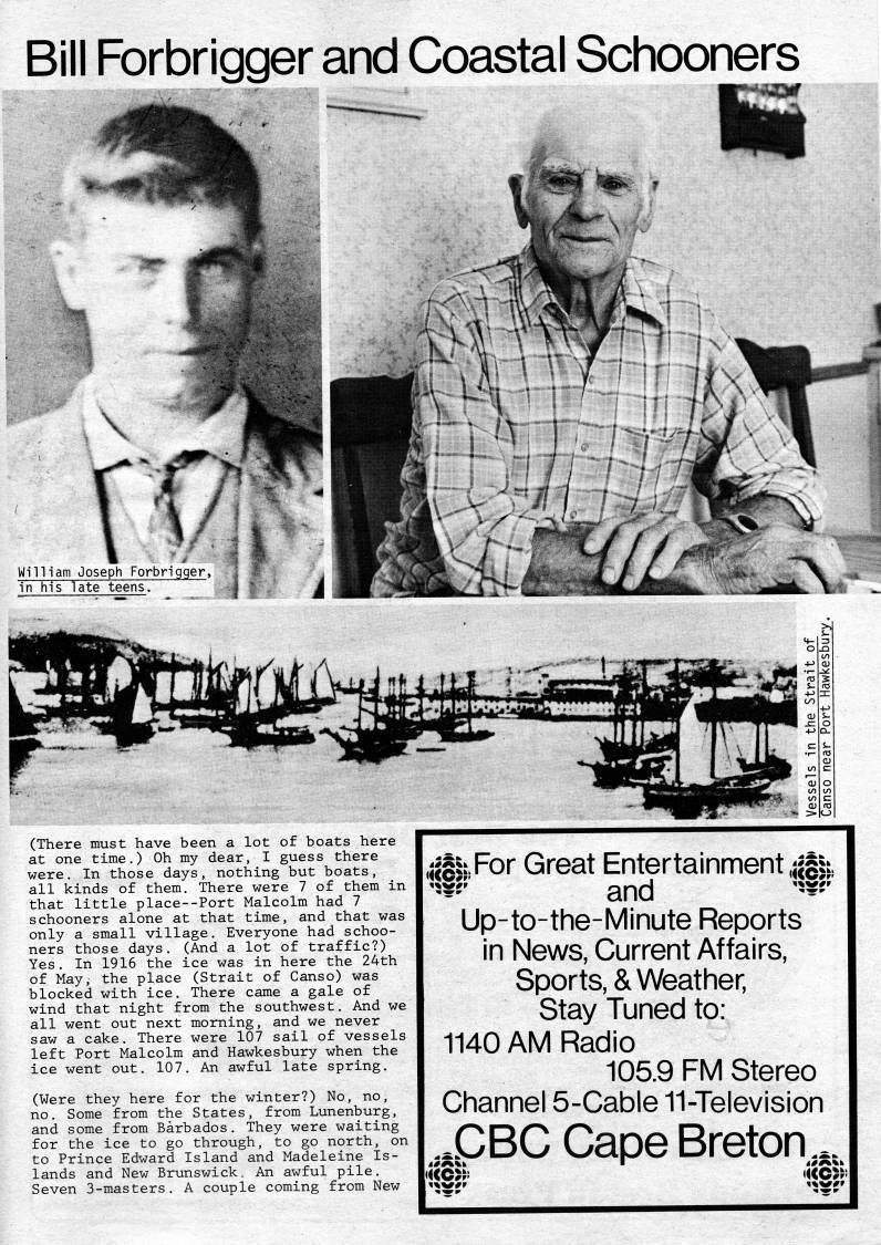 Published by Ronald Caplan on 1985/1/1 (696 reads)Bill Forbrigger and Coastal Schooners (There must have been a lot of boats here at one time.) Oh my dear, I guess there were. In those days, nothing but boats, all kinds of them. There were 7 of them in that little place--Port Malcolm had 7 schooners alone at that time, and that was only a small village. Everyone had schoo? ners those days. (And a lot of traffic?) Yes. In 1916 the ice was in here the 24th of May, the place (Strait of Canso) was blocked with ice. There came a gale of wind that night from the southwest. And we all went out next morning, and we never saw a cake. There were 107 sail of vessels left Port Malcolm and Hawkesbury when the ice went out. 107. An awful late spring. (Were they here for the winter?) No, no, no. Some from the States, from Lunenburg, and some from Barbados. They were waiting for the ice to go through, to go north, on to Prince Edward Island and Madeleine Is? lands and New Brunswick • An awful pile. Seven 3-masters. A couple coming from New (wolSiFor Great Entertainment Jgit. '-'' and ''??' Up-to-the-Minute Reports in News, Current Affairs, Sports, & Weather, Stay Tuned to: 1140 AM Radio 105.9 FM Stereo Channel 5-Cable 11-Television XBC Cape Breton...