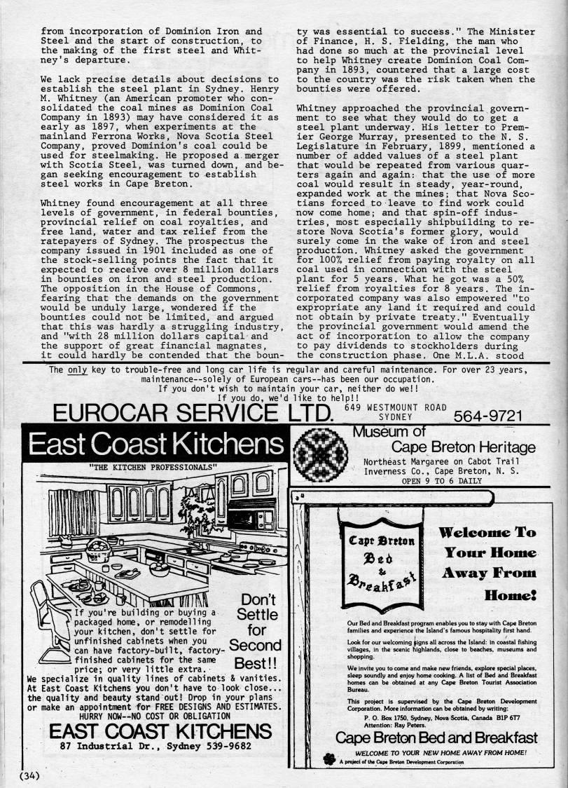 Published by Ronald Caplan on 1985/6/1 (358 reads)from incorporation of Dominion Iron and Steel and the start of construction, to the making of the first steel and Whit? ney 's departure. We lack precise details about decisions to establish the steel plant in Sydney. Henry M. Whitney (an American promoter who con? solidated the coal mines as Dominion Coal Company in 1893) may have considered it as early as 1897, when experiments at the mainland Ferrona Works, Nova Scotia Steel Company, proved Dominion's coal could be used for steelmaking. He proposed a merger with Scotia Steel, was turned down, and be? gan seeking encouragement to establish steel works in Cape Breton. Whitney found encouragement at all three levels of government, in federal bounties, provincial relief on coal royalties, and free land, water and tax relief from the ratepayers of Sydney. The prospectus the company issued in 1901 included as one of the stock-selling points the fact that it expected to receive over 8 million dollars in bounties on iron and steel production. The opposition in the House of Commons, fearing that the demands on the government would be unduly large, wondered if the bounties could not be limited, and argued that this was hardly a struggling industry, and "with 28 million dollars capital and the support of great financial magnates, it could hardly be contended that the boun? ty was essential to success." The Minister of Finance, H. S. Fielding, the man who had done so much at the provincial level to help Whitney create Dominion Coal Com? pany in 1893, countered that a large cost to the country was the risk taken when the bounties were offered. Whitney approached the provincial govern? ment to see what they would do to get a steel plant underway. His letter to Prem? ier George Murray, presented to the N. S. Legislature in February, 1899, mentioned a number of added values of a steel plant that would be repeated from various quar? ters again and again: that the use of more coal would result in steady, year-round, expanded work at the mines; that Nova Sco? tians forced to leave to find work could now come home; and that spin-off indus? tries, most especially shipbuilding to re? store Nova Scotia's former glory, would surely come in the wake of iron and steel production. Whitney asked the government for 100% relief from paying royalty on all coal used in connection with the steel plant for 5 years. What he got was a 50% relief from royalties for 8 years. The in? corporated company was also empowered "to expropriate any land it required and could not obtain by private treaty." Eventually the provincial government would amend the act of incorporation to allow the company to pay dividends to stockholders during the constiniction phase. One M.L.A. stood The only key to trouble-free and long car life is regular and careful maintenance. For over 23 years, maintenance--solely of European cars--has been our occupation. If you don't wish to maintain your car, neither do we!! If you do, we'd like to help!! EUROCAR SERVICE LTD. ''''i]ZV'''? If you're building or buying a packaged home, or remodelling your kitchen, don't settle for !'j unfinished cabinets when you 'f''N can have factory-built, factor: 'L _I finished cabinets for the same Settle for Second Best!! price; or very little extra. We specialize in quality lines of cabinets & vanities. At East Coast Kitchens you don't have to look close... the quality and beauty stand out! Drop in your plans or make an appointment for FREE DESIGNS AND ESTIMATES. HURRY NOW • NO COST OR OBLIGATION EAST COAST KITCHENS 87 Industrial Dr., Sydney 539-9682 564-9721 Museum of Cape Breton Heritage Northeast Margaree on Cabot Trail Inverness Co., Cape Breton, N. S. OPEN 9 TO 6 DAILY J- Capt Btttan Weleome To Tour Home Away From Home! Our Bed and Breakfast program enables you to stay with Cape Breton families and experience the Island's famous hospitality first hand. Lodt for our welcoming iigns all across the Island: in coastal fishing villages, in the scenic highlands, close to beaches, museums and shopping. We invite you to come and make new friends, explore special places, sleep soundly and enjoy home cooking. A list of Bed and Breakfast homes can be obtained at any Cape Breton Tourist Association Bureau. This project is supervised by the Cape Breton Devek>pment Corporation. More information can be obtained by writing: P. O. Box 1750, Sydney, Nova Scotia, Canada BIP 6T7 Attention: Ray Peters. Cape Breton Bed and Breakfast * WELCOME TO YOUR NEW HOME AWAY FROM HOME! P A project of th? Cape Breton Development Corporation (34)