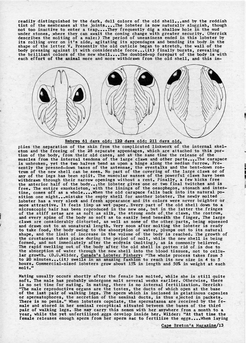 Published by Ronald Caplan on 1974/3/1 (616 reads)readily distinguished by the dark, dull colors of the old shell...and by the reddish tint of the membranes at the joints....The lobster is now naturally sluggish, though not too inactive to enter a trap....They frequently dig a shallow hole in the mud under stones, .where they can await the coming change with greater security. (Herrick describes the molting of a male:) The period of uneasiness ended in this lobster by its rolling over on it's side, agitating its appendages and bending its body in the shape of the letter V. Presently the old cuticle began to stretch, the wall of the body pressing against it with considerable force...(it) finally bursts, revealing the brilliant colors of the new shell....The doubled-up forepart of the body is with each effort of the animal more and more withdrawn from the old shell, and this im- Embryo 61 days old; 122 days old; 211 days old. plies the separation of the skin from the complicated linkwork of the internal skel? eton and the freeing of the 28 separate appendages, which are attached to this por? tion of the body, from their old cases, and at the same time the release of the muscles from the internal tendons of the large claws and other parts....The carapace is unbroken, yet the two halves bend as upon a hinge along the median furrow. Pre? sently the pressed-down bases of the antennae, the eyestalks and the bent-down ros? trum of the new shell can be seen. No part of the covering of the large claws or of any of the legs has been split. The muscular masses of the powerful claws have been withdrawn through their narrow openings without a rent. Finally, a few kicks free the anterior half of the body...the lobster gives one or two final twitches and is free. The entire exoskeleton, with the linings of the oesophegos, stomach and intes? tine, comes off as a whole....When the old carapace falls back into its natural po? sition one might...mistake the empty shell for another lobster. The newly molted lobster has a very sleek and fresh appearance and its colors were never brighter or more attractive. It feels limp as wet paper. Every part of the old shell down to a microscopic hair has been reproduced in the new one, but in the latter the fringes of the stiff setae are as soft as silk, the strong ends of the claws, the rostrum, and every spine of the body so soft as to easily bend beneath the finger. The large claws are considerably distorted, as well as some of the other parts, being squeezed and drawn out to an unnatural length. Very soon after molting the lobster is ready to take food, the body owing to the absorption of water, plumps out to its natural shape, and the limit of increase in the volume of the body is reached. The growth of the crustacean takes place during the period of molt, while the new shell is being formed, and not immediately after the ecdysis (molting), as is commonly believed. The rapid swelling out of the body after the old shell is gotten rid of is due to the absorption of water through the new shell into the blood tissues, not to cellu? lar growth. (D.G.Wilder, Canada's Lobster Fishery; "The whole process takes from 5 to 20 minutes...(it) swells in an amazing fashion to reach its new size in 4 to 5 hours. Commercial-sized lobsters grow about 15% in length and 50% in weight at each molt." Mating usually occurs shortly after the female has molted, while she is still quite soft. The male has probably undergone molt several weeks earlier. Otherwise, there is no set time for mating. In mating, there is no internal fertilization. Herrick: "The male reproductive organs are the testes, the ducts of which open at the base of the last pair of walking legs. The sperm which is inclosed in gelatinous capsules or spermatophores, the secretion of the seminal ducts, is thus ejected in packets. There is no penis." When lobsters copulate, the spermatazoa are received by the fe? male and stored in her seminal receptical situated between the bases of the third pair of walking legs. She may carry this semen with her anywhere from a month to a year, while the yet unfertilized jeggs develop inside h6r. Wilder: "At that time the female releases enough sperm from her sperm sac to fertilize the eggs,...When laying '' Cape Breton's Magazine/13