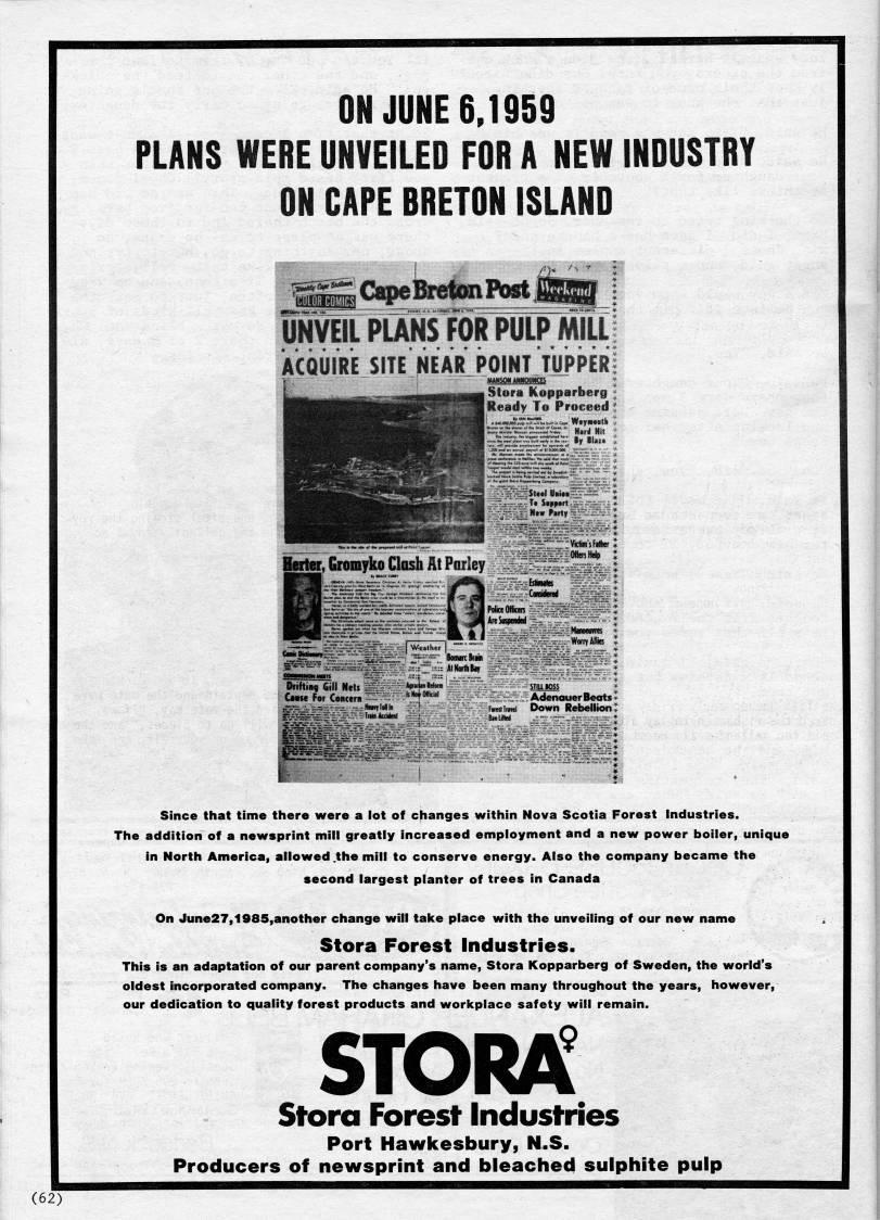 Published by Ronald Caplan on 1985/6/1 (152 reads)0NJUNE6J959 PLANS WERE UNVEILED FOR A NEW INDUSTRY ON CAPE BRETON ISLAND InvIT PLANSIoPIp MILL ACQUIRE SITE NEAR POINT TUPPER ''''''''''''gl • ?-|g • ||g| Stora Kopparberg MHMBHMHlMBMiliiM Ready To Proceed _ • i)l i?t$M;~-.-". *!'?' .- • %mm% ; ftw CwKtit""-':: "?'''"'?' '. ... Adenouer teats i .'l*t' : • ' fxHimti Down RdbeHtoft: Since that time there were a lot of changes within Nova Scotia Forest industries. The addition of a newsprint mill greatly increased employment and a new power boiler, unique in North America, allowed .the mill to conserve energy. Also the company became the second largest planter of trees in Canada On June27,1985,another change will take place with the unveiling of our new name Stora Forest Industries. This is an adaptation of our parent company's name, Stora Kopparberg of Sweden, the world's oldest incorporated company. The changes have been many throughout the years, however, our dedication to quality forest products and worlcplace safety will remain. STORA' Stora Forest Industries Port Hawkesbury, N.S. Producers of newsprint and bieaciied suipliite pulp