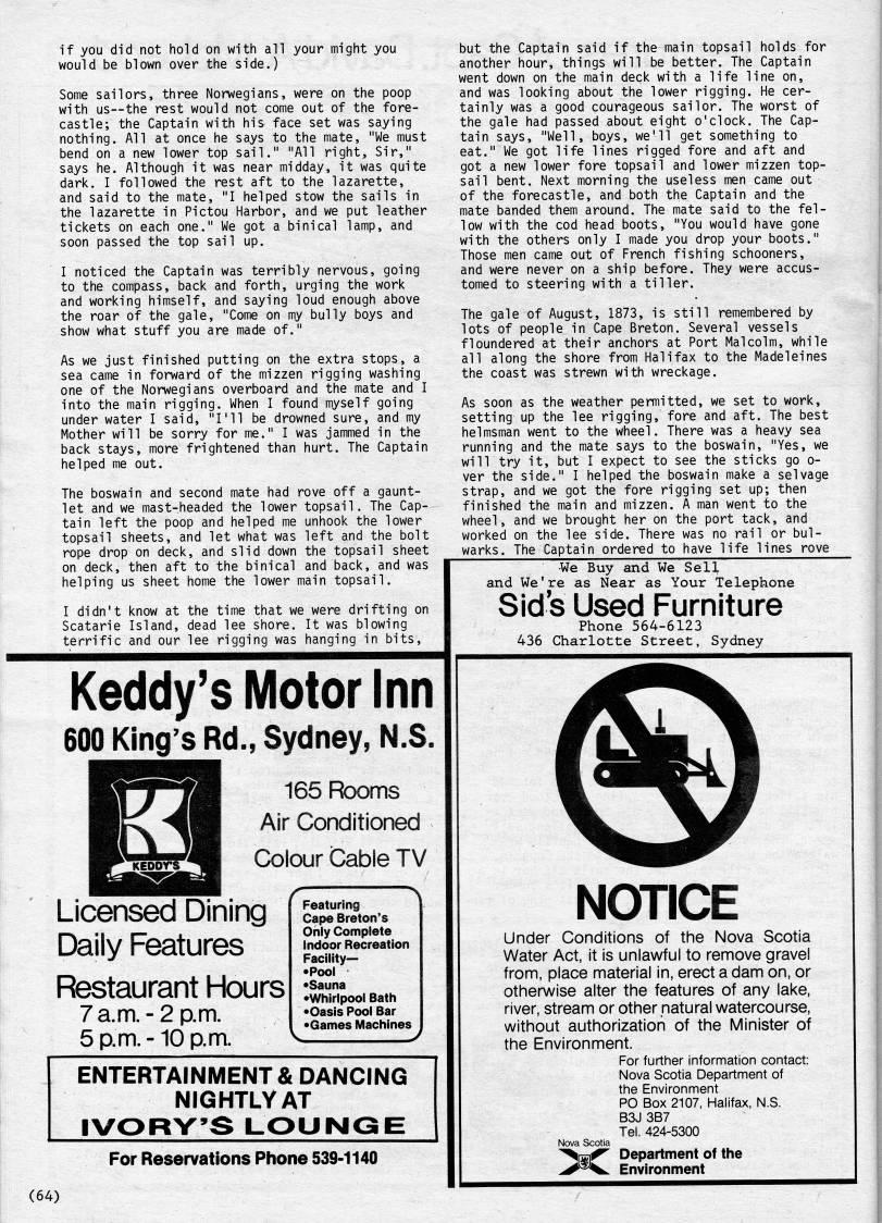 Published by Ronald Caplan on 1985/6/1 (163 reads)if you did not hold on with all your might you would be blown over the side.) Some sailors, three Norwegians, were on the poop with us--the rest would not come out of the fore? castle; the Captain with his face set was saying nothing. All at once he says to the mate, "We must bend on a new lower top sail." "All right. Sir," says he. Although it was near midday, it was quite dark. I followed the rest aft to the lazarette, and said to the mate, "I helped stow the sails in the lazarette in Pictou Harbor, and we put leather tickets on each one." We got a binical lamp, and soon passed the top sail up. I noticed the Captain was terribly nervous, going to the compass, back and forth, urging the work and working himself, and saying loud enough above the roar of the gale, "Come on my bully boys and show what stuff you are made of." As we just finished putting on the extra stops, a sea came in forward of the mizzen rigging washing one of the Norwegians overboard and the mate and I into the main rigging. When I found myself going under water I said, "I'll be drowned sure, and my Mother will be sorry for me." I was jammed in the back stays, more frightened than hurt. The Captain helped me out. The boswain and second mate had rove off a gaunt? let and we mast-headed the lower topsail. The Cap? tain left the poop and helped me unhook the lower topsail sheets, and let what was left and the bolt rope drop on deck, and slid down the topsail sheet on deck, then aft to the binical and back, and was helping us sheet home the lower main topsail. I didn't know at the time that we were drifting on Scatarie Island, dead lee shore. It was blowing terrific and our lee rigging was hanging in bits. but the Captain said if the main topsail holds for another hour, things will be better. The Captain went down on the main deck with a life line on, and was looking about the lower rigging. He cer? tainly was a good courageous sailor. The worst of the gale had passed about eight o'clock. The Cap? tain says, "Well, boys, we'll get something to eat." We got life lines rigged fore and aft and got a new lower fore topsail and lower mizzen top? sail bent. Next morning the useless men came out of the forecastle, and both the Captain and the mate banded them around. The mate said to the fel? low with the cod head boots, "You would have gone with the others only I made you drop your boots." Those men came out of French fishing schooners, and were never on a ship before. They were accus? tomed to steering with a tiller. The gale of August, 1873, is still remembered by lots of people in Cape Breton. Several vessels floundered at their anchors at Port Malcolm, while all along the shore from Halifax to the Madeleines the coast was strewn with wreckage. As soon as the weather permitted, we set to work, setting up the lee rigging, fore and aft. The best helmsman went to the wheel. There was a heavy sea running and the mate says to the boswain, "Yes, we will try it, but I expect to see the sticks go o- ver the side." I helped the boswain make a selvage strap, and we got the fore rigging set up; then finished the main and mizzen. A man went to the wheel, and we brought her on the port tack, and worked on the lee side. There was no rail or bul- warks. The Captain ordered to have life lines rove ??We Buy and We Sell and We're as Near as Your Telephone Sid s Used Furniture Phone 564-6123 436 Charlotte Street, Sydney Keddy's Motor Inn 600 King's Rd., Sydney, N.S. 165 Rooms Air Conditioned Colour Cable TV Licensed Dining Daily Features Restaurant Hours 7 a.m.-2 p.m. 5 p.m.-10 p.m. Featuring Cape Breton's Only Complete Indoor Recreation Facility • • Pool • Sauna • Whirlpool Bath • Oasis Pool Bar • Games Machines ENTERTAINMENT & DANCING NIGHTLY AT IVORY'S LOUNGE For Reservations Phone 539-1140 (64) NOTICE Under Conditions of the Nova Scotia Water Act, it is unlawful to remove gravel from, place material in, erect a dam on, or otherwise alter the features of any lake, river, stream or other natural watercourse, without authorization of the Minister of the Environment. For further information contact: Nova Scotia Department of the Environment PO Box 2107, Halifax, N.S. B3J 387 Tel. 424-5300 >c Department of the Environment