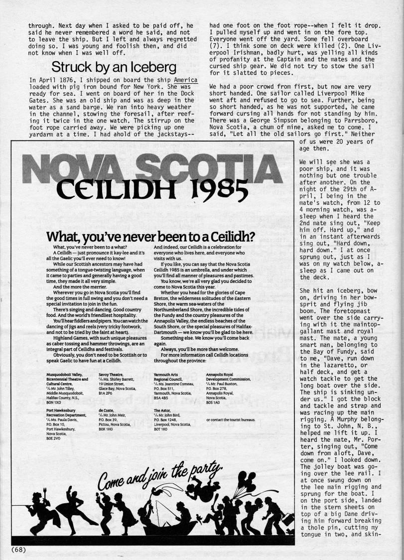 Published by Ronald Caplan on 1985/6/1 (158 reads)through. Next day when I asked to be paid off, he said he never remembered a word he said, and not to leave the ship. But I left and always regretted doing so. I was young and foolish then, and did not know when I was well off. Struck by an Iceberg In April 1876, I shipped on board the ship America loaded with pig iron bound for New York. She was ready for sea. I went on board of her in the Dock Gates. She was an old ship and was as deep in the water as a sand barge. We ran into heavy weather in the channel, stowing the foresail, after reef? ing it twice in the one watch. The stirrup on the foot rope carried away. We were picking up one yardarm at a time. I had ahold of the jackstays • 19" What, you've never been to a Ceilidh? what, you've never been to a what? A Ceilidh • just pronounce it kay-lee and it's all the Gaelic you'll ever need to know! While our Scottish ancestors may have had something of a tongue-twisting language, when it came to parties and generally having a good time, they made it all very simple. And the more the merrier. Wherever you go in Nova Scotia you'll find the good times in full swing and you don't need a special invitation to join in the fun. There's singing and dancing. Good country food. And the world's friendliest hospitality. You'll hearfiddlersandpipers.Youcan watch the dancing of jigs and reels (very tricky footwork, and not to be tried by the faint at heart). Highland Games, with such unique pleasures as caber tossing and hammer throwings, are an integral part of Ceilidhs and festivals. obviously, you don't need to be Scottish or to speak Gaelic to have fun at a Ceilidh. And indeed, our Ceilidh is a celebration for everyone who lives here, and everyone who visits with us. If you like, you can say that the Nova Scotia Ceilidh 1985 is an umbrella, and under which you'll find all manner of pleasures and pastimes. You know, we're all very glad you decided to come to Nova Scotia this year. Whether you head for the glories of Cape Breton, the wilderness solitudes of the Eastern shore, the warm sea-waters of the Northumberland Shore, the incredible tides of the Fundy and the country pleasures of the Annapolis Valley, the endless beaches of the South shore, or the special pleasures of Halifax- Dartmouth • we know you'll be glad to be here. Something else. We know you'll come back again. Always, you'll be more than welcome. For more information call Ceilidh locations throughout the province: Musquodobolt Valley, Bicentennial Tlieatre and Cultural Centre, VoMr.IohnTiUey, Middle Musquodoboit, Halifax County, N.S., BON 1X0 Port Hawkesbury Recreation Department, Vo Ms. Paula Davis, P.O.Box 10, Port Hawkesbury, Nova Scotia, B0E2V0 Savoy Theatre, Vo Ms. Shiriey Barrett, 19 Union Street, Glace Bay, Nova Scotia, B1A2P6 de Coste, VoMr.IohnMeir, P.O. Box 39, Pictou, Nova Scotia, B0K1HO Yarmouth Arts Regional Council, Vo Ms. leannine Comeau, P.O. Box 511, Viarmouth, Nova Scotia, B5A4B5 The Astor, VoMrlohnBird, P.O. Box 1248, Liverpool, Nova Scotia, BOT1K0 Annapolis Royal Development Commission, Vo Mr. Paul Buxton, PO. Box 278, Annapolis Royal, Nova Scotia, BOS1A0 or contact the tourist bureaus. had one foot on the foot rope • when I felt it drop. I pulled myself up and went in on the fore top. Everyone went off the yard. Some fell overboard (7). I think some on deck were killed (2). One Liv? erpool Irishman, badly hurt, was yelling all kinds of profanity at the Captain and the mates and the cursed ship gear. We did not try to stow the sail for it slatted to pieces. We had a poor crowd from first, but now are very short handed. One sailor called Liverpool Mike went aft and refused to go to sea. Further, being so short handed, as he was not supported, he came forward cursing all hands for not standing by him. There was a George Simpson belonging to Parrsboro, Nova Scotia, a chum of mine, asked me to come. I said, "Let all the old sailors go first." Neither of us were 20 years of age then. We will see she was a poor ship', and it was nothing but one trouble after another. On the night of the 29th of A- pril, I being in the mate's watch, from 12 to 4 morning watch, was a- sleep when I heard the 2nd mate sing out, "Keep him off. Hard up," and in an instant afterwards sing out, "Hard down, hard down." I at once sprung out, just as I was on my watch below, a- sleep as I came out on the deck. She hit an iceberg, bow on, driving in her bow? sprit and flying jib boom. The foretopmast went over the side carry? ing with it the maintop- gallant mast and royal mast. The mate, a young smart man, belonging to the Bay of Fundy, said to me, "Dave, run down in the lazaretto, or half deck, and get a watch tackle to get the long boat over the side. The ship is sinking un? der us." I got the block and tackle and strap and was racing up the main rigging. A Murphy belong? ing to St. John, N. B., helped me lift it up. I heard the mate, Mr. Por? ter, singing out, "Come down from aloft, Dave, come on." I looked down. The jolley boat was go? ing over the lee rail. I at once swung down on the lee main rigging and sprung for the boat. I on the port side, landed in the stern sheets on top of a big Dane driv? ing him forward breaking a thole pin, cutting my tongue in two, and skin- (68)