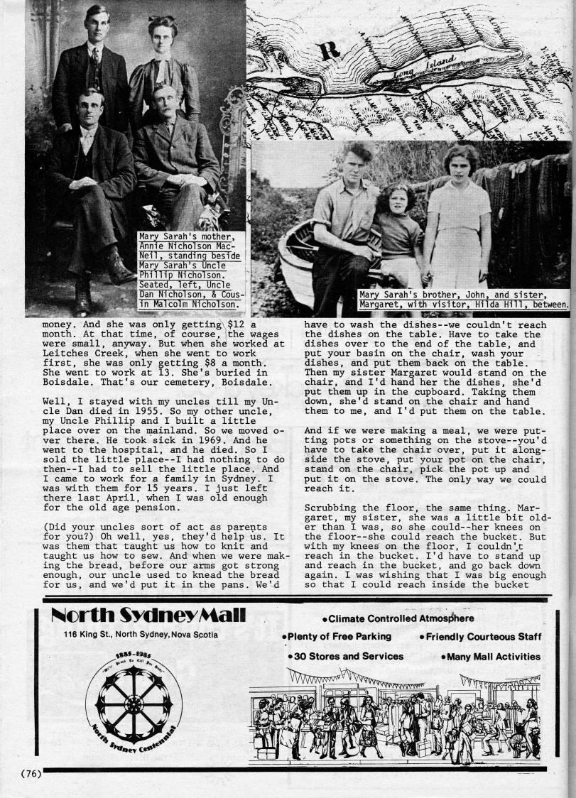 standi ni iMary Sarah's Uncle Phillip NicholsonT Seated, left. Uncle .-.Dan Nicholson, 'in Malcolm Nicholson. money. And she was only getting$12 a month. At that time, of course, ithe wages were small, anyway. But when she worked at Leitches Creek, when she went to work first, she was only getting $8 a month. She went to work at 13. She's buried in Boisdale. That's our cemetery, Boisdale. Well, I stayed with my uncles till my Un? cle Dan died in 1955. So my other uncle, my Uncle Phillip and I built a little place over on the mainland. So we moved o- ver there. He took sick in 1969. And he went to the hospital, and he died. So I sold the little place--I had nothing to do then--I had to sell the little place. And I came to work for a family in Sydney. I was with them for 15 years. I just left there last April, when I was old enough for the old age pension. (Did your uncles sort of act as parents for you?) Oh well, yes, they'd help us. It was them that taught us how to knit and taught us how to sew. And when we were mak? ing the bread, before our arms got strong enough, our uncle used to knead the bread for us, and we'd put it in the pans. We'd Sarah's brother, John, and sister, ret, with visitor, Hilda Hill, between. have to wash the dishes--we couldn't reach the dishes on the table. Have to take the dishes over to the end of the table, and put your basin on the chair, wash your dishes, and put them back on the table. Then my sister Margaret would stand on the chair, and I'd hand her the dishes, she'd put them up in the cupboard. Taking them down, she'd stand on the chair and hand them to me, and I'd put them on the table. And if we were making a meal, we were put? ting pots or something on the stove--you'd have to take the chair over, put it along? side the stove, put your pot on the chair, stand on the chair, pick the pot up and put it on the stove. The only way we could reach it. Scrubbing the floor, the same thing. Mar? garet, my sister, she was a little bit old? er than I was, so she could--her knees on the floor--she could reach the bucket. But with my knees on the floor, I couldn''t reach in the bucket. I'd have to stand up and reach in the bucket, and go back down again. I was wishing that I was big enough so that I could reach inside the bucket Ncrth Sydney Mall 116 King St, North Sydney, Nova Scotia • Climate Controlled Atmosr'here • Plenty of Free Parking • Friendly Courteous Staff • 30 Stores and Services • Many Mall Activities 'Zc'**"" (76)"