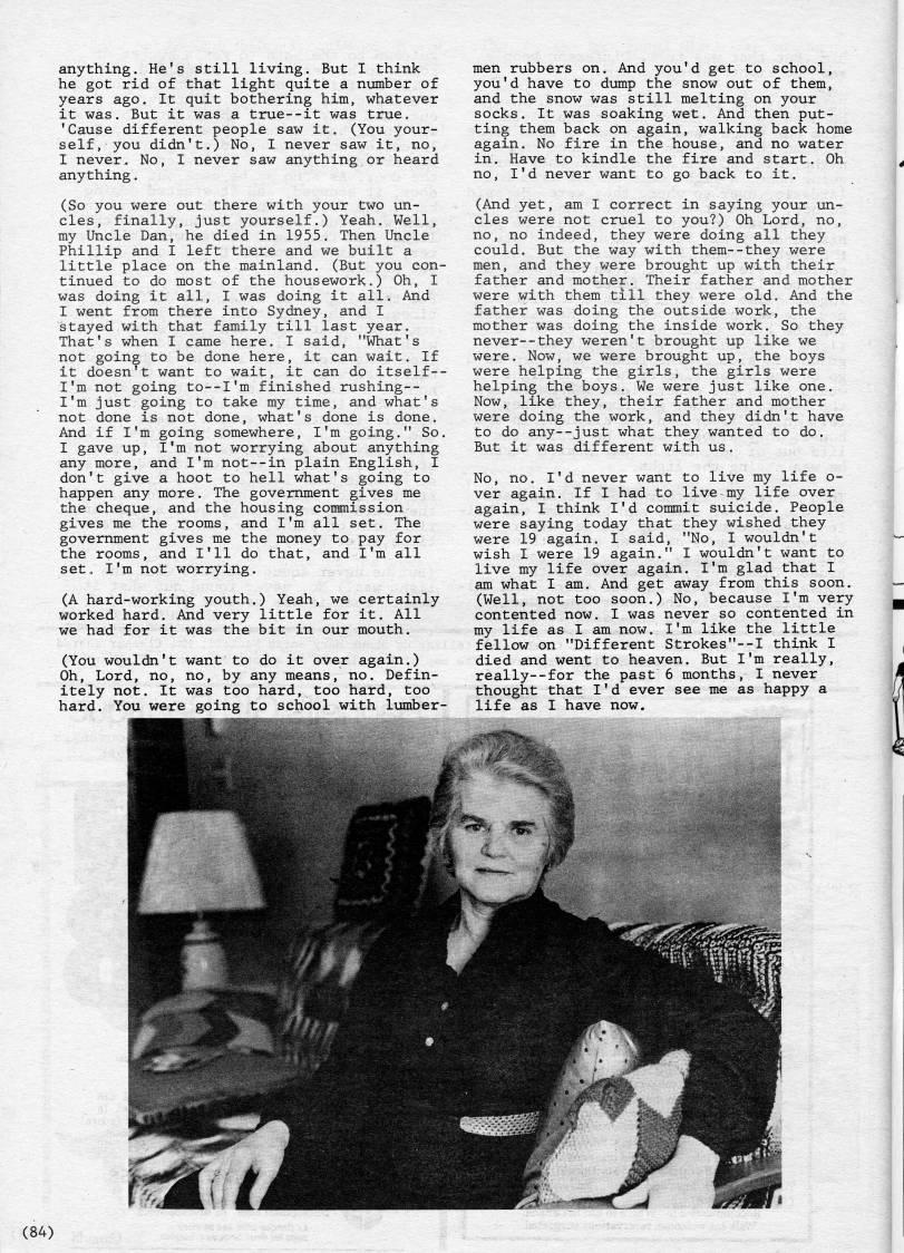 Published by Ronald Caplan on 1985/6/1 (246 reads)anything. He's still living. But I think he got rid of that light quite a number of years ago. It quit bothering him, whatever it was. But it was a true--it was true. 'Cause different people saw it. (You your? self, you didn't.) No, I never saw it, no, I never. No, I never saw anything or heard anything. (So you were out there with your two un? cles, finally, just yourself.) Yeah. Well, my Uncle Dan, he died in 1955. Then Uncle Phillip and I left there and we built a little place on the mainland. (But you con? tinued to do most of the housework.) Oh, I was doing it all, I was doing it all. And I went from there into Sydney, and I stayed with that family till last year. That's when I came here. I said, "What's not going to be done here, it can wait. If it doesn't want to wait, it can do itself-- I'm not going to--I'm finished rushing-- I'm just going to take my time, and what's not done is not done, what's done is done. And if I'm going somewhere, I'm going." So. I gave up, I'm not worrying about anything any more, and I'm not--in plain English, I don't give a hoot to hell what's going to happen any more. The government gives me the cheque, and the housing commission gives me the rooms, and I'm all set. The government gives me the money to pay for the rooms, and I'll do that, and I'm all seto I'm not worrying. (A hard-working youth.) Yeah, we certainly worked hard. And very little for it. All we had for it was the bit in our mouth. (You wouldn't want to do it over again.) Oh, Lord, no, no, by any means, no. Defin? itely not. It was too hard, too hard, too hard. You were going to school with lumber? men rubbers on. And you'd get to school, you'd have to dump the snow out of them, and the snow was still melting on your socks. It was soaking wet. And then put? ting them back on again, walking back home again. No fire in the house, and no water in. Have to kindle the fire and start. Oh no, I'd never want to go back to it. (And yet, am I correct in saying your un? cles were not cruel to you?) Oh Lord, no, no, no indeed, they were doing all they could. But the way with them--they were men, and they were brought up with their father and mother. Their father and mother were with them till they were old. And the father was doing the outside work, the mother was doing the inside work. So they never--they weren't brought up like we were. Now, we were brought up, the boys were helping the girls, the girls were helping the boys. We were just like one. Now, like they, their father and mother were doing the work, and they didn't have to do any--just what they wanted to do. But it was different with us. No, no. I'd never want to live my life o- ver again. If I had to live my life over again, I think I'd commit suicide. People were saying today that they wished they were 19 again. I said, "No, I wouldn't wish I were 19 again." I wouldn't want to live my life over again. I'm glad that I am what I am. And get away from this soon. (Well, not too soon.) No, because I'm very contented now. I was never so contented in my life as I am now. I'm like the little fellow on "Different Strokes"--I think I died and went to heaven. But I'm really, really--for the past 6 months, I never thought that I'd ever see me as happy a life as I have now. (84)