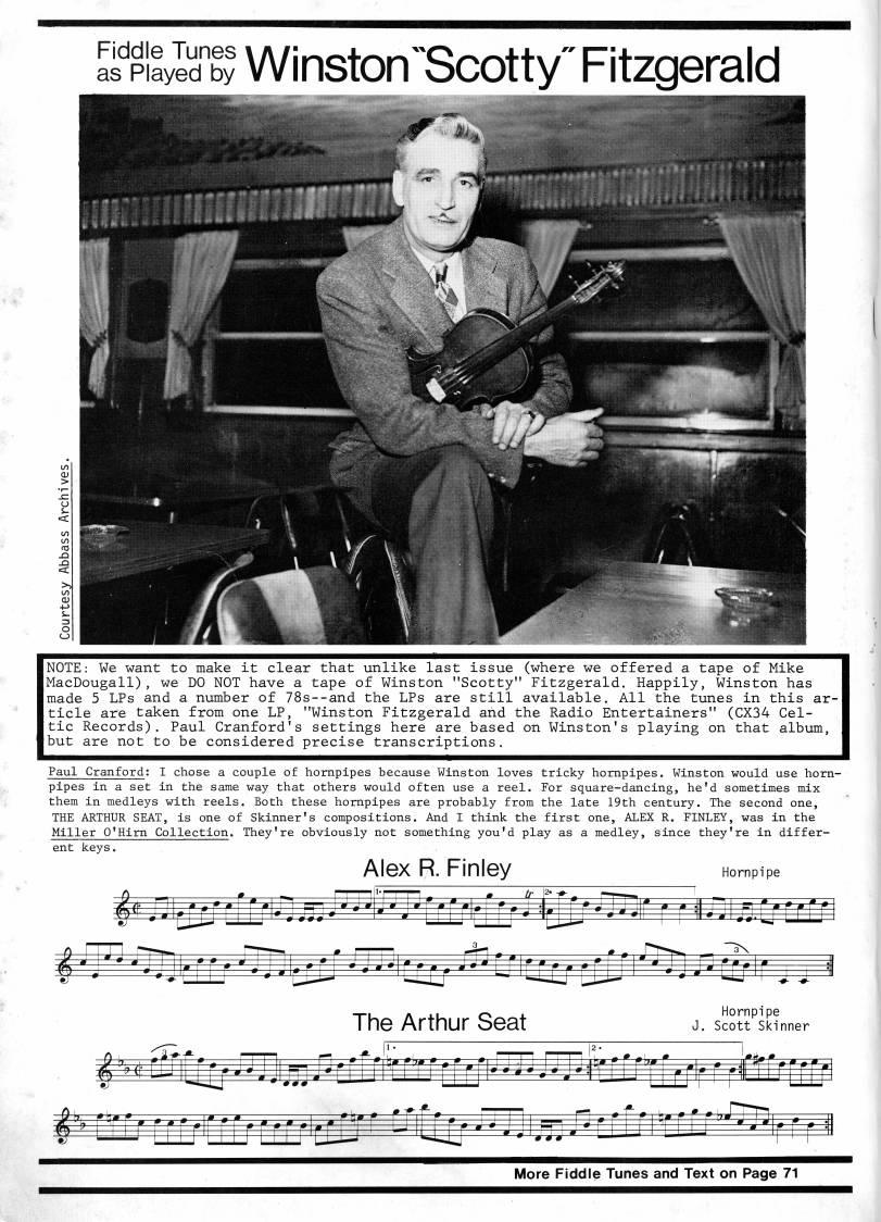 Published by Ronald Caplan on 1985/6/1 (225 reads)'''ilvlTg? Winston"Scotty" Fitzgerald NOTE: We want to make it clear that unlike last issue (where we offered a tape of Mike MacDougall), we DO NOT have a tape of Winston "Scotty" Fitzgerald. Happily, Winston has made 5 LPs and a number of 78s--and the LPs are still available. All the tunes in this ar? ticle are taken from one LP, "Winston Fitzgerald and the Radio Entertainers" (CX34 Cel? tic Records). Paul Cranford's settings here are based on Winston's playing on that album, but are not to be considered precise transcriptions. Paul Cranford; I chose a couple of hornpipes because Winston loves tricky hornpipes. Winston would use horn? pipes in a set in the same way that others would often use a reel. For square-dancing, he'd sometimes mix them in medleys with reels. Both these hornpipes are probably from the late 19th century. The second one, THE ARTHUR SEAT, is one of Skinner's compositions. And I think the first one, ALEX R. FINLEY, was in the Miller O'Hirn Collection. They're obviously not something you'd play as a medley, since they're in differ? ent keys. Alex R. Finley Hornpipe The Arthur Seat Hornpipe J. Scott Skinner i'''msiinWiUj'aa' rri'jT'ii'p'rrnrrr;"'' More Fiddle Tunes and Text on Page 71