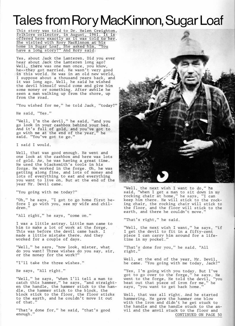 Published by Ronald Caplan on 1985/8/1 (900 reads)Tales from Rory MacKinnon, Sugar Loaf This story was told to Dr. Helen Creighton, folklore collector, in August, 1961. It is offered here exactly as it was told to her. She visited with Rory MacKinnon at his She asked him, "You home in Sugar Loaf ' have a long story?" And Rory said: Yes, about Jack the Lanteren. Did you ever hear about Jack the Lanteren long ago? Well, there was one man once, you know, he--they got married. He wasn't very good in this world. He was in an old new world, I suppose about a thousand years back, and it was long ago. Well, he said he wished the devil himself would come and give him some money or something. After awhile he seen a man walking up from the shore, up from the road. "You wished for me," he told Jack, "today?" He said, "Yes." "Well, I'm the devil," he said, "and you go look in your cashbox behind your bed. And it's full of gold, and you've got to go with me at the end of the year," he said. "You've got to go." I said I would. Well, that was good enough. He went and one look at the cashbox and here was lots of gold. Aw, he was having a great time. He used the blacksmith's tools in his forge. He worked in the forge. Oh, he was getting along fine, and lots of money and lots of everything to eat and everything you want to live on. But at the end of the year Mr. Devil came. "You going with me today?" "Oh," he says, "I got to go home first be? fore I go with you, see my wife and chil? dren. " "All right," he says, "come on." I was a little astray. Little man came to him to make a lot of work at the forge. This was before the devil came back. I made a little mistake there. And they worked for a couple of days. "Well," he says, "now look, mister, what do you want? Three wishes do you say, sir, or the money for the work?" "I'll take the three wishes." He says, "All right." "Well," he says, "when I'll tell a man to catch this hammer," he says, "and straight? en the handle, the hammer stick to the han? dle, the hammer stick to the block, the block stick to the floor, the floor sticks to the earth, and he couldn't move it out of that." "That's done for," he said, "that's good enough." "Well, the next wish I want to do," he said, "when I get a man to sit down in my rocking chair at home," he says, "I can keep him there. He will stick to the rock? ing chair, the rocking chair will stick to the floor, and the floor will stick to the earth, and there he couldn't move." "That's right," he said. "Well, the next wish I want," he says, "if I get the devil to fit in a fifty-cent piece I can carry him around for a life? time in my pocket." "That's done for you, right." he said. "All Well, at the end of the year, Mr. Devil, he came. "You going with me today. Jack?" "Yes, I'm going with you today. But I've got to go over to the forge," he says. He went to the forge. He told the devil, "you beat out that piece of iron for me," he says, "you want to get back home." Well, that was all right. And he started hammering. He gave the hammer one blow with the iron and didn't he get stuck to the handle and the handle stuck to the an? vil and the anvil stuck to the floor and