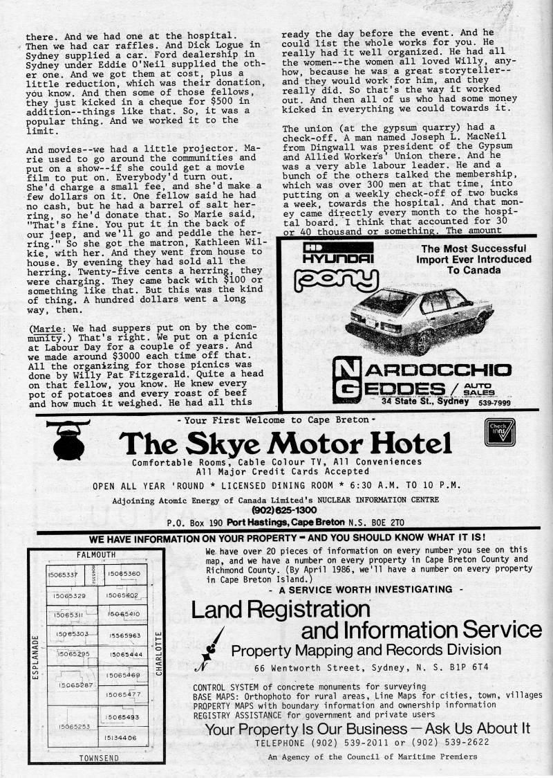 there. And we had one at the hospital. ' Then we had car raffles. And Dick Logue in Sydney supplied a car. Ford dealership in Sydney under Eddie O'Neil supplied the oth? er one. And we got them at cost, plus a little reduction, which was their donation, you know. And then some of those fellows, they just kicked in a cheque for $500 in addition--things like that. So, it was a popular thing. And we worked it to the limit. And movies--we had a little projector. Ma? rie used to go around the communities and put on a show--if she could get a movie film to put on. Everybody'd turn out. She'd charge a small fee, and she'd make a few dollars on it. One fellow said he had no cash, but he had a barrel of salt her? ring, so he'd donate that. So Marie said, "That's fine. You put it in the back of our jeep, and we'll go and peddle the her? ring." So she got the matron, Kathleen Wil- kie, with her. And they went from house to house. By evening they had sold all the herring. Twenty-five cents a herring, they were charging. They came back with $100 or something like that. But this was the kind of thing. A hundred dollars went a long way, then. (Marie: We had suppers put on by the com? munity.) That's right. We put on a picnic at Labour Day for a couple of years. And we made around $3000 each time off that. All the organizing for those picnics was done by Willy Pat Fitzgerald. Quite a head on that fellow, you know. He knew every pot of potatoes and every roast of beef and how much it weighed. He had all this ready the day before the event. And he could list the whole works for you. He really had it well organized. He had all the women--the women all loved Willy, any? how, because he was a great storyteller-- and they would work for him, and they really did. So that's the way it worked out. And then all of us who had some money kicked in everything we could towards it. The union (at the gypsum quarry) had a check-off. A man named Joseph L. MacNeil from Dingwall was president of the Gypsum and Allied Workers' Union there. And he was a very able labour leader. He and a bunch of the others talked the membership, which was over 300 men at that time, into putting on a weekly check-off of two bucks a week, towards the hospital. And that mon? ey came directly every month to the hospi? tal board. I think that accounted for 30 or 40 thousand or something. The amount HYUnOPII The Most Successful Import Ever introduced To Canada AROOCCHIO EOPSS / 'Zik ' 34 State St., Sydney 539-7999 ??- Your First Welcome to Cape Breton * The Skye Motor Hotel Comfortable Rooms, Cable Colour TV, All Conveniences All Major Credit Cards Accepted OPEN ALL YEAR 'ROUND * LICENSED DINING ROOM * 6:30 A.M. TO 10 P.M. Adjoining Atomic Energy of Canada Limited's NUCLEAR INFORMATION CENTRE (902)625-1300 P.O. Box 190 Port Hastings,Cape Breton N.S. BOE 2T0 WE HAVE INFORMATION ON YOUR PROPERTY - AND YOU SHOULD KNOW WHAT IT IS! We have over 20 pieces of information on every number you see on this map, and we have a number on every property in Cape Breton County and Richmond County. (By April 1986, we'll have a number on every property in Cape Breton Island.) - A SERVICE WORTH INVESTIGATING - 15065337- i 15065329 I50653II '' - 150 65303 "15065295 15065$87' 15065360 15065402 15065410 15565963 15065444 15065469 15065477 15065493 15134406 Land Registration / and Information Service ' Property Mapping and Records Division jy 66 Wentworth Street, Sydney, N. S. BIP 6T4 CONTROL SYSTEM of concrete monuments for surveying BASE MAPS: Orthophoto for rural areas, Line Maps for cities, town, villages PROPERTY MAPS with boundary information and ownership information REGISTRY ASSISTANCE for government and private users Your Property Is Our Business -Ask Us About It TELEPHONE (902) 539-2011 or (902) 539-2622 An Agency of the Council of Maritime Premiers