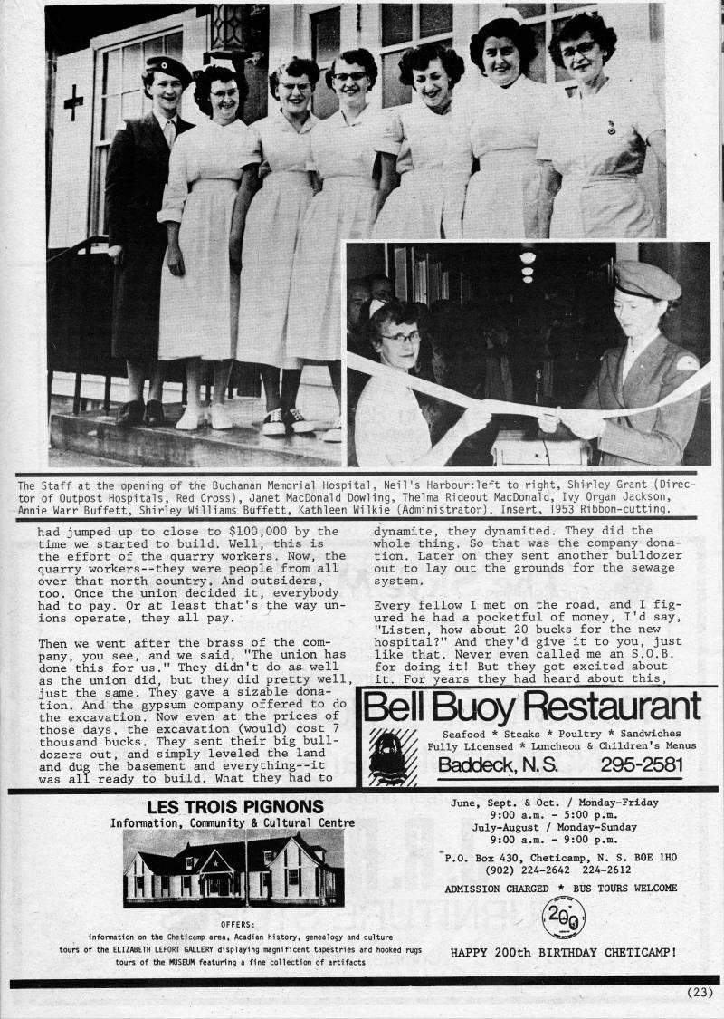 The Staff at the opening of the Buchanan Memorial Hospital, Neil's Harbour:left to right, Shirley Grant (Direc? tor of Outpost Hospitals, Red Cross), Janet MacDonald Dowling, Thelma Rideout MacDonald, Ivy Organ Jackson, Annie Warr Buffett, Shirley Williams Buffett, Kathleen Wilkie (Administrator). Insert, 1953 Ribbon-cutting. had jumped up to close to $100,000 by the time we started to build. Well, this is the effort of the quarry workers. Now, the quarry workers--they were people from all over that north country. And outsiders, too. Once the union decided it, everybody had to pay. Or at least that's the way un? ions operate, they all pay. Then we went after the brass of the com? pany, you see, and we said, "The union has done this for us." They didn't do as well as the union did, but they did pretty well, just the same. They gave a sizable dona? tion. And the gypsum company offered to do the excavation. Now even at the prices of those days, the excavation (would) cost 7 thousand bucks. They sent their big bull? dozers out, and simply leveled the land and dug the basement and everything--it was all ready to build. What they had to dynamite, they dynamited. They did the whole thing. So that was the company dona? tion. Later on they sent another bulldozer out to lay out the grounds for the sewage system. Every fellow I met on the road, and I fig? ured he had a pocketful of money, I'd say, "Listen, how about 20 bucks for the new hospital?" And they'd give it to you, just like that. Never even called me an S.O.B. for doing it! But they got excited about it. For years they had heard about this. Bell Buoy Restaurant Seafood * Steaks * Poultry * Sandwiches Fully Licensed * Luncheon & Children's Menus Baddeck, N.a 295-2581 LES TROiS PIGNONS Information, Community & Cultural Centre June, Sept. & Oct. / Monday-Friday 9:00 a.m. - 5:00 p.m. July-August / tfonday-Stinday 9:00 a.m. - 9:00 p.m. *P.O. Box 430, Cheticamp, N. S. BOE IHO (902) 224-2642 224-2612 ADMISSION CHARGED * BUS TOURS WELCOME OFFERS: information on the Cheticamp area, Acadian history, genealogy and culture tours of the ELIZABETH LEFORT GALLERY displaying magnificent tapestries and hooked rugs tours of the MUSEUM featuring a fine collection of artifacts HAPPY 200th BIRTHDAY CHETICAMP! (23)