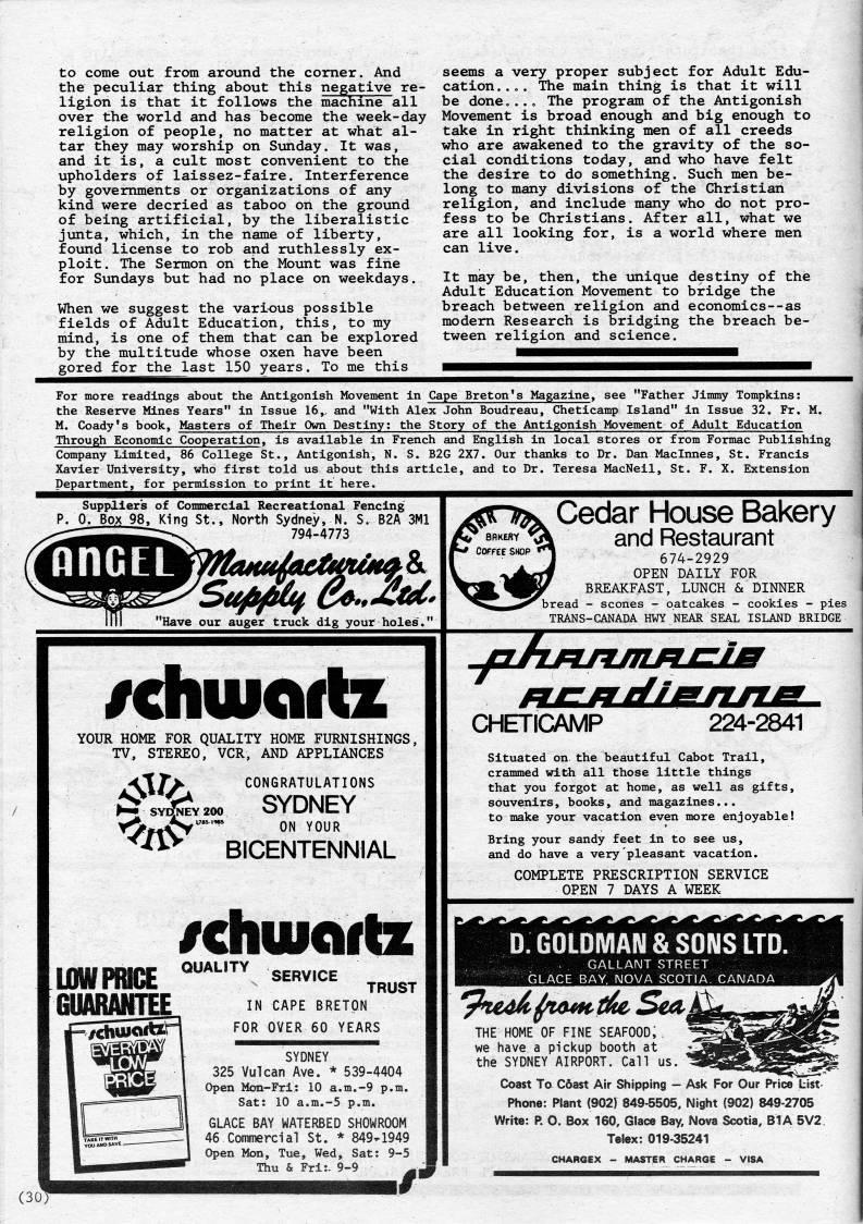 Published by Ronald Caplan on 1985/8/1 (483 reads)to come out from around the comer. And the peculiar thing about this negative re? ligion is that it follows the machine all over the world and has become the week-day religion of people, no matter at what al? tar they may worship on Sunday. It was, and it is, a cult most convenient to the upholders of laissez-faire. Interference by governments or organizations of any kind were decried as taboo on the ground of being artificial, by the liberalistic junta, which, in the name of liberty, found license to rob and ruthlessly ex? ploit. The Sermon on the Mount was fine for Sundays but had no place on weekdays. When we suggest the various possible fields of Adult Education, this, to my mind, is one of them that can be explored by the multitude whose oxen have been gored for the last 150 years. To me this seems a very proper subject for Adult Edu? cation.... The main thing is that it will be done,... The program of the Antigonish Movement is broad enough and big enough to take in right thinking men of all creeds who are awakened to the gravity of the so? cial conditions today, and who have felt the desire to do something. Such men be? long to many divisions of the Christian religion, and include many who do not pro? fess to be Christians. After all, what we are all looking for, is a world where men can live. It may be, then, the unique destiny of the Adult Education Movement to bridge the breach between religion and economics--as modem Research is bridging the breach be? tween religion and science. For more readings about the Antigonish Movement in Cape Breton's Magazine, see "Father Jimmy Tompkins: the Reserve Mines Years" in Issue 16,, and "With Alex John Boudreau, Cheticamp Island" in Issue 32. Fr. M. M. Coady's book. Masters of Their Own Destiny; the Story of the Antigonish Movement of Adult Education Through Economic Cooperation, is available in French and English in local stores or from Formac Publishing Company Limited, 86 College St., Antigonish, N. S. B2G 2X7. Our thanks to Dr. Dan Maclnnes, St. Francis Xavier University, who first told us about this article, and to Dr. Teresa MacNeil, St. F. X. Extension Department, for permission to print it here. ij. lis Suppliers of Commercial Recreational Fencing 0. Box 98, King St., North Sydney, N. S. B2A 3M1 794-4773 nnGEL 'Sufifiii' 'Have our auger truck dig your holes. Cedar House Bakery and Restaurant 674-2929 OPEN DAILY FOR BREAKFAST, LUNCH & DINNER bread - scones - oatcakes - cookies - pies TRANS-CANADA HWY NEAR SEAL ISLAND BRIDGE /chuiciflz YOUR HOME FOR QUALITY HOME FURNISHINGS, TV, STEREO, VCR, AND APPLIANCES -cT/> CONGRATULATIONS >'''..v' SYDNEY TJ'fJcy'""' ON YOUR '''' BICENTENNIAL /chuiciflz LOW PRICE GUARANTEE SERVICE QUALITY TRUST IN CAPE BRETON FOR OVER 60 YEARS (3 SYDNEY 325 Vulcan Ave. * 539-4404 Open Mon-Fri: 10 a.m.-9 p.m. Sat: 10 a.m.-5 p.m. GLACE BAY WATERBED SHOWROOM 46 Commercial St. * 849-1949 Open Mon, Tue, Wed, Sat: 9-5 Thu & Fri:. 9-9 ''p fUZJUilSIUlM- CHETICAMP '22A-2SA Situated on the beautiful Cabot Trail, crammed with all those little things that you forgot at home, as well as gifts, souvenirs, books, and magazines... to make your vacation even more enjoyable! Bring your sandy feet in to see us, and do have a very pleasant vacation. COMPLETE PRESCRIPTION SERVICE OPEN 7 DAYS A WEEK D. GOLDMAN & SONS LTD. . GALLANT STREET GLACE BAY, NOVA SCOTIA. THE HOME OF FINE SEAFOOD; . we have a pickup booth at the SYDNEY AIRPORT. Call us. Coast To C6ast Air Shipping • Ask For Our Price List- Phone: Plant (902) 849-5505, Night (902) 849-2705 Write: P. O. Box 160, Glace Bay, Nova Scotia, B1A 5V2 Telex: 019-35241 CHARGEX - MASTER CHARGE - VISA