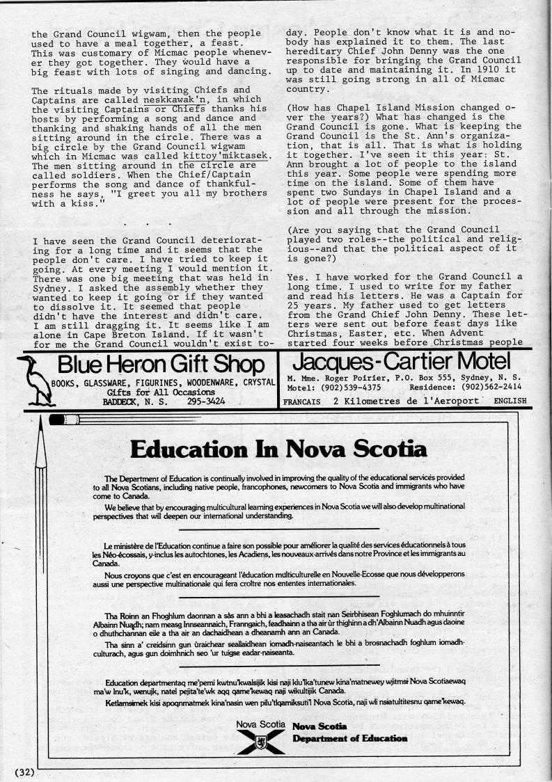 Published by Ronald Caplan on 1985/8/1 (836 reads)the Grand Council wigwam, then the people used to have a meal together, a feast. This was customary of Micmac people whenev? er they got together. They would have a big feast with lots of singing and dancing. The rituals made by visiting Chiefs and Captains are called neskkawak'n, in which the visiting Captains or Chiefs thanks his hosts by performing a song and dance and thanking and shaking hands of all the men sitting around in the circle. There was a big circle by the Grand Council wigwam which in Micmac was called kittoy'miktasek. The men sitting around in the circle are called soldiers. When the Chief/Captain performs the song and dance of thankful? ness he says, "I greet you all my brothers with a kiss." I have seen the Grand Council deteriorat? ing for a long time and it seems that the people don't care. I have tried to keep it going. At every meeting I would mention it. There was one big meeting that was held in Sydney. I asked the assembly whether they wanted to keep it going or if they wanted to dissolve it. It seemed that people didn't have the interest and didn't care. I am still dragging it. It seems like I am alone in Cape Breton Island. If it wasn't for me the Grand Council wouldn't exist to? day. People don't know what it is and no? body has explained it to them. The last hereditary Chief John Denny was the one responsible for bringing the Grand Council up to date and maintaining it. In 1910 it was still going strong in all of Micmac country. (How has Chapel Island Mission changed o- ver the years?) What has changed is the Grand Council is gone. What is keeping the Grand Council is the St. Ann's organiza? tion, that is all. That is what is holding it together. I've seen it this year: St. Ann brought a lot of people to the island this year. Some people were spending more time on the island. Some of them have spent two Sundays in Chapel Island and a lot of people were present for the proces? sion and all through the mission. (Are you saying that the Grand Council played two roles--the political and relig- ious--and that the political aspect of it is gone?) Yes. I have worked for the Grand Council a long time. I used to write for my father and read his letters. He was a Captain for 25 years. My father used to get letters from the Grand Chief John Denny. These let? ters were sent out before feast days like Christmas, Easter, etc. When Advent started four weeks before Christmas people 7, Blue Heron Gift Shop VbOOKS, GLASSWARE, FIGURINES, WOODENWARE, CRYSTAL fw Gifts for All Occasions BADDEX3C, N. S. 295-3424 Jacques-Cartier Motel M. Mme. Roger Poirier, P.O. Box 555, Sydney, N. S. Motel: (902)539-4375 Residence: (902)562-2414 FRANCAIS 2 Kilometres de I'Aeroport" ENGLISH (32) Education bi Nova Scotia The Department of Education is continually involved in improving the quality of the educational services provided to all Nova Scotians, including native people, francophones, newcomers to Nova Scotia and immigrants who have come to Canada. Wc believe that by encoura'ng multicultural learning experiences in Nova Scotia we will also develop multinational perspectives that will deepen our international understanding. Le minist'e de I'Education continue a faire son possible pour am'lbrer la quality des services 6ducationrvels h tous les N6o-'ossais, y-inclus les autochtones, les Acadiens, les nouveaux-arriv's dans notre Province et les immigrants au Canada. Nous croyons que c'est en encourageant I'Education mdticulturelle en Nouvellc-Ecosse que nous d'velopperons aussi une perspective multinationale qui fera croftre nos ententes Internationales. Tha Roinn an Fhoghlum daonnan a s' arm a bhi a leasachadh stait nan Seirbhisean Foghlumach do mhuinntir Albainn Nucjflh; nam mcasg Innseanr?ich, Franngaich, feadhainn a tha air ixr thighinn a dh'Aibainn Nuadh agus daoine o dhuthchannan eile a tha air an dachaidhcan a dheanamh ann an Canada. Tha Sinn a' creidsinn gun Clraichear seallaidhean iomadh-naiseantaich le bhi a brosnachadh foghlum iomadh- culturach, agus gun doimhnich seo 'ur tuigse eadar-naiseanta. Education departmentaq me'pemi kwinultwalsijik kisi naji kluTka'tunew kina'matnewey w)itm?? Nova Scotiaewaq ma'w Inult, wenujk, natel pejita'te'wk aqq qameTtewaq naji wikultijik Canada. Ketlamamek kia apoqnmatmek kina'naan wen pilu'tlqamiksutiT Nova Scotia, naji wK nsiatultitesnu qamcTtewaq. Nova Scotia NovaScotia Department off EdncatioB
