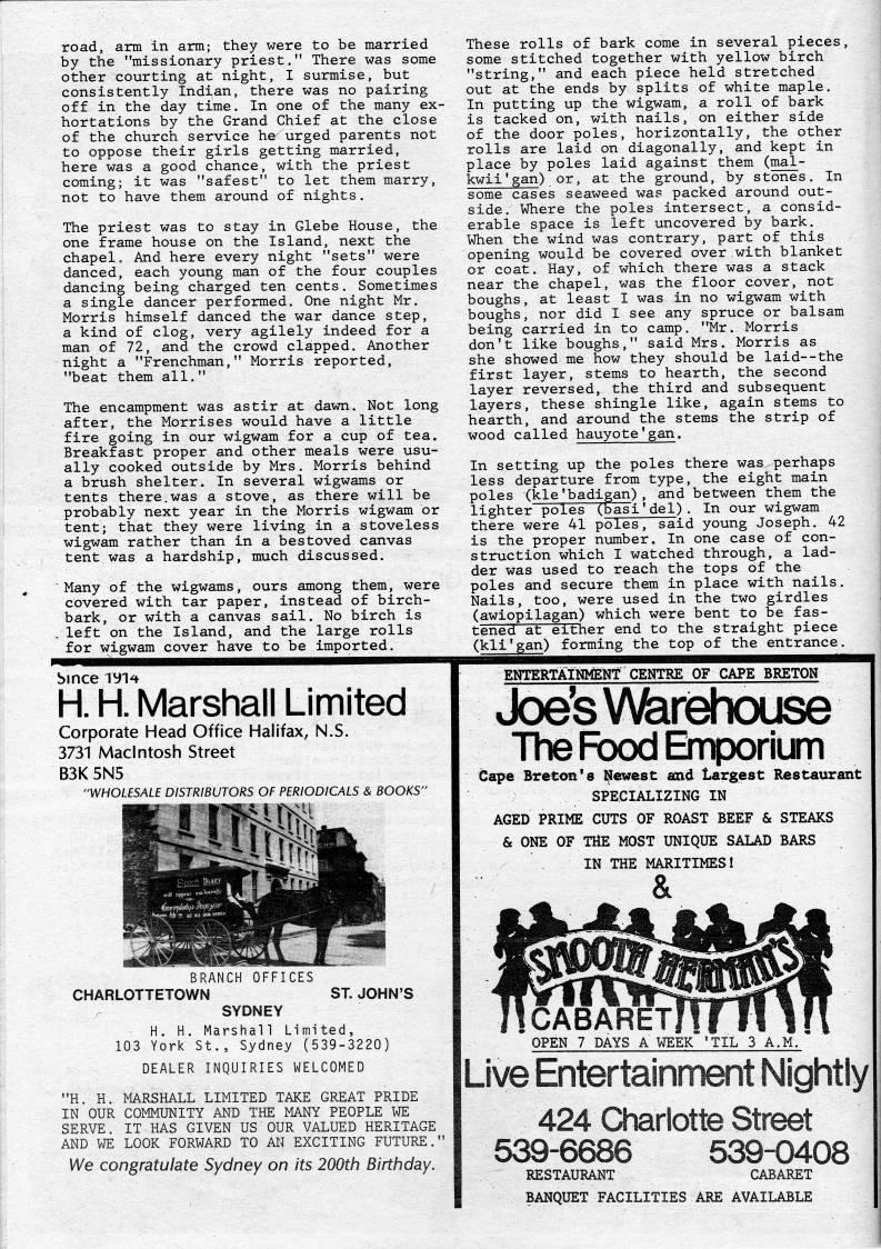 Published by Ronald Caplan on 1985/8/1 (371 reads)road, arm in arm; they were to be married by the "missionary priest." There was some other courting at night, I surmise, but consistently Indian, there was no pairing off in the day time. In one of the many ex? hortations by the Grand Chief at the close of the church service he urged parents not to oppose their girls getting married, here was a good chance, with the priest coming; it was "safest" to let them marry, not to have them around of nights. The priest was to stay in Glebe House, the one frame house on the Island, next the chapel. And here every night "sets" were danced, each young man of the four couples dancing being charged ten cents. Sometimes a single dancer performed. One night Mr. Morris himself danced the war dance step, a kind of clog, very agilely indeed for a man of 72, and the crowd clapped. Another night a "Frenchman," Morris reported, "beat them all." The encampment was astir at dawn. Not long after, the Morrises would have a little fire going in our wigwam for a cup of tea. Breakfast proper and other meals were usu? ally cooked outside by Mrs. Morris behind a brush shelter. In several wigwams or tents there.was a stove, as there will be probably next year in the Morris wigwam or tent; that they were living in a stoveless wigwam rather than in a bestoved canvas tent was a hardship, much discussed. " Many of the wigwams, ours among them, were covered with tar paper, instead of birch- bark, or with a canvas sail. No birch is .left on the Island, and the large rolls for wigwam cover have to be imported. These rolls of bark come in several pieces, some stitched together with yellow birch "string," and each piece held stretched out at the ends by splits of white maple. In putting up the wigwam, a roll of bark is tacked on, with nails, on either side of the door poles, horizontally, the other rolls are laid on diagonally, and kept in place by poles laid against them (mal- kwii'gan) or, at the ground, by stones. In some cases seaweed was packed around out? side. Where the poles intersect, a consid? erable space is left uncovered by bark. When the wind was contrary, part of this opening would be covered over with blanket or coat. Hay, of which there was a stack near the chapel, was the floor cover, not boughs, at least I was in no wigwam with boughs, nor did I see any spruce or balsam being carried in to camp. "Mr. Morris don't like boughs," said Mrs. Morris as she showed me how they should be laid--the first layer, stems to hearth, the second layer reversed, the third and subsequent layers, these shingle like, again stems to hearth, and around the stems the strip of wood called hauyote'gan. In setting up the poles there was perhaps less departure from type, the eight main poles (kle'badigan), and between them the lighter poles (basi'del). In our wigwam there were 41 poles, said young Joseph. 42 is the proper number. In one case of con? struction which I watched through, a lad? der was used to reach the tops of the poles and secure them in place with nails. Nails, too, were used in the two girdles (awiopilagan) which were bent to be fas- tened at either end to the straight piece (kli'gan) forming the top of the entrance. Since iyi' H. H. Marshall Limited Corporate Head Office Halifax, N.S. 3731 Macintosh Street B3K 5N5 "WHOLESALE DISTRIBUTORS OF PERIODICALS & BOOKS" BRANCH OFFICES CHARLOTTETOWN ST. JOHN'S SYDNEY H. H. Marshall Limited, 103 York St., Sydney (539-3220) DEALER INQUIRIES WELCOMED "H. H. MARSHALL LIMITED TAKE GREAT PRIDE IN OUR COMMUNITY AND THE MANY PEOPLE WE SERVE. IT HAS GIVEN US OUR VALUED HERITAGE AND WE LOOK FORWARD TO AN EXCITING FUTURE." We congratulate Sydney on its 200th Birthday. ENTERTAINtffiNt CENTRE OF CAPE BRETON Joe's Wfeirehouse The Food Emporium Cape Breton's l'ewest sax' Largest Restaurant SPECIALIZING IN AGED PRIME CUTS OF ROAST BEEF & STEAKS & ONE OF THE MOST UNIQUE SALAD BARS IN THE MARITIMESl tCABARErnr OPEN 7 DAYS A WEEK 'TIL 3 A.M. Live Entertainment Nightly 424 Charlotte street 539-6686 539-0408 RESTAURANT CABARET BANQUET FACILITIES ARE AVAILABLE